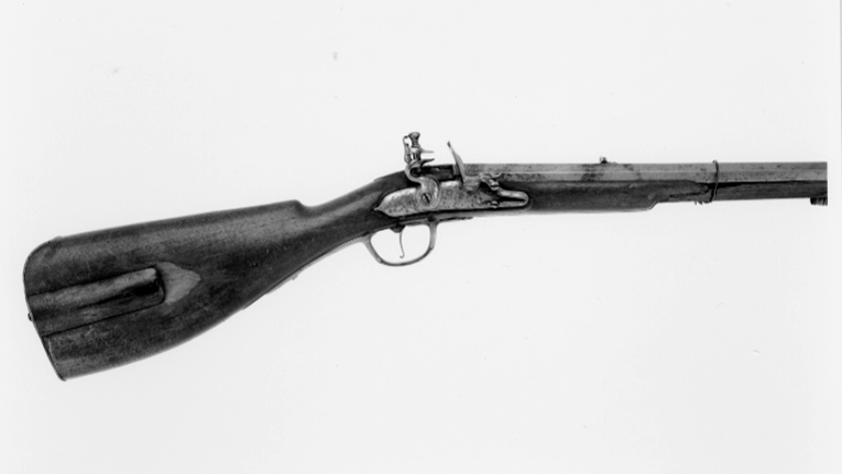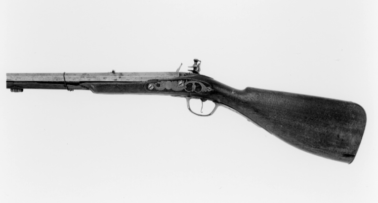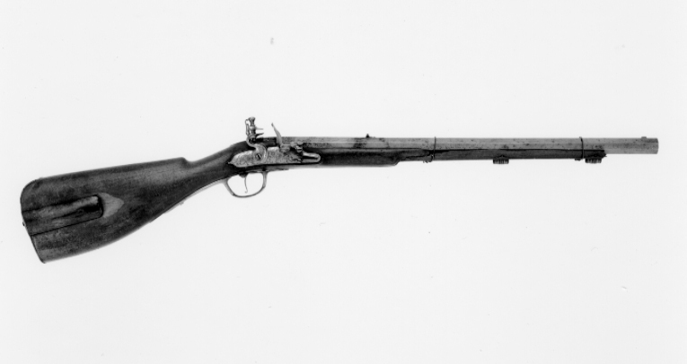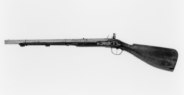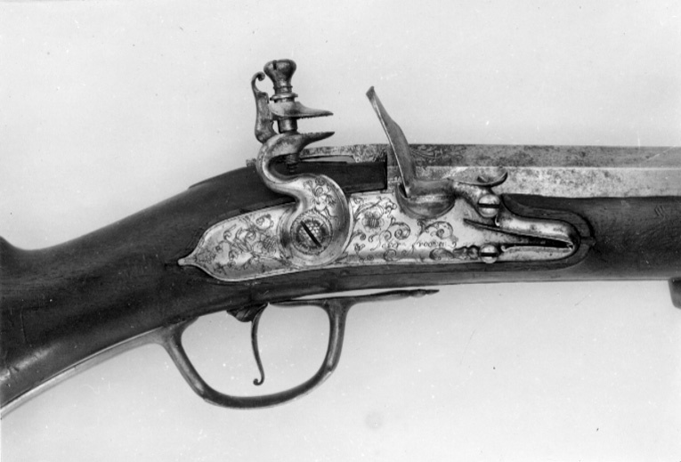 Åttsidig pipa av stål med 4 räfflor, bombredd 5,5 mm. Graverade blad vid mynningen, över kammaren och på svansskruvbladet fina rankor, tre fåglar, framför siktet en fransk lilja. Riktmedel: Njurformigt ståndsikte av stål, inlaxat stolpkorn av mässing. Fästning: Pipan fäst med krysskruv samt ursprungligen två pipstift, båda saknas. Flintlås av stål med välvt låsbleck, hane och batteri. Hane med lös överkäke, hanskruven rutigt graverad, däromkring en orm med blommor i gapet. Batteri med rundat eldstål med åsad rygg, stötklack med knopp. På låsblecket fint graverade rankor, kantlinjer och signatur: "Peter Froomen". Fästning och avtryckare: Två låsskruvar. Avtryckare med bakåt-uppåtböjd ände. Brun helstock med kolv av fransk typ utan kindläge, på h. sida kolvlåda med välvt lock av trä. Kolvlängd 283 mm. Snidad kant runt lås-, sidbleck, svansskruvblad samt laddstocksränna. Beslag av mässing. Bakplåt fäst med tre skruvar (en graverad), lång, spetsig tunga med graverade "fjäll". Genombrutet, graverat sidbleck i form av en grotesk figur, en orm samt två bevingade varelser, som mellan sig håller en slät, rundad platta. Två profilerade rörkor, spetsrörkan saknas. Skålformig varbygel med tunt, graverat bladkors på bygeln, lång,välvd bakre arm med skruv, kortare främre arm med balusterkontur.
