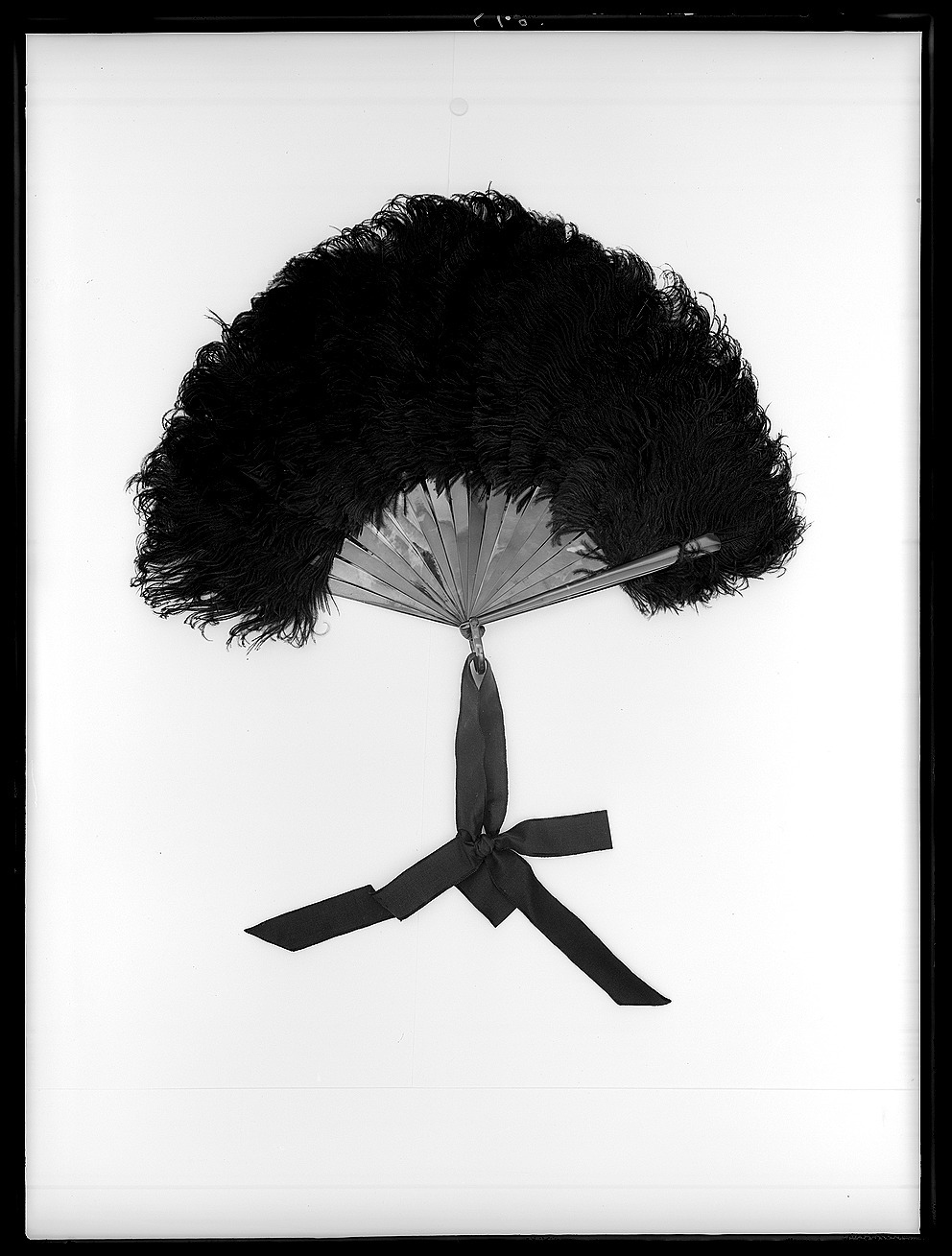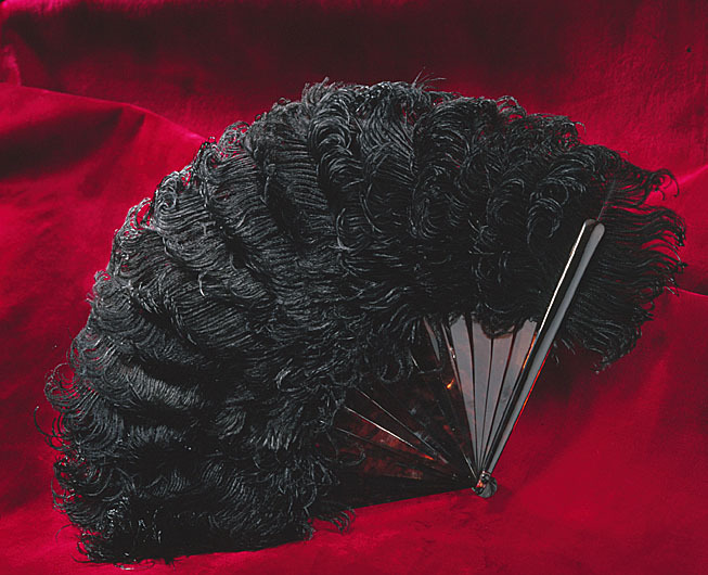 Stomme i form av arton blad av sköldpadd, på bladen fäst svarta strutsfjädrar, ca 140 mm höga. Bladen nertill ihopfästade med stålstift, därpå fäst bygel av sköldpadd. I bygelnfäst ett svart sidenripsband, b: 22 mm, knutet i rosett, snedskurnabandändar. Drottningen har möjligen använt solfjädern efter Oskar II:s död 1907 med tanke på dess svarta färg.