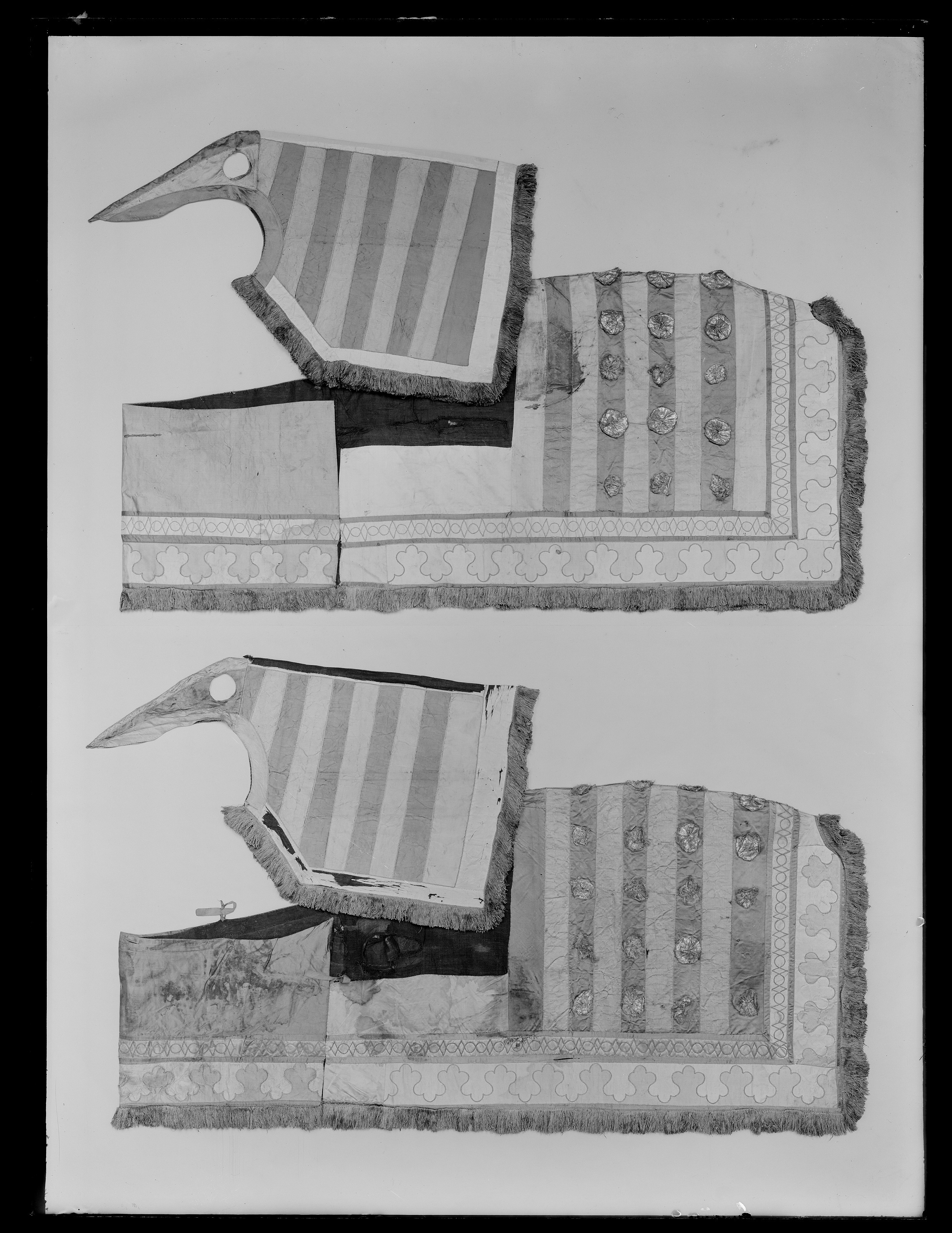12 st Tornere Täcken af åthskillige fergor Atlask medh breda Slickes franssar om kring och täckerne uthskurne Atlaskeblommor, stickat medh litzquardh omkring kanterne, och består huartera täcket uti her opnembde stycken Nembl: ett st som brukas på Hästelenderna och der widh fast satt bröststycke, En Halskappa, ett Ridderskiört som brukas kring lijfwet på Karn, 11 af dessa täcken kosta huartera 100 D:r S:r m:t