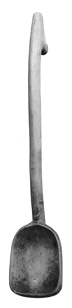 SLEV av asp. Blad avlångt, skåligt, med raka sidokanter och något bågformig ytterände, inre änden på båda kanter avrundad mot skaftet. Skaft långt och något bågformigt uppsvänt, med ovalt tvärsnitt; på ytterändens undersida en från skaftet utspard kort hake. Längd: 48 cm. Blad, bredd: 9.9 cm.