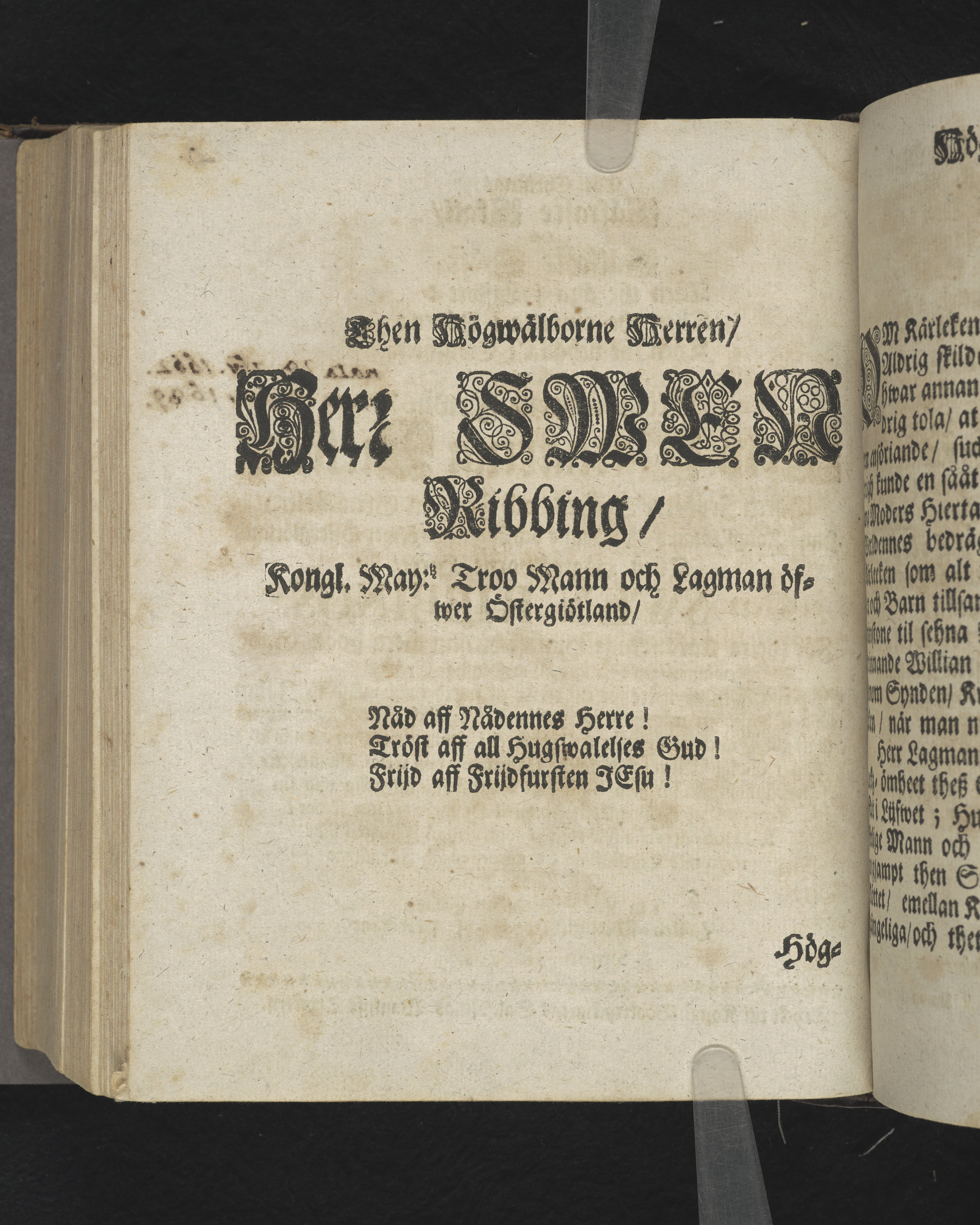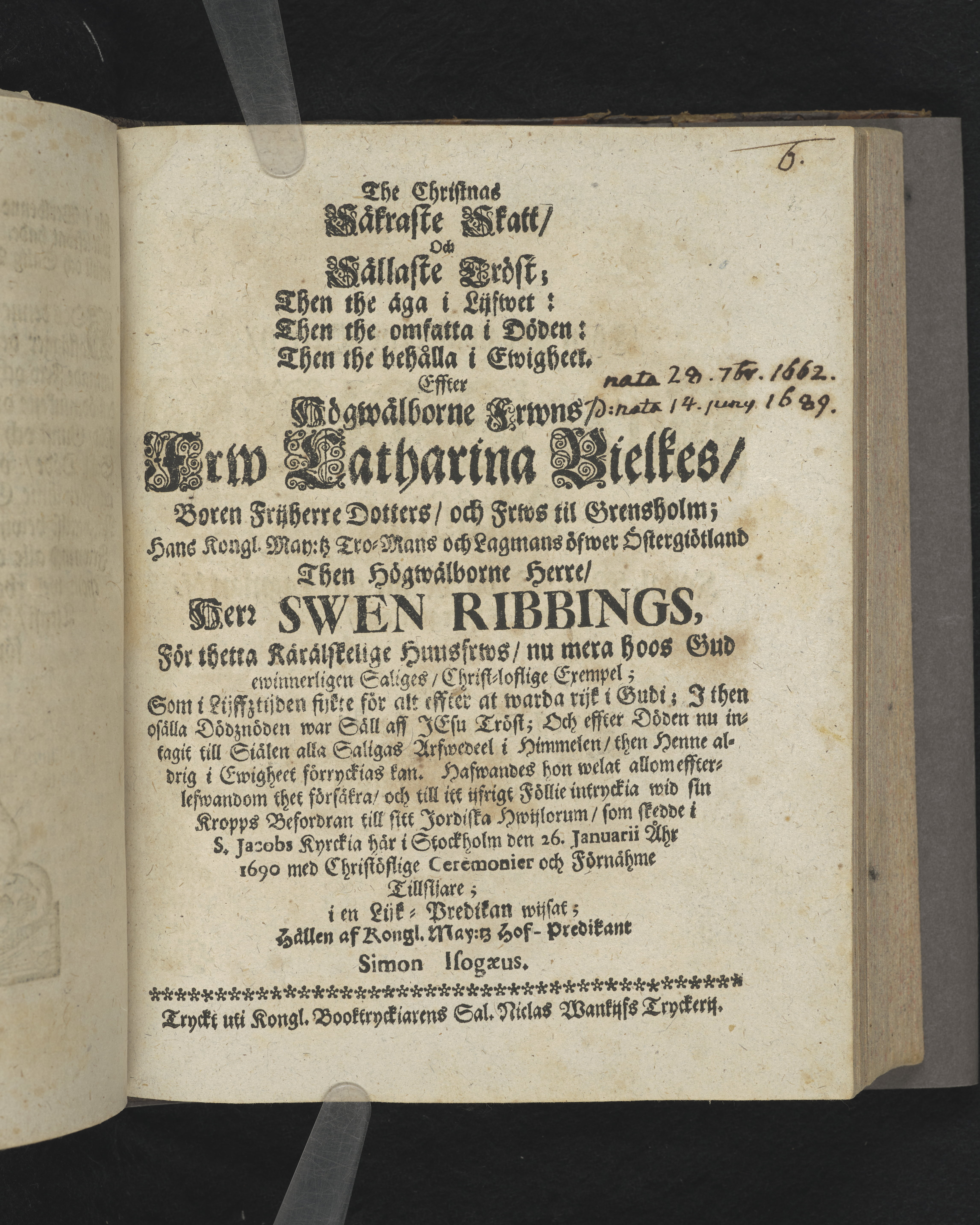 The christnas säkraste skatt, och sällaste tröst... effter... Fru Catharina Bielkes, boren frijherre dotters, och frws til Grensholm... Hans Kongl. May:tz tro-mans och lagmans öfwer Östergötland... Herr Swen Ribbings, för thetta kärälskeliga huusfrws... christ-loflige exempel... wid sin kropps befordran till sitt jordiska hwijlorum, som skedde i S. Jacobs kyrkia här i Stockholm den 26. Januarii åhr 1690... i en lijk-predikan wijsat; Hållen af... Simon Isogæus. Tryckt uti kongl. booktryckiarens sal. Niclas Wankijffs tryckerij.