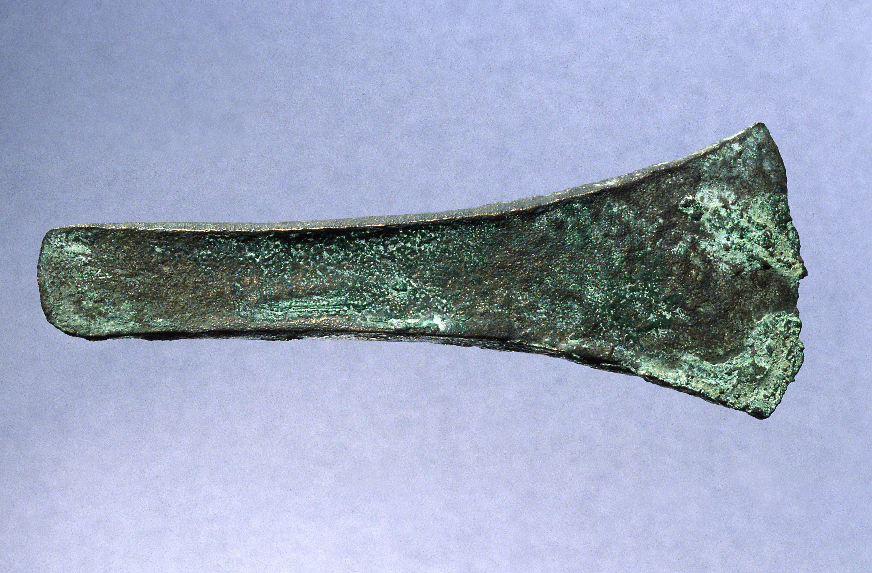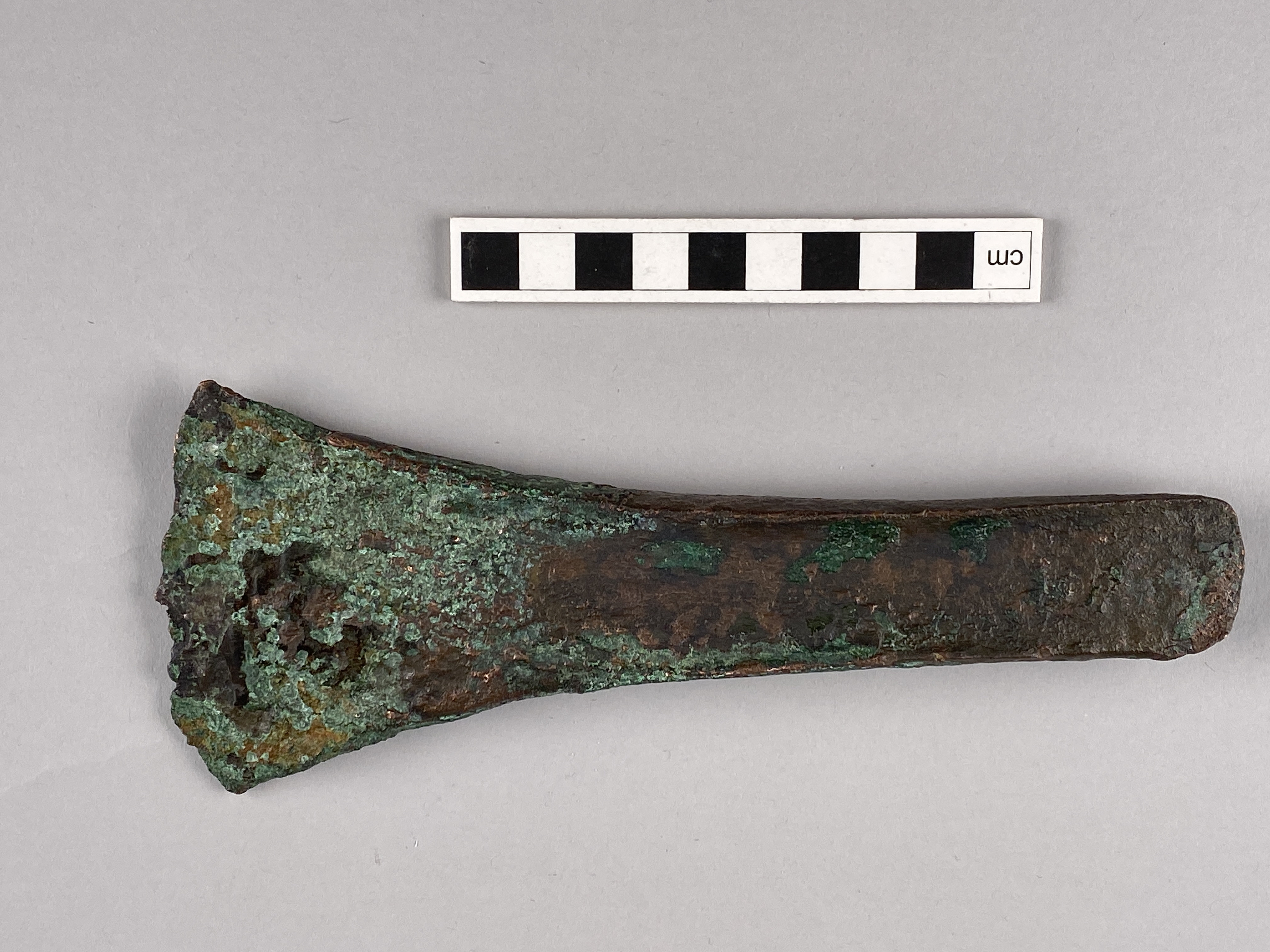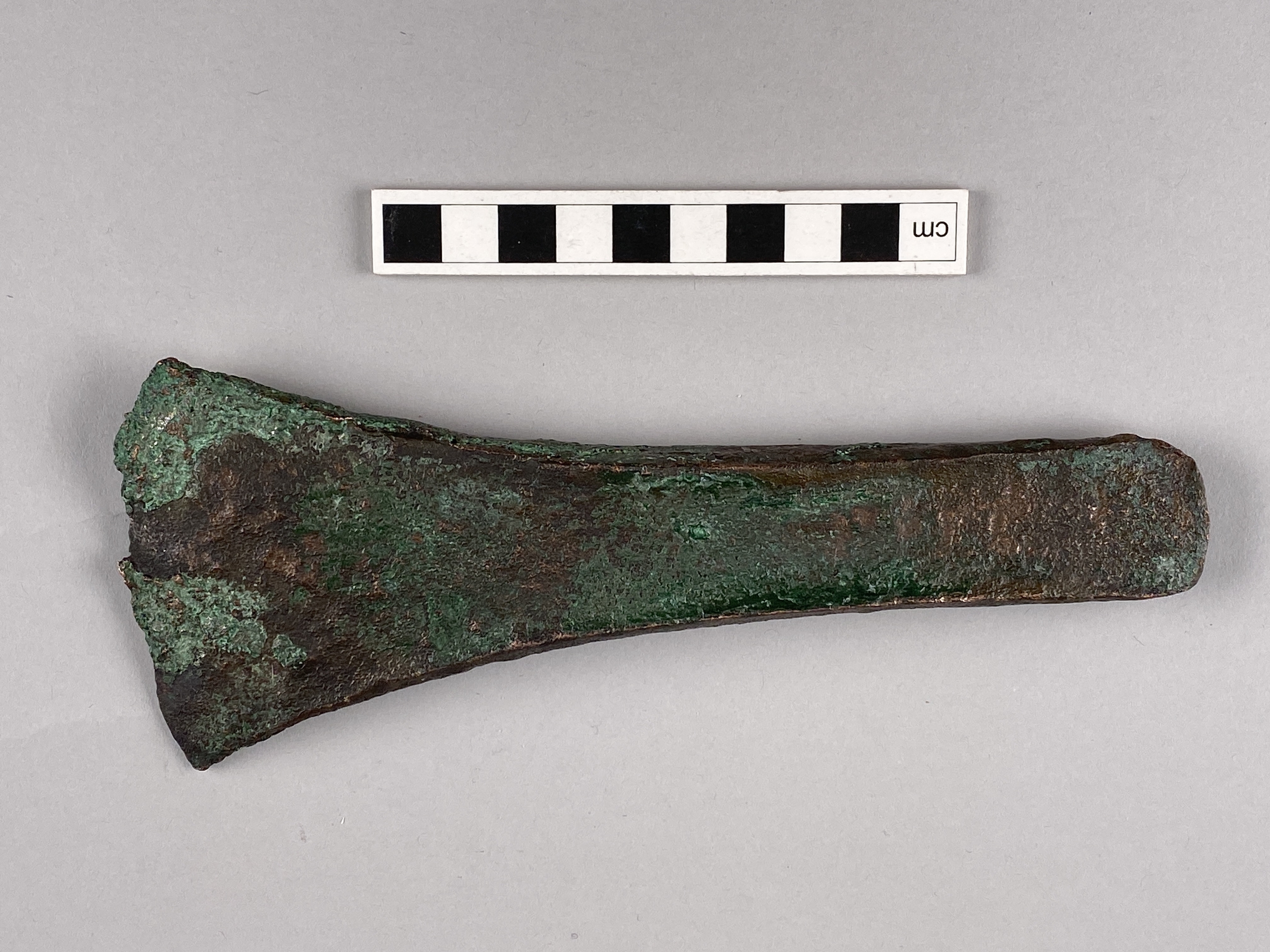 Kantyxa av brons med mycket svagt utvecklade kanter.
