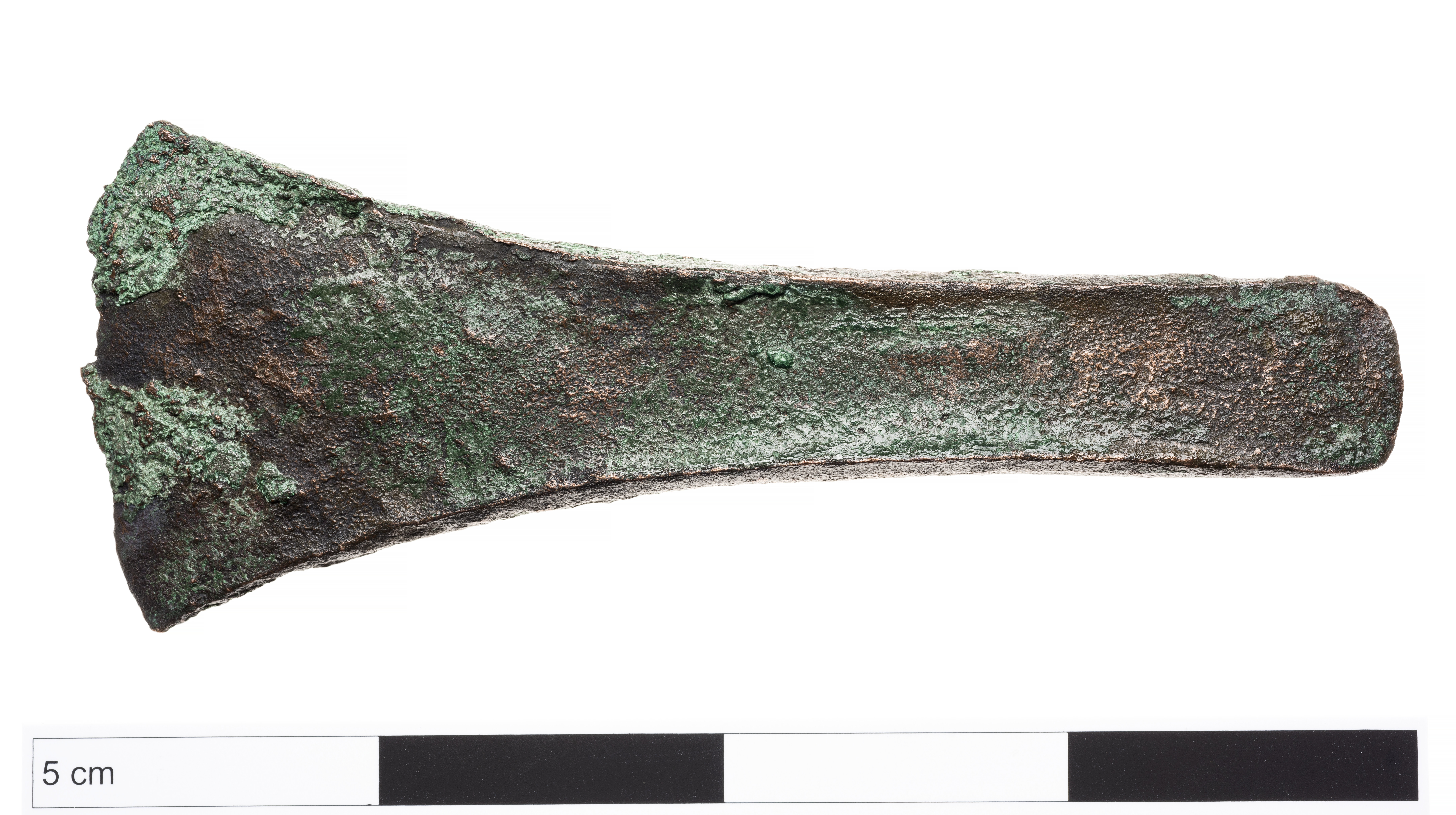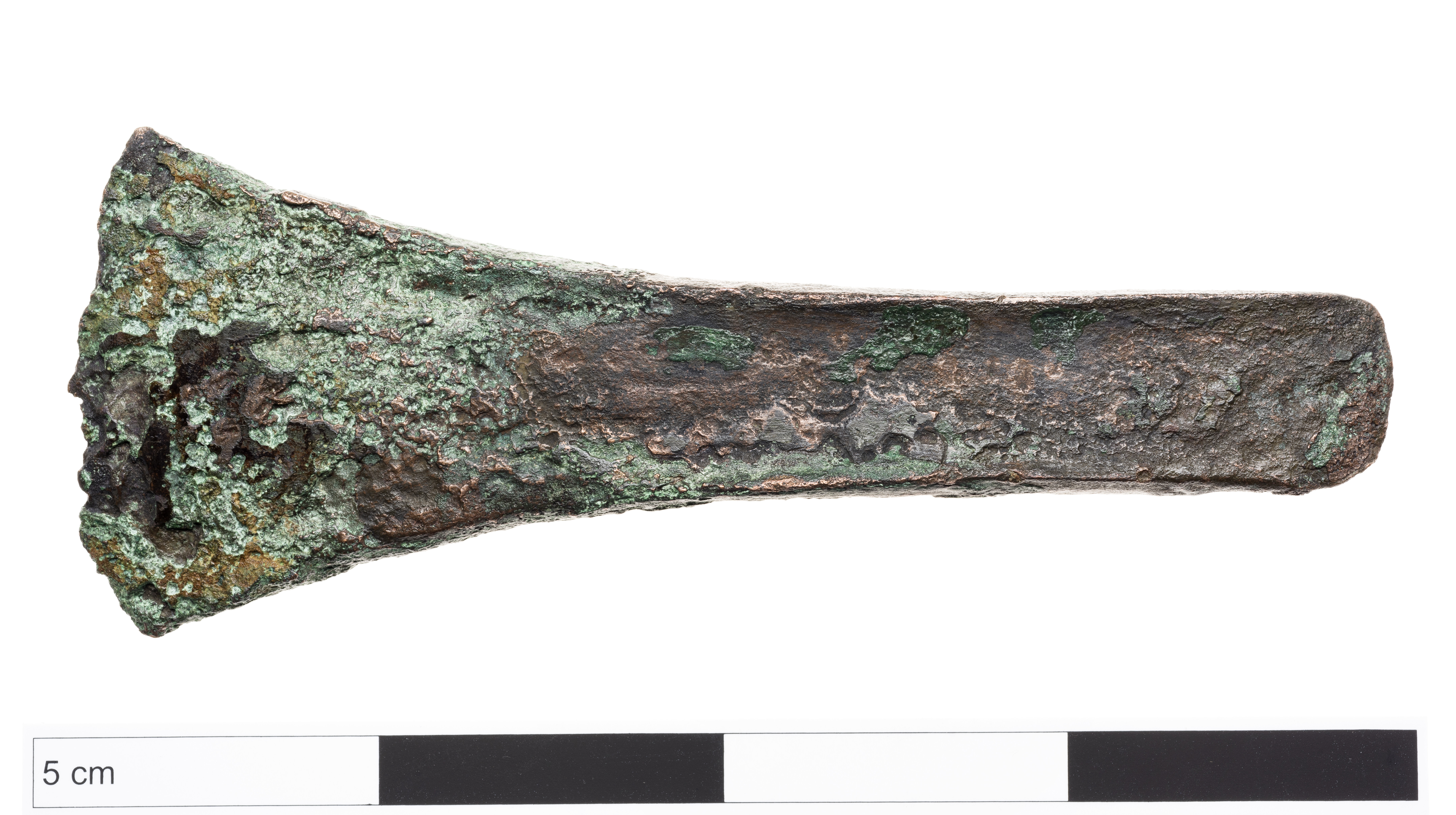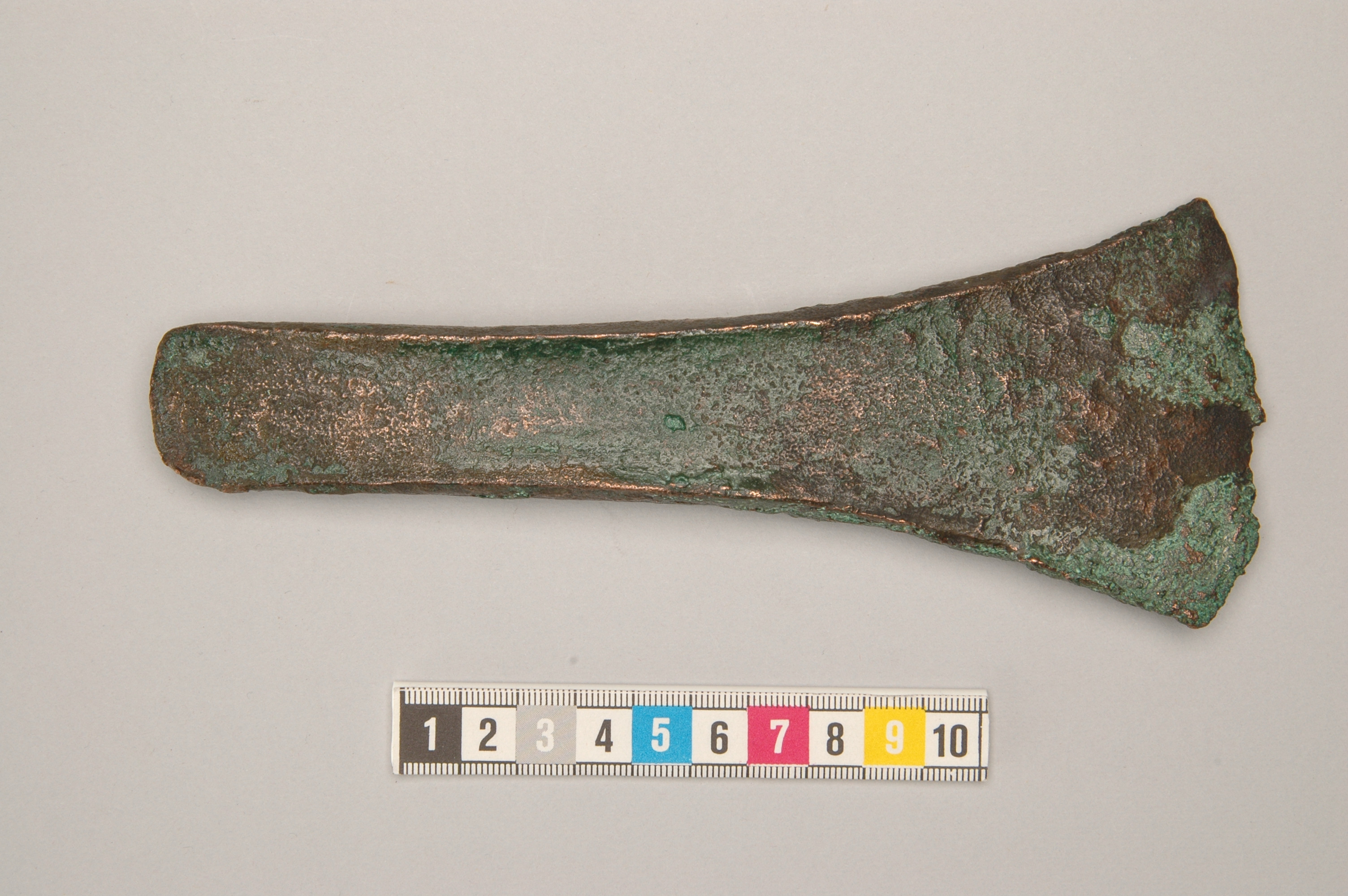 Kantyxa av brons med mycket svagt utvecklade kanter.