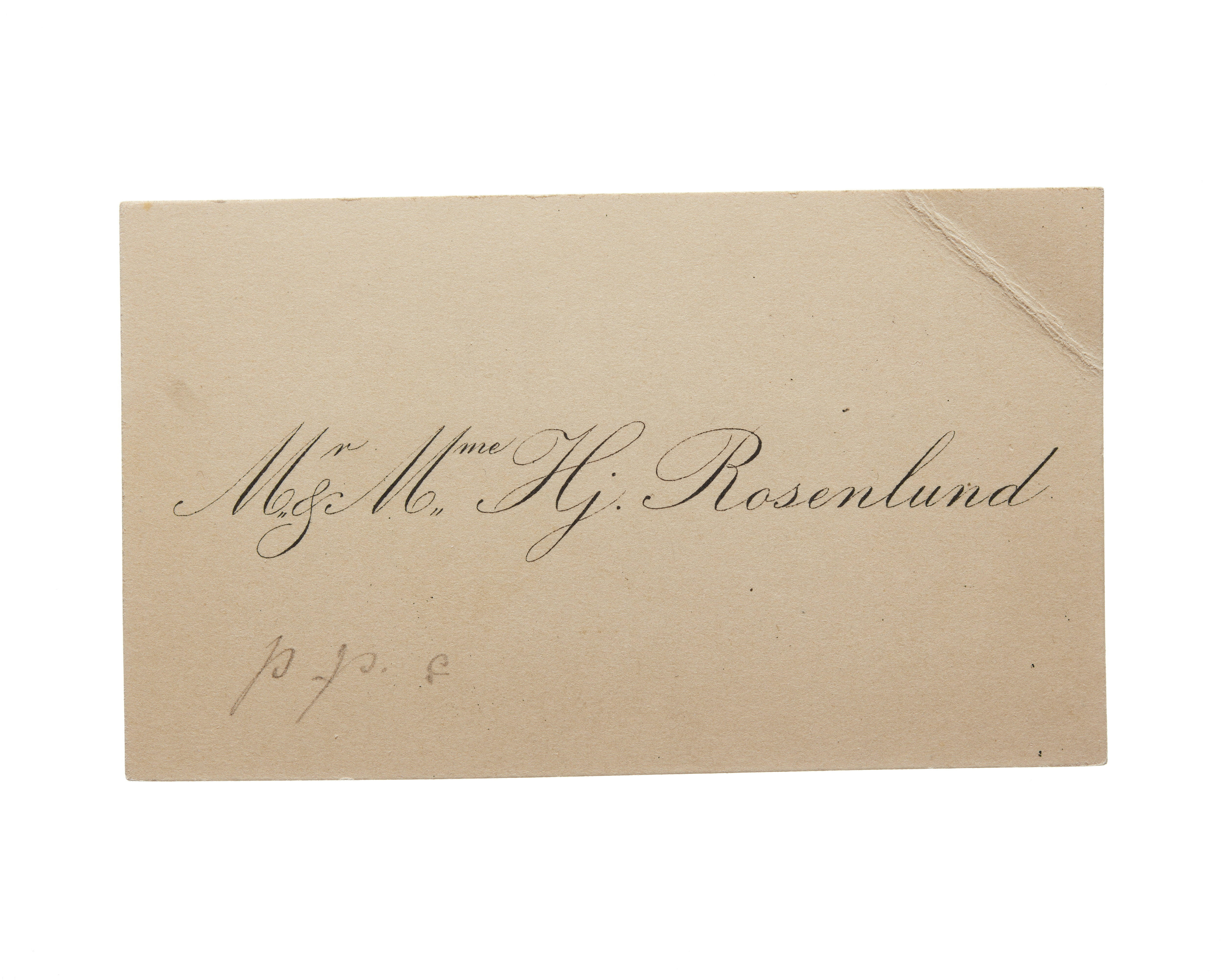 Ett visitkort från Mr & Mme Hjalmar Rosenlund, utan datum, vikt i övre högra hörnet. Handskrift "p. p. c."