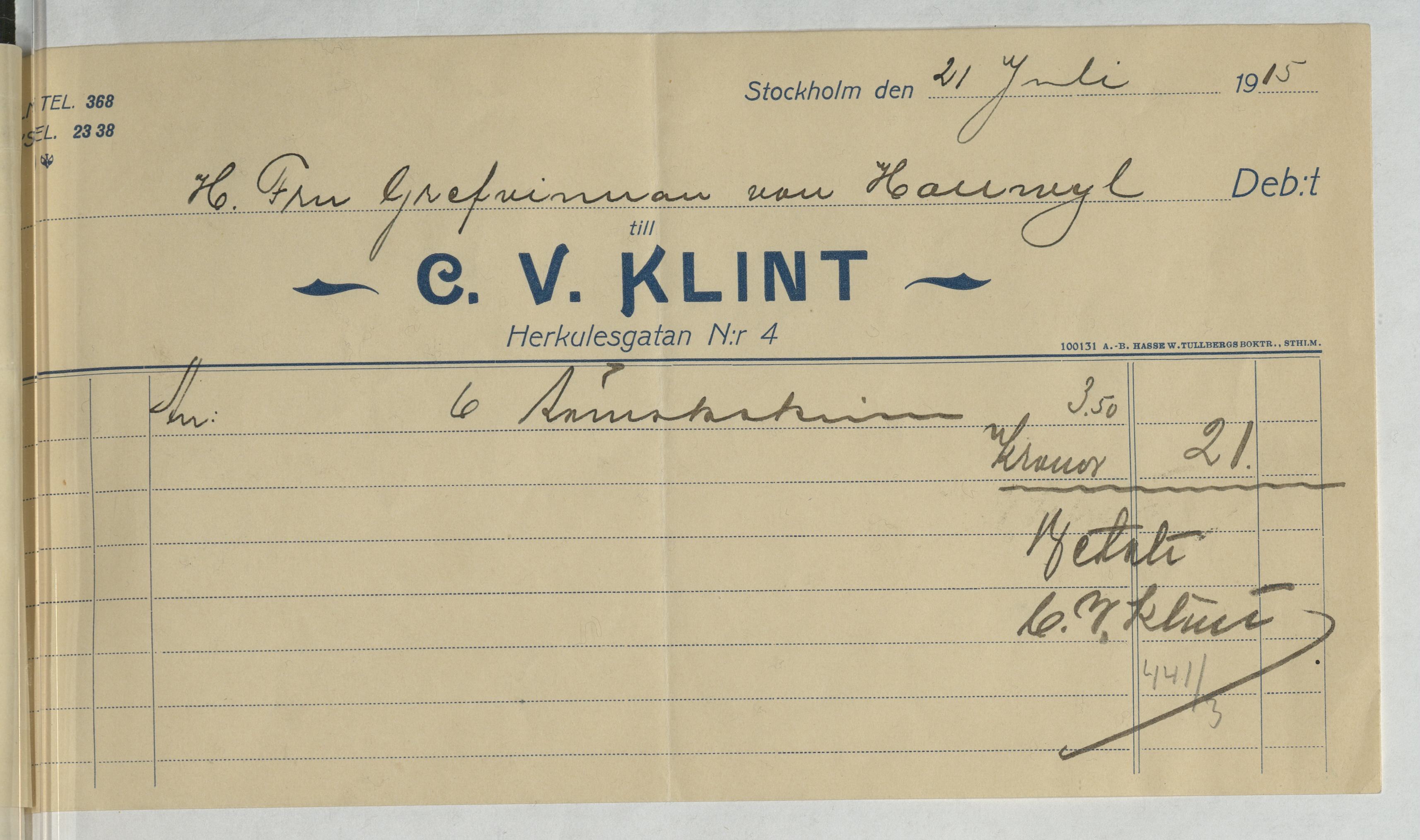 Kvitto från C. V. Klint
