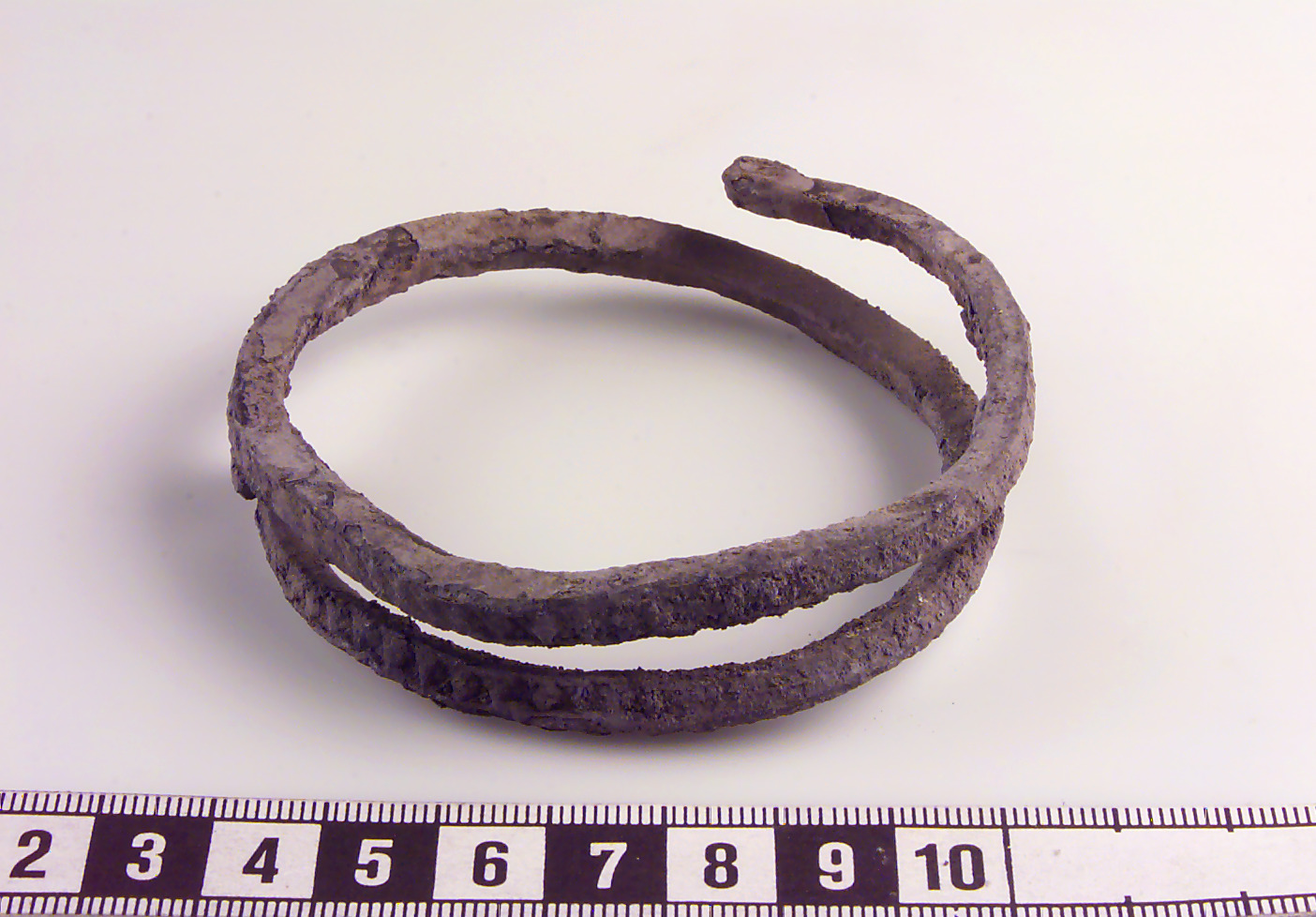 Spirallagd av ten med närmast kvadratiskt tvärsnitt. Upprullade ändar. Kraftigt korroderat ytskikt. Ornerad med motställda trianglar i rader.