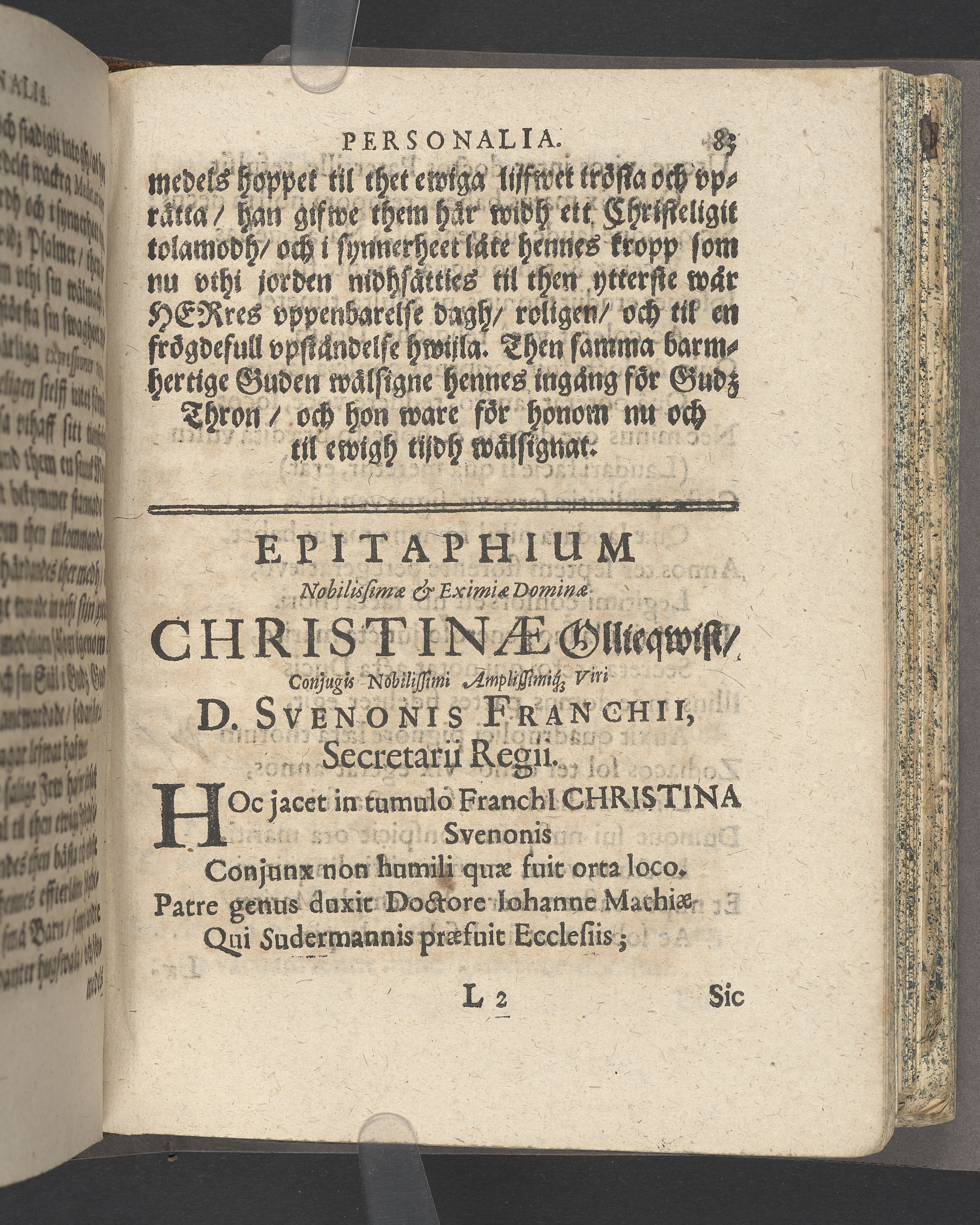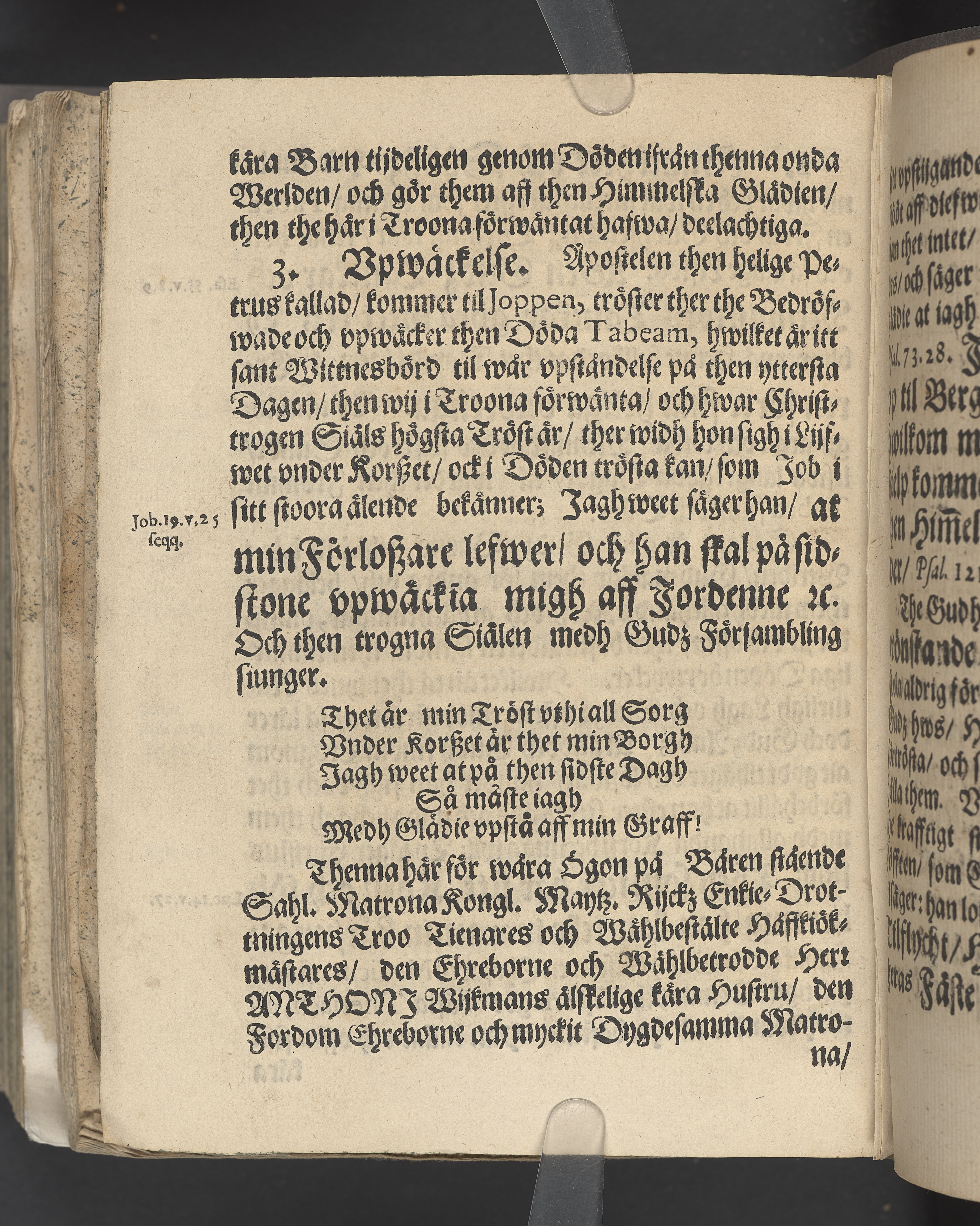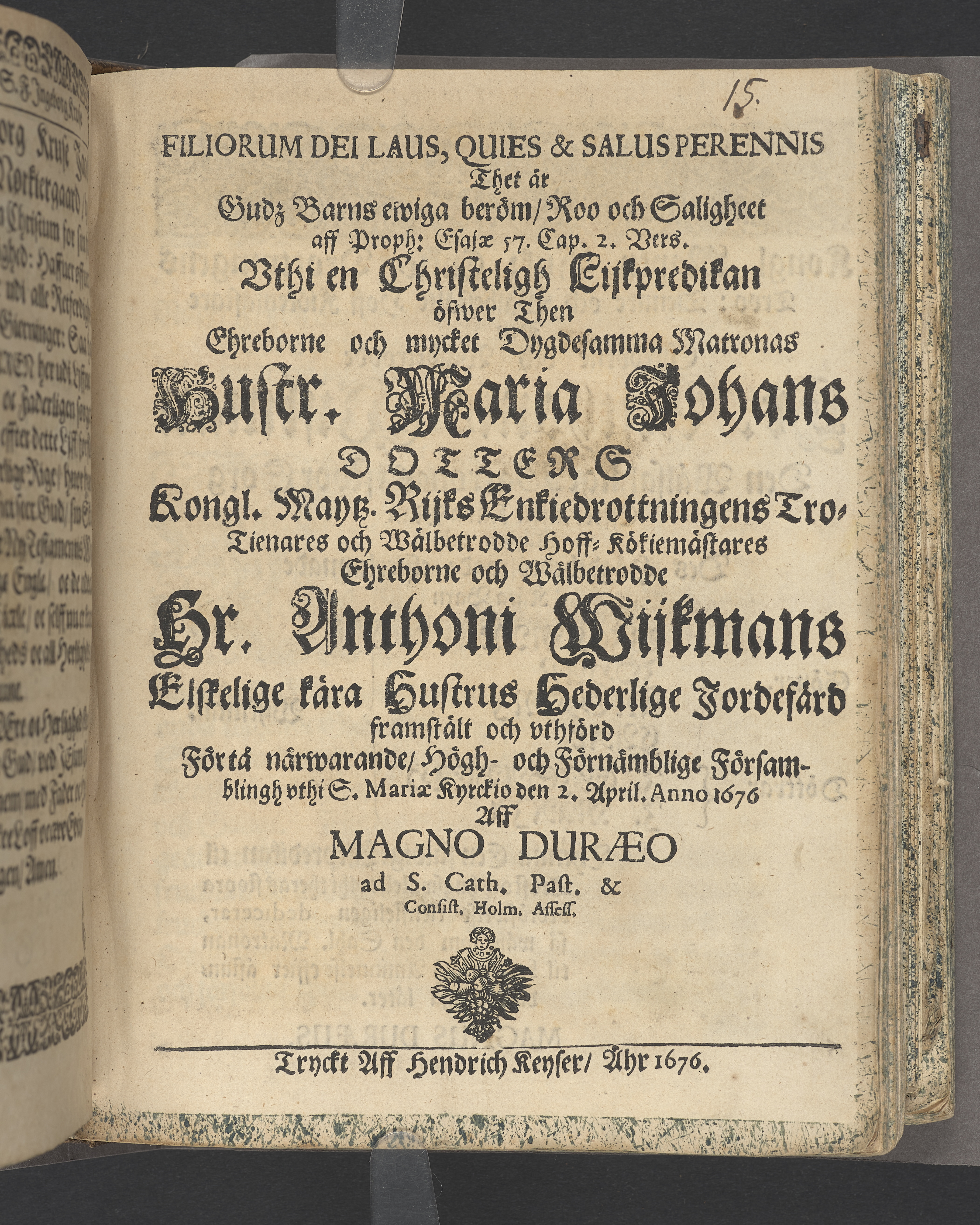 Filiorum dei laus, quies & salusperennis thet är Gudz barns ewiga beröm, roo och saligheet ... vthi en christeligh lijkpredikan öfwer then ehreborne och mycket dygdesamma matronas hustr. Maria Johans dotters kongl. maytz. rijks enkiedrottningens trotienares och wälbetrodde hoff-kökiemästares ehreborne och wälbetrodde hr Anthoni Wijkmans elskelige kära hustrus hederlige jordefärd framstält och vthförd förtå närwarande, högh- och förnämblige församblingh vthi S. Mariæ kyrckio den 2. april. anno 1676 aff Magno Duræo ...