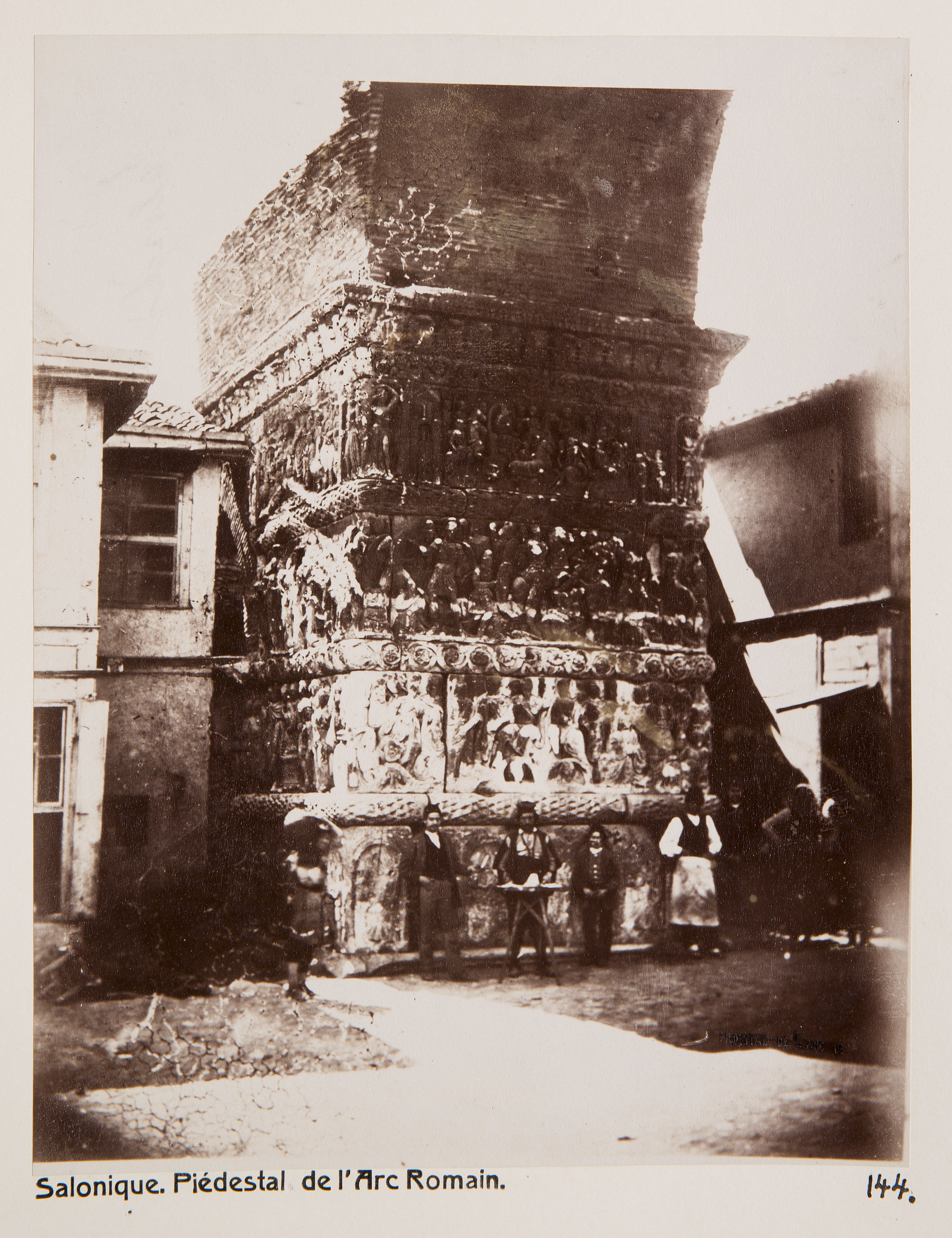 Del av Galerius triumfbåge i Thessaloniki, Grekland. Text på originalet: Salonique. Piédestal de l'Arc Romain. Foto från resa genom Grekland, Makedonien och Serbien, 15 mars-6 juni 1896. Fotografierna LXVI:K.18.-147. är köpta av Wilhelmina von Hallwyl, f. Kempe på Korfu samt i Patras, Nafplion, Aten, Thessaloniki och Belgrad. Med på resan var maken Walther von Hallwyl och fröken Ida Uhse. Uppgifterna kommer från Ida Uhses reseanteckningar.