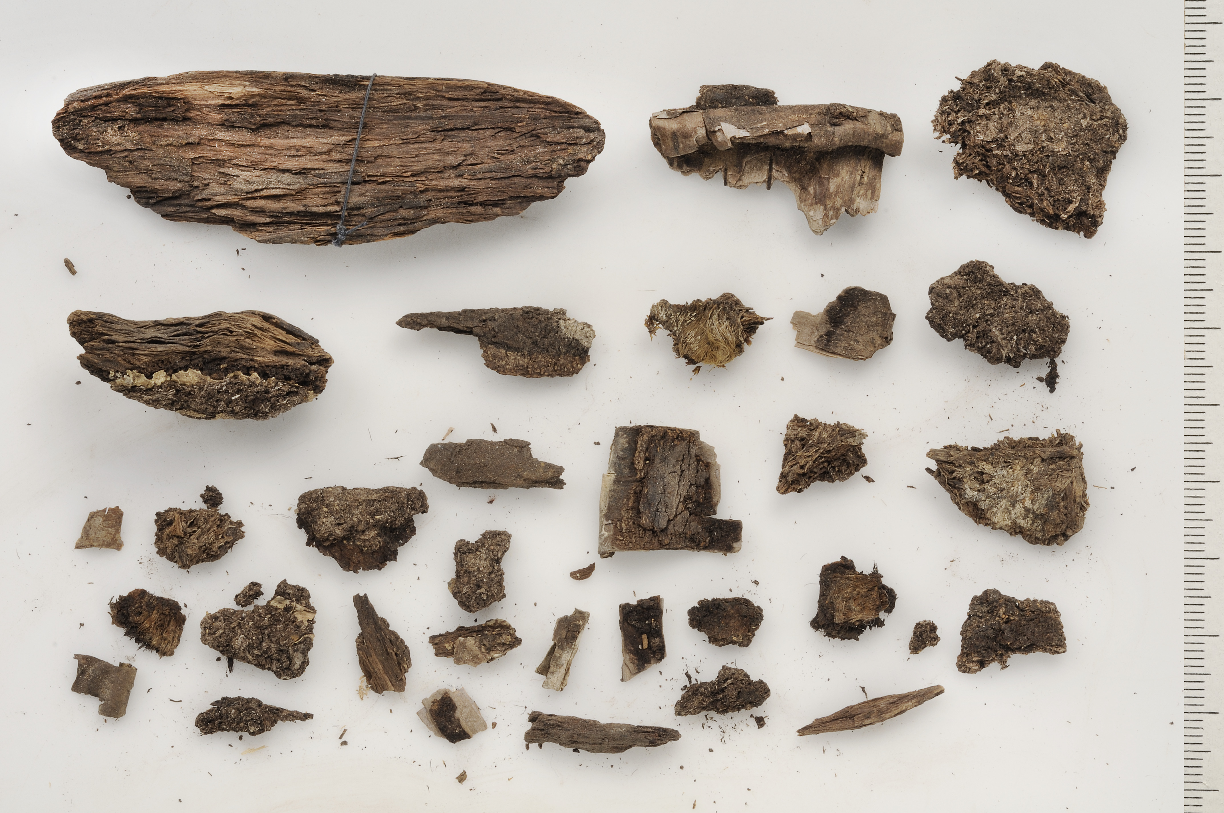 En ask med träbitar, näver, mossa, pälsskinn samt fragmentariserat organiskt material. Sannolikt bevarat invid kniven eller bältet.