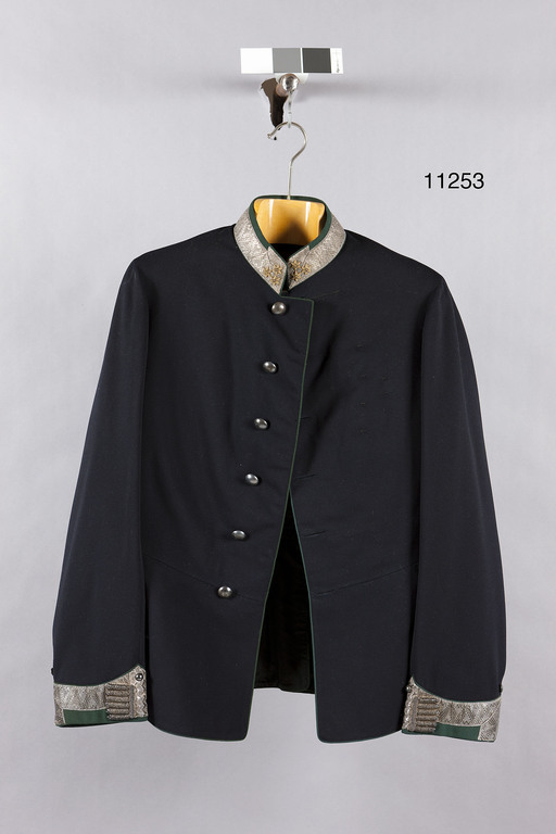 Vapenrock av mörkblått kläde, enkelradig med gröna passpoaler, tillskuren med livsöm och ståndkrage. Ståndkrage klädd med grönt kläde samt med 32 mm bred silvergalon med tre broderade guldstjärnor framtill på kragen. Knäppning med sex välvda silver- knappar, d: 20 mm med text på insidan: "W. SUPERFEIN". Nedtill på ärmarna gröna uppslag kantade med silvergaloner, knapphål av buljoner och små knappar, d: 11 mm. På vänster framstycke sex mindre och en större träns för bröstdekoration. Baktill skört kantade med grön passpoal med sex silverknappar. Foder av svart kyprat siden, i ärmarna grått siden.