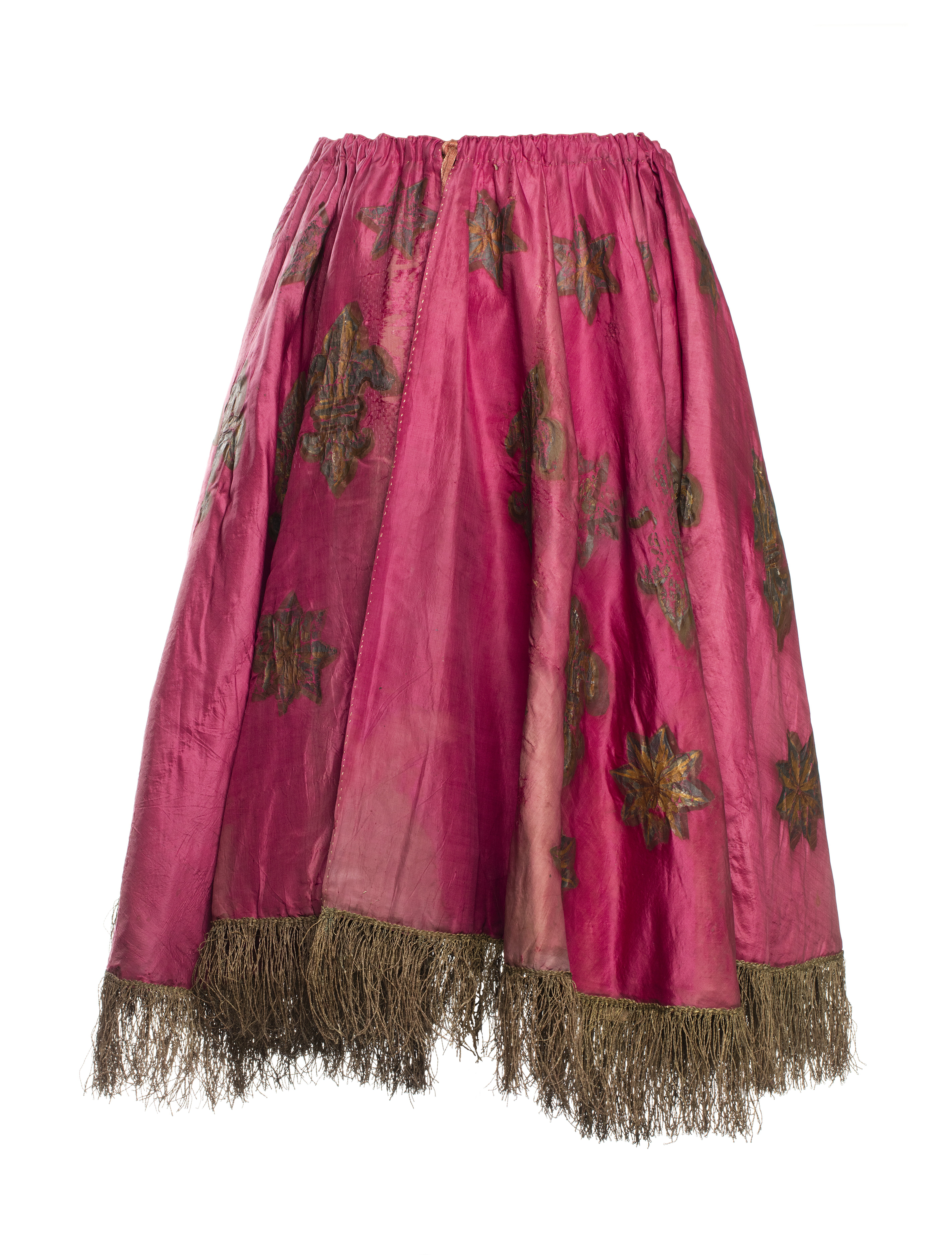 Rundskuret tornerskört av röd taft med målad dekor, bl.a i guldfärg, i form av franska liljan och stjärnor i två olika storlekar, de större med åtta uddar och de mindre med sex uddar. Skörtet är helt öppet i ena sidan. Längs ytterkanten finns en påsydd guldfrans, ca. 9 cm hög. Längs den inre kanten, runt midjan, finns en kanal med ett ljusrött linneband iträtt. Skörtet har foder av svagt ljusrött tuskaftsvävt linne. Fodret består av flera sammansydda delar och är lagat. På insidan finns en lapp av papper, ca. 6,2 cm x 8,6 cm, påsydd med grov lintråd med texten: " No 1028 / Harnesk / Baron Lievens". På ytterligare en lapp av papper står: "55" skrivet med bläck samt på fodret är skrivet: "23".