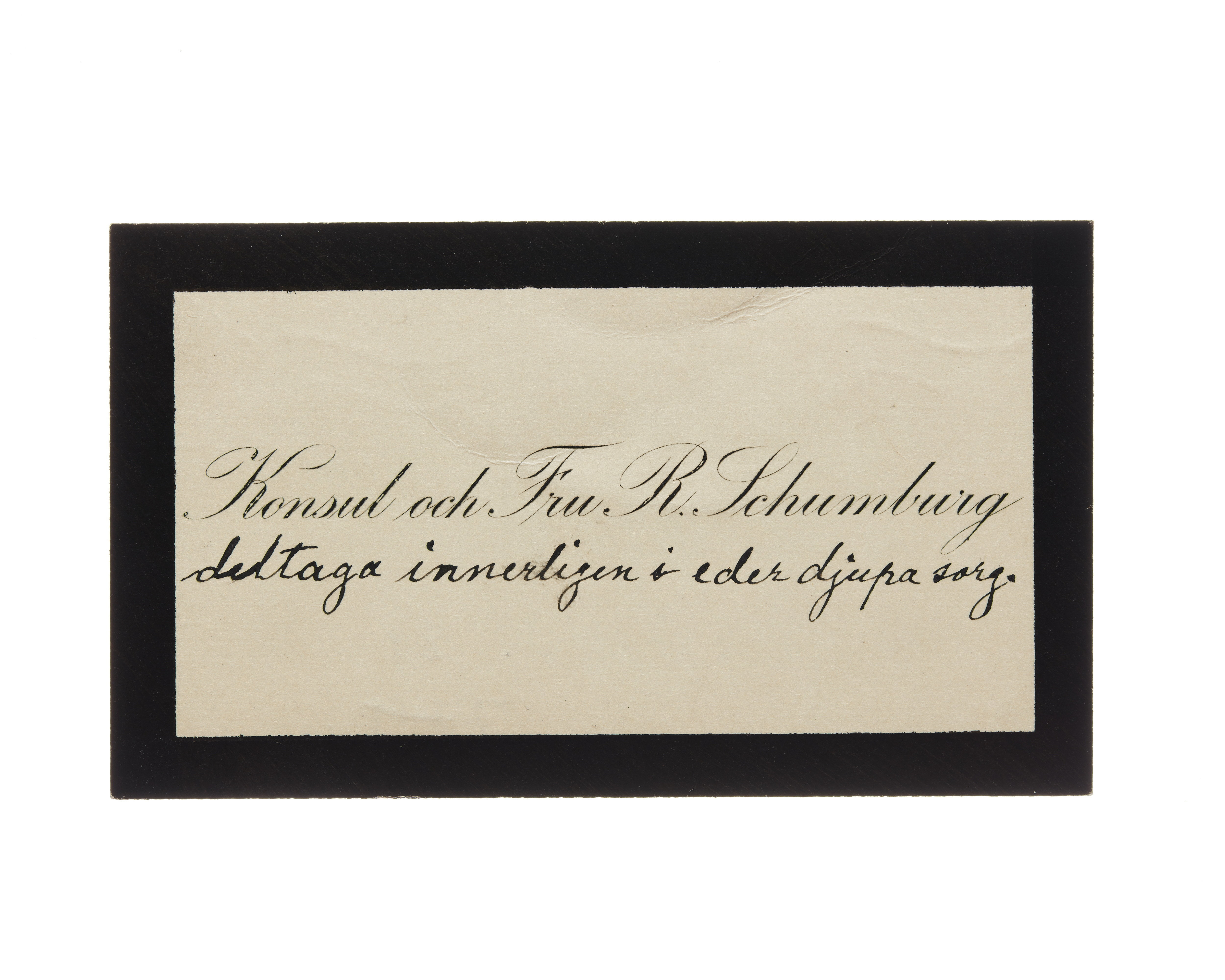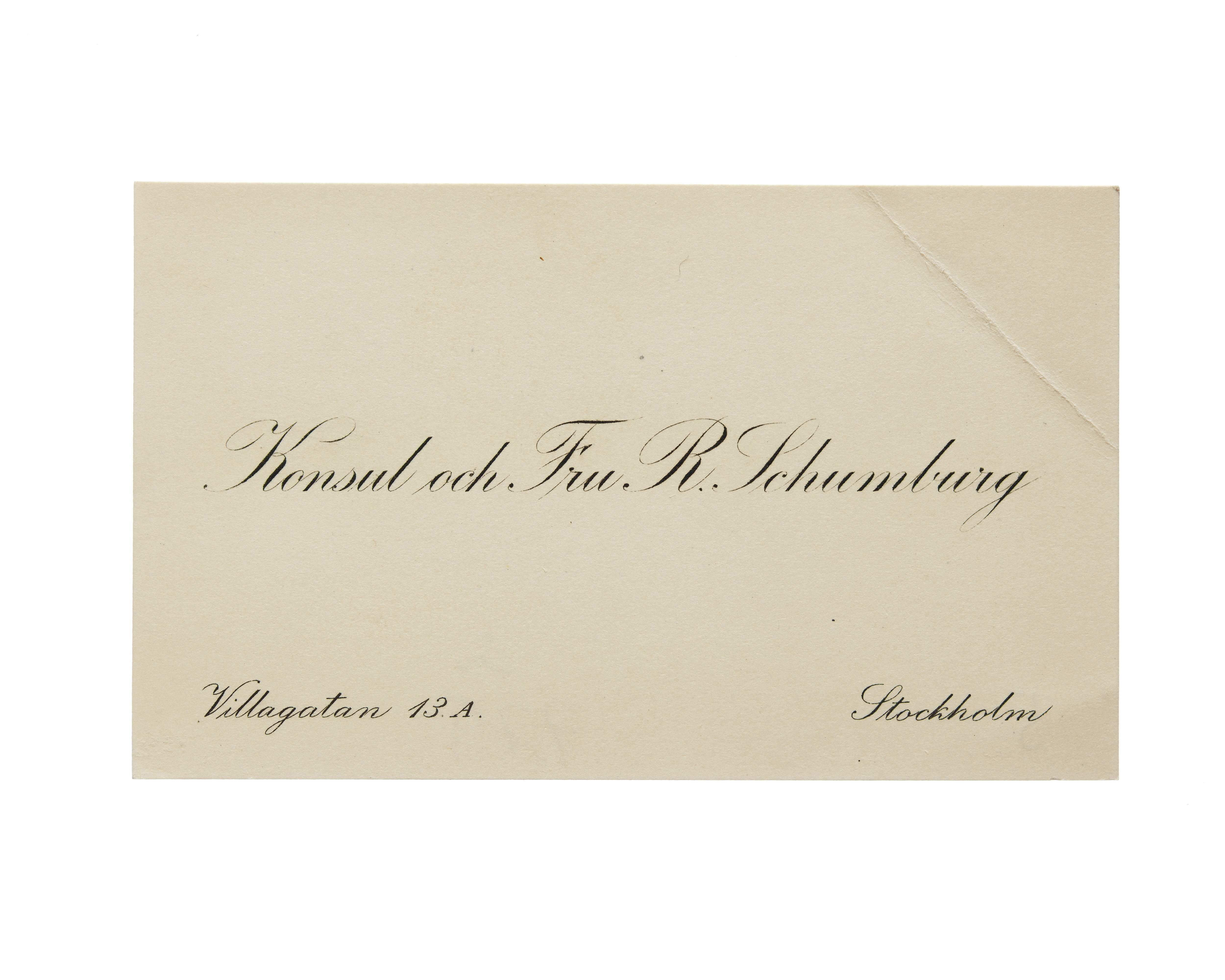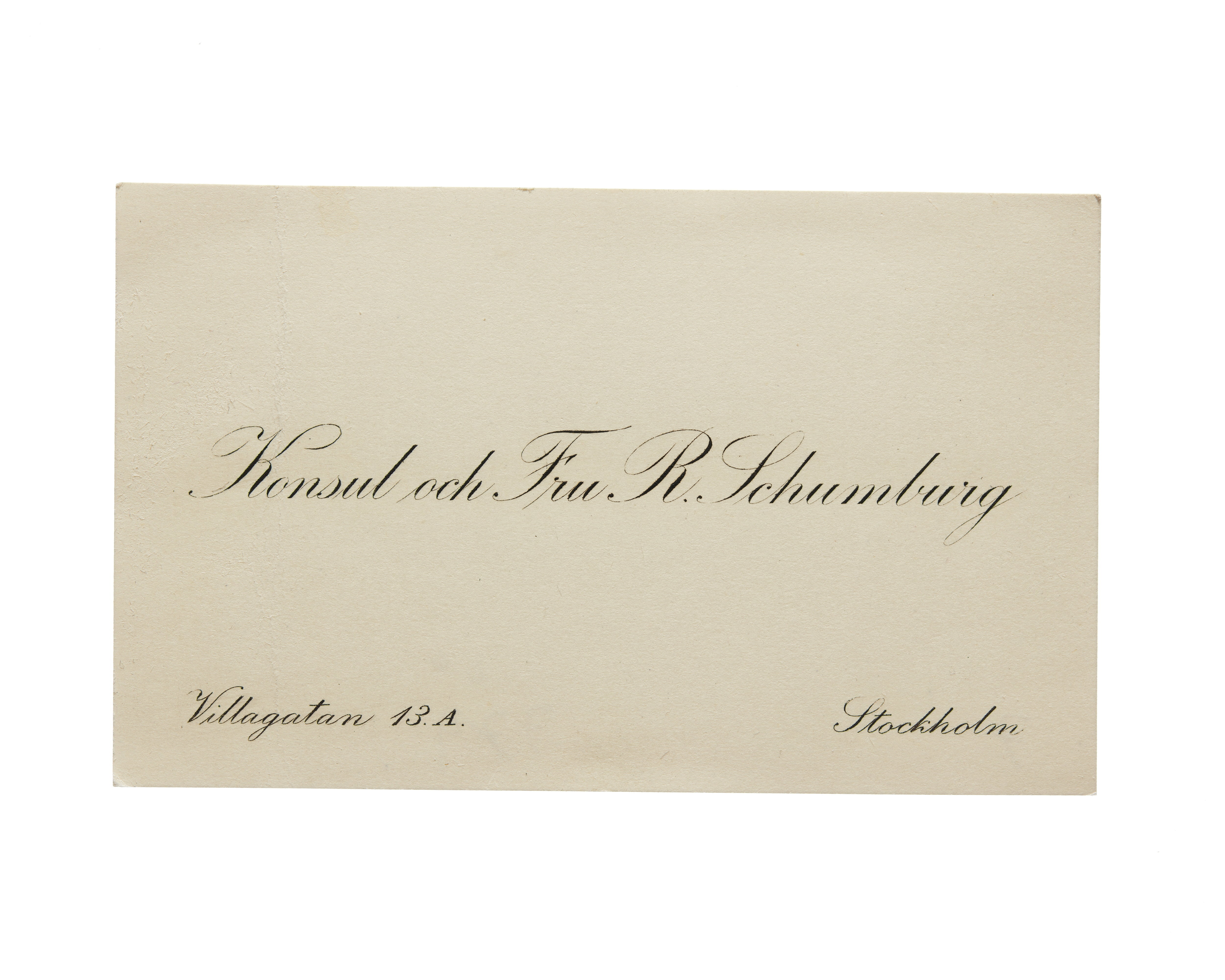 Åtta visitkort från Konsul Robert Schumburg och Fru Martha Schumburg, f. Giesecke. Första kortet är utan datum, vikt i högra sidan. Andra kortet daterat 1921 samt sorgkant. Handskrift "deltaga innerligen i eder djupa sorg.". Tredje kortet daterat 1923, vikt i övre vänstra hörnet. Fjärde kortet daterat 1924, vikt i högra sidan. Adress (nedre vänstra hörnet) Villagatan 13. A. (nedre högra hörnet) Stockholm. Femte kortet daterat 1925, vikt i övre högra hörnet. Sjätte kortet daterat 1925, vikt i övre vänstra hörnet. Sjunde kortet daterat 1926, vikt i vänstra sidan. Åttonde kortet daterat 1929, vikt i vänstra sidan.