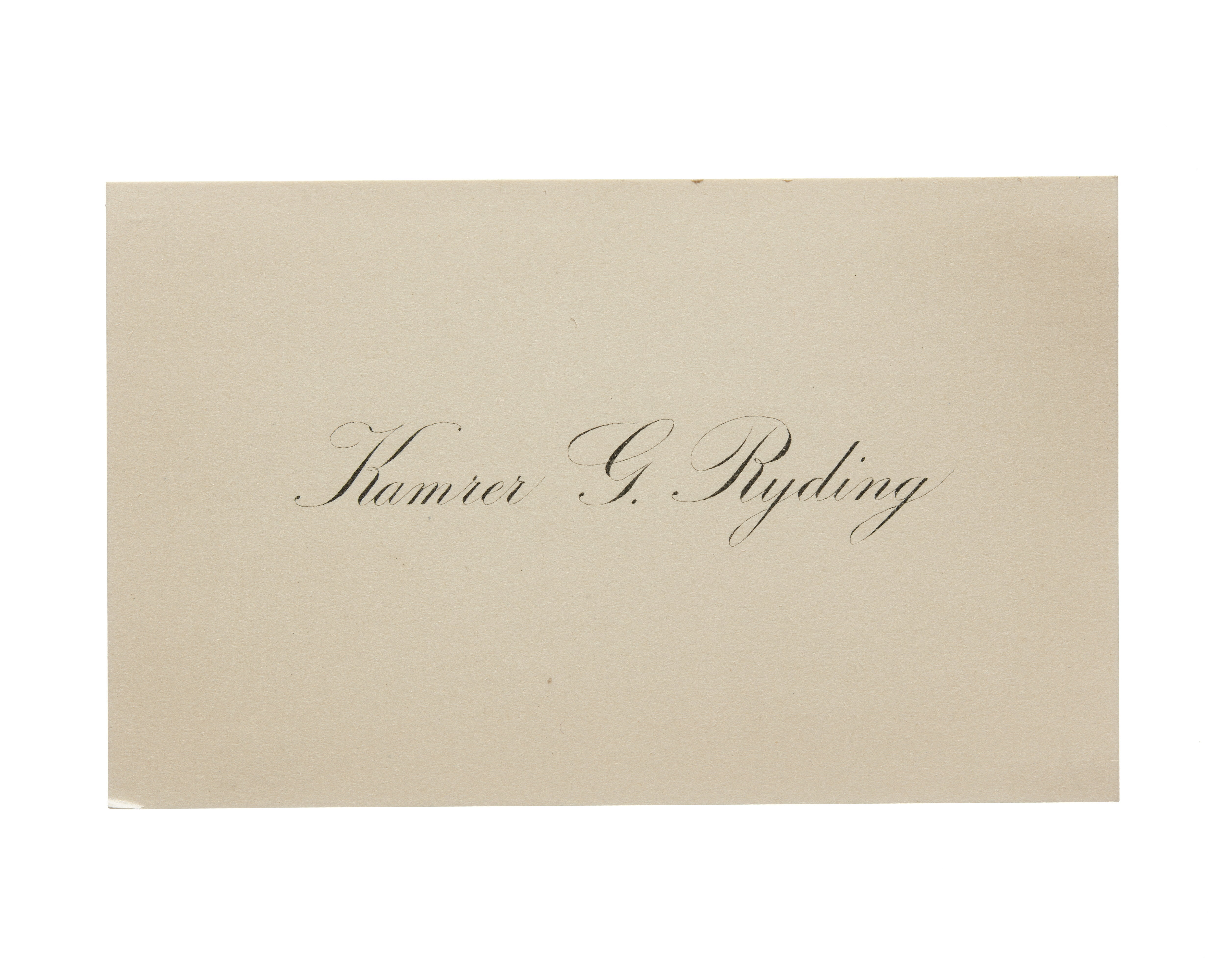 Fyra visitkort från Kamrer G. Ryding. Första kortet daterat 1915. Andra kortet daterat 1916. Adress (nedre högra hörnet) Wallvik. Tredje kortet daterat 1917. Fjärde kortet daterat 1918.