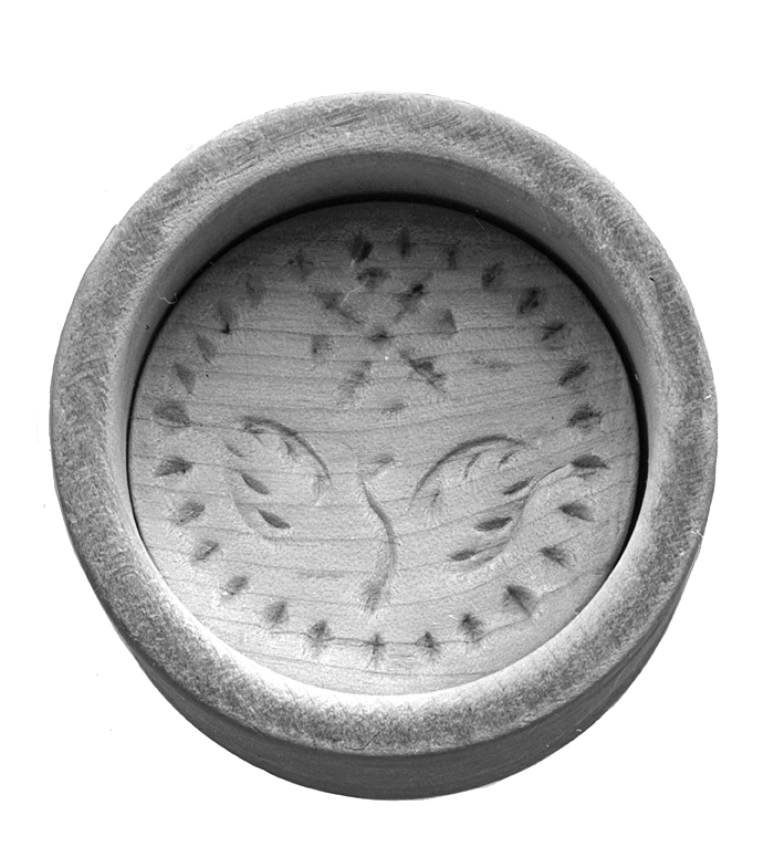 SMÖRFORMAR av lönn, svarvad. I form av en svagt konisk burk med plan botten, vari ett runt hål. Inuti burken en tjock skiva på vars översida inskuret ett mönster av två från en stjälk snett utstående blad under en stjärnformig blomma; kring kanten en rad tvärställda romber. På undersidan en rund fördjupning som fingerfäste. Höjd: 5 cm.; diameter: 8,6 cm. Skiva, tjocklek: 2,5 cm.; diameter: 6,6 cm
