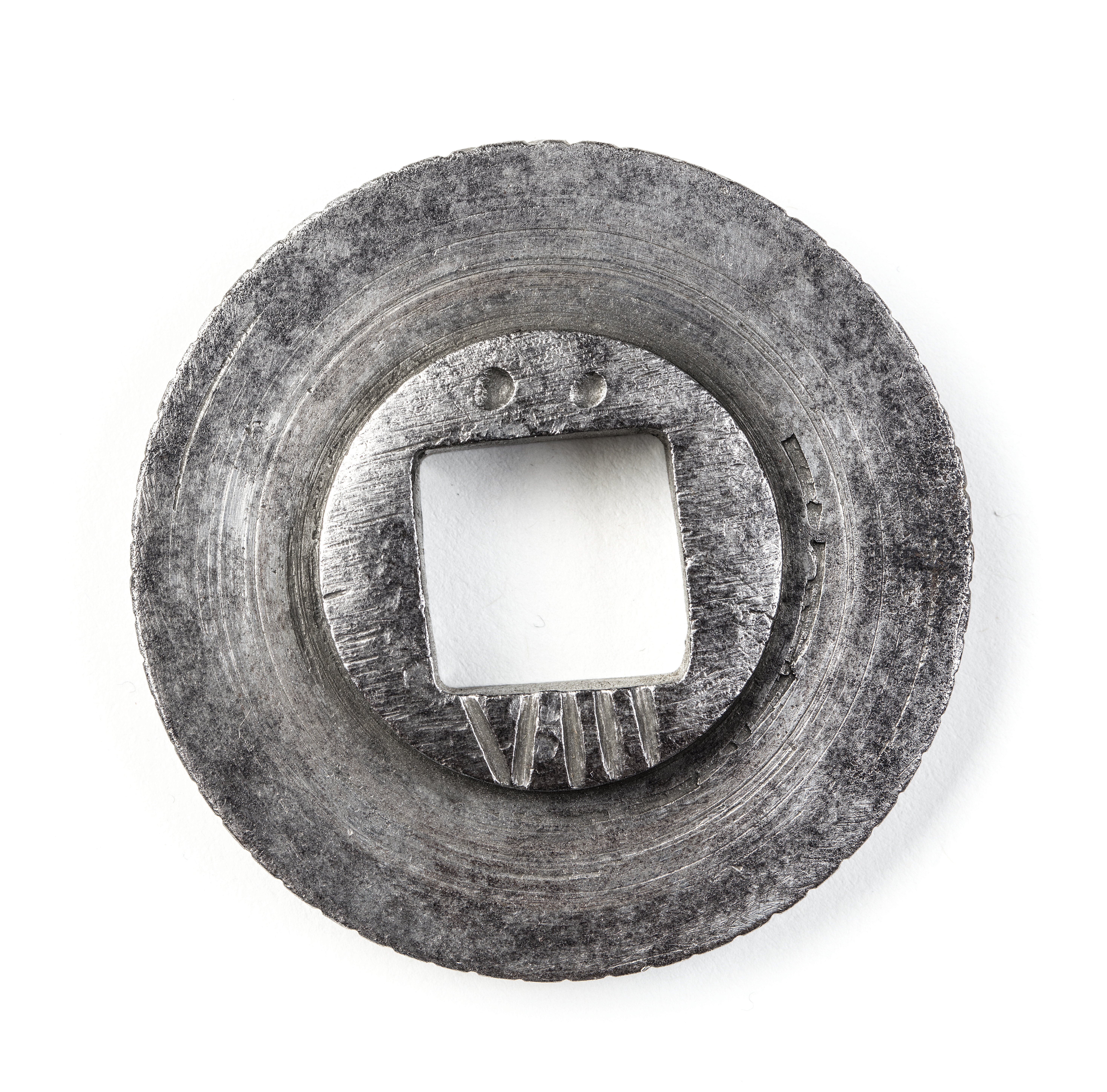 Vals till blyvinda. Runt omkretsen tvärstreck och AHW.I centrum fyrsidigt hål i rund förtjockning. Hålet Hålet märkt på ena sidan med två punkter VIII.