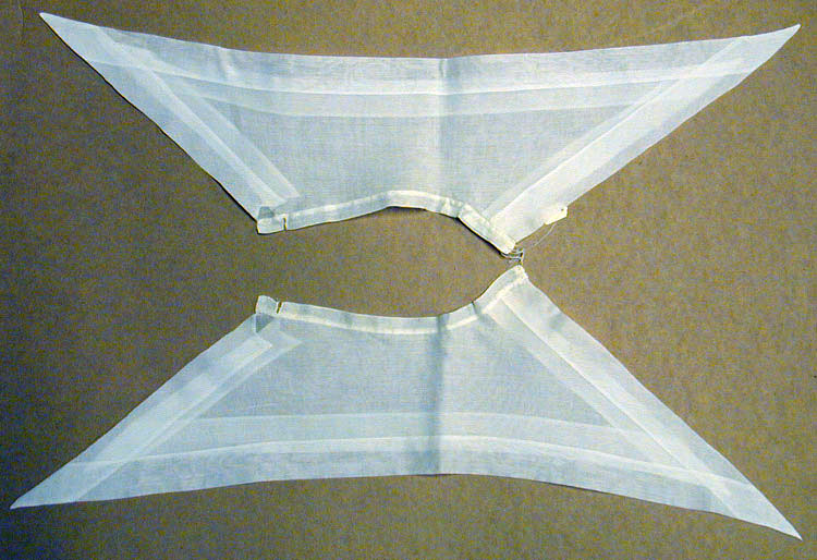 Dubbel snibbkrage av vit bomullsbatist i två delar med längre snibbar fram. Den överliggande kragen mindre. Smala linningar, 13 mm breda, 230 mm långa. Fållarna 28 mm breda. Kragarna sammanfästade med tråd. Samtliga sömmar handsydda. Har tillhört prinsessan Sibylla. Gåva av prinsessan Sibyllas arvingar. Katalogisering:Lena Nordström 1973-08-16, inmatning-utskrift PAr 1997-11-12.