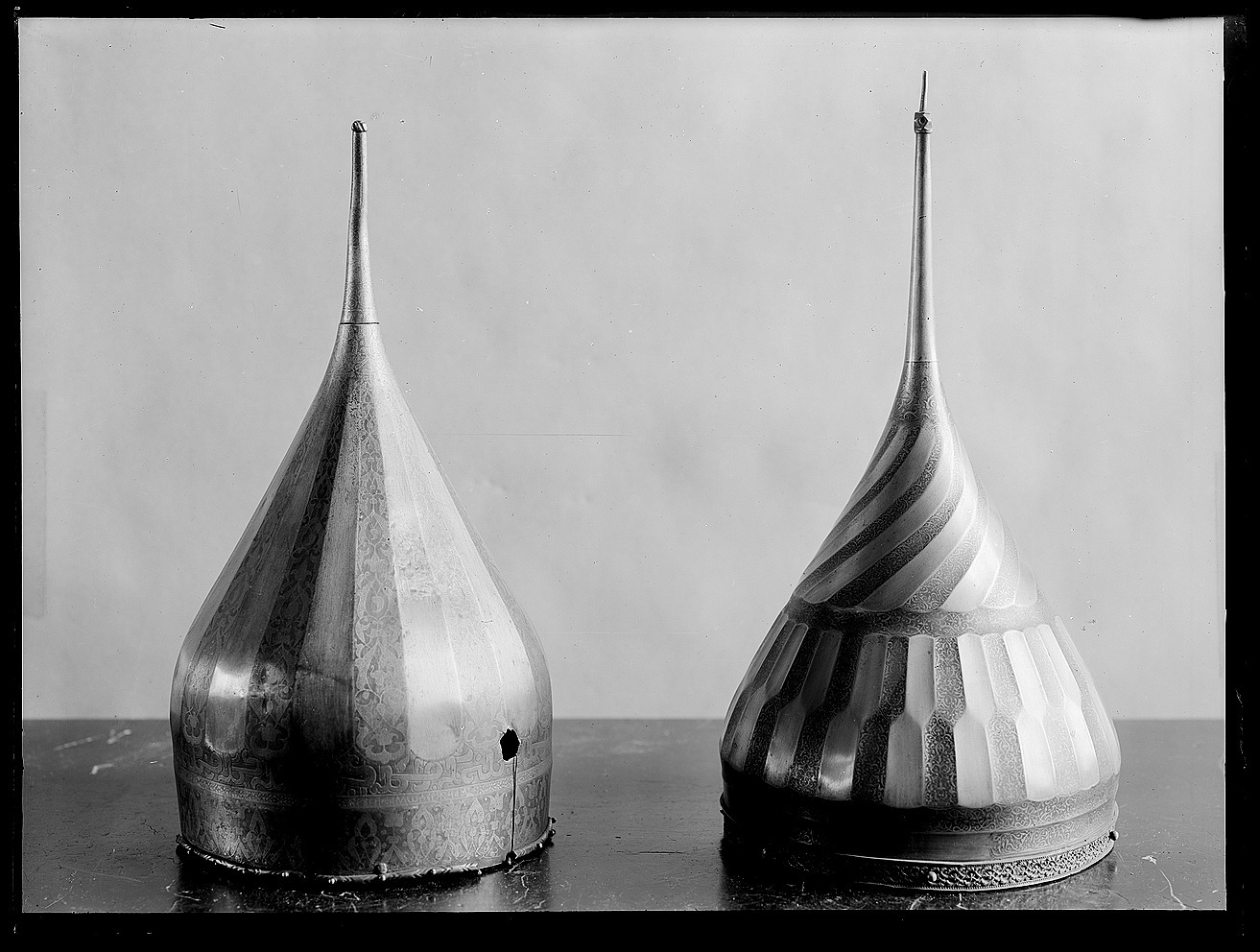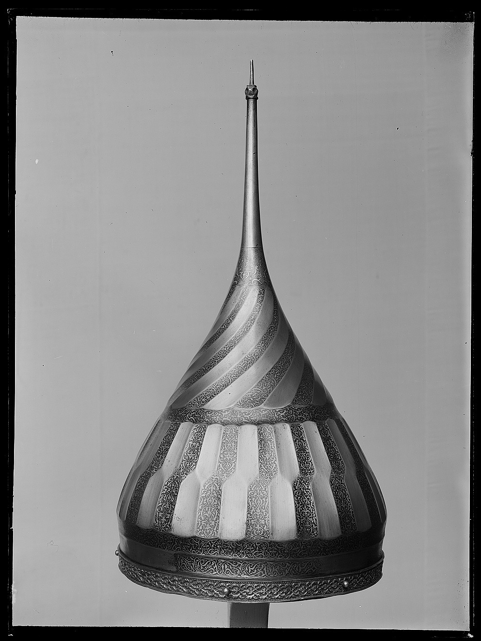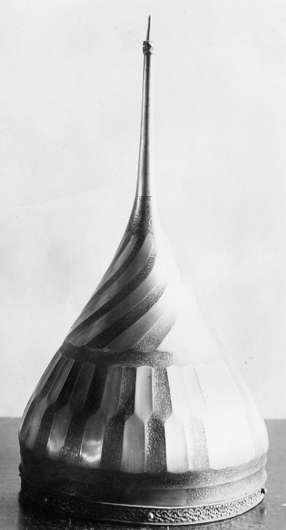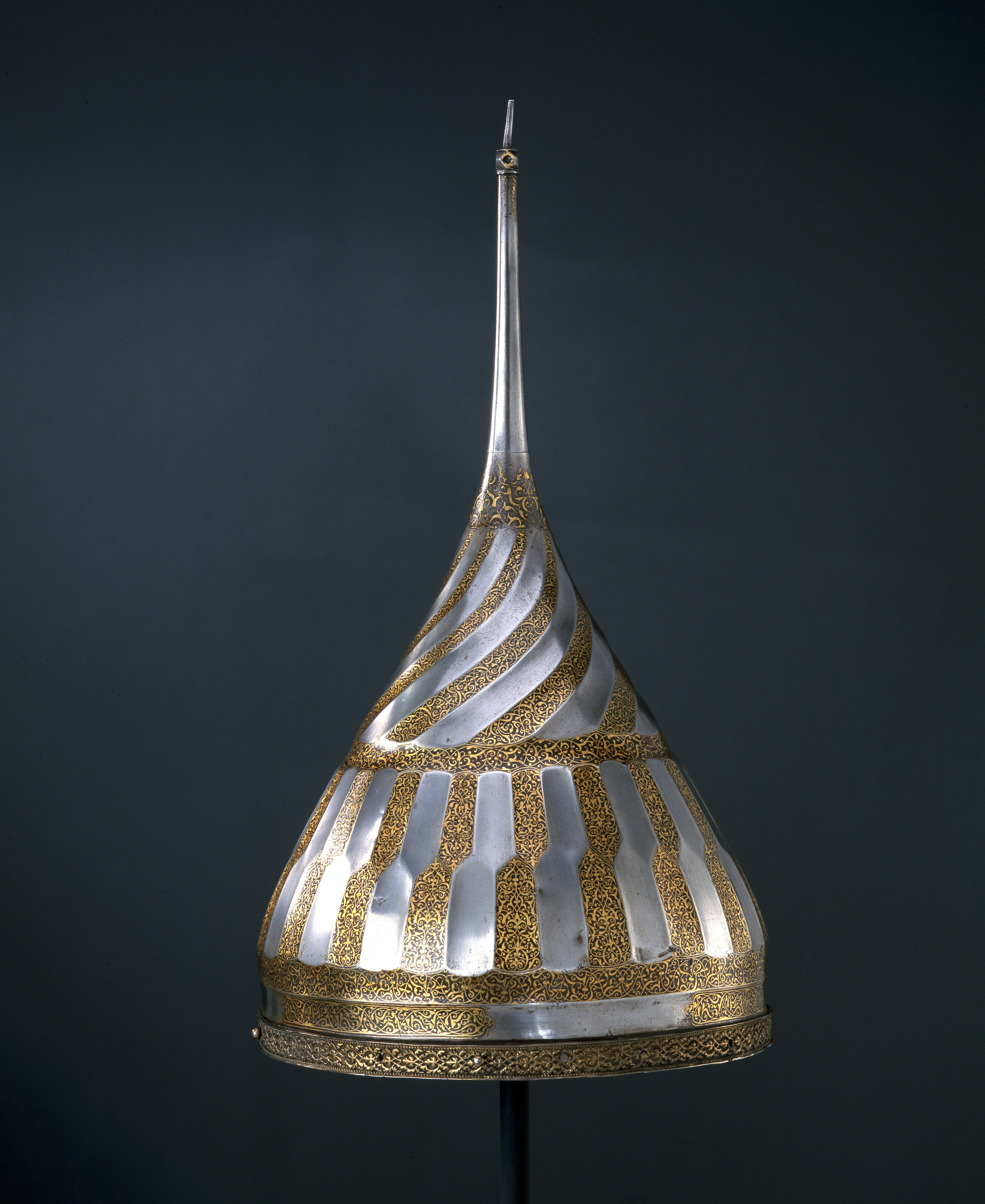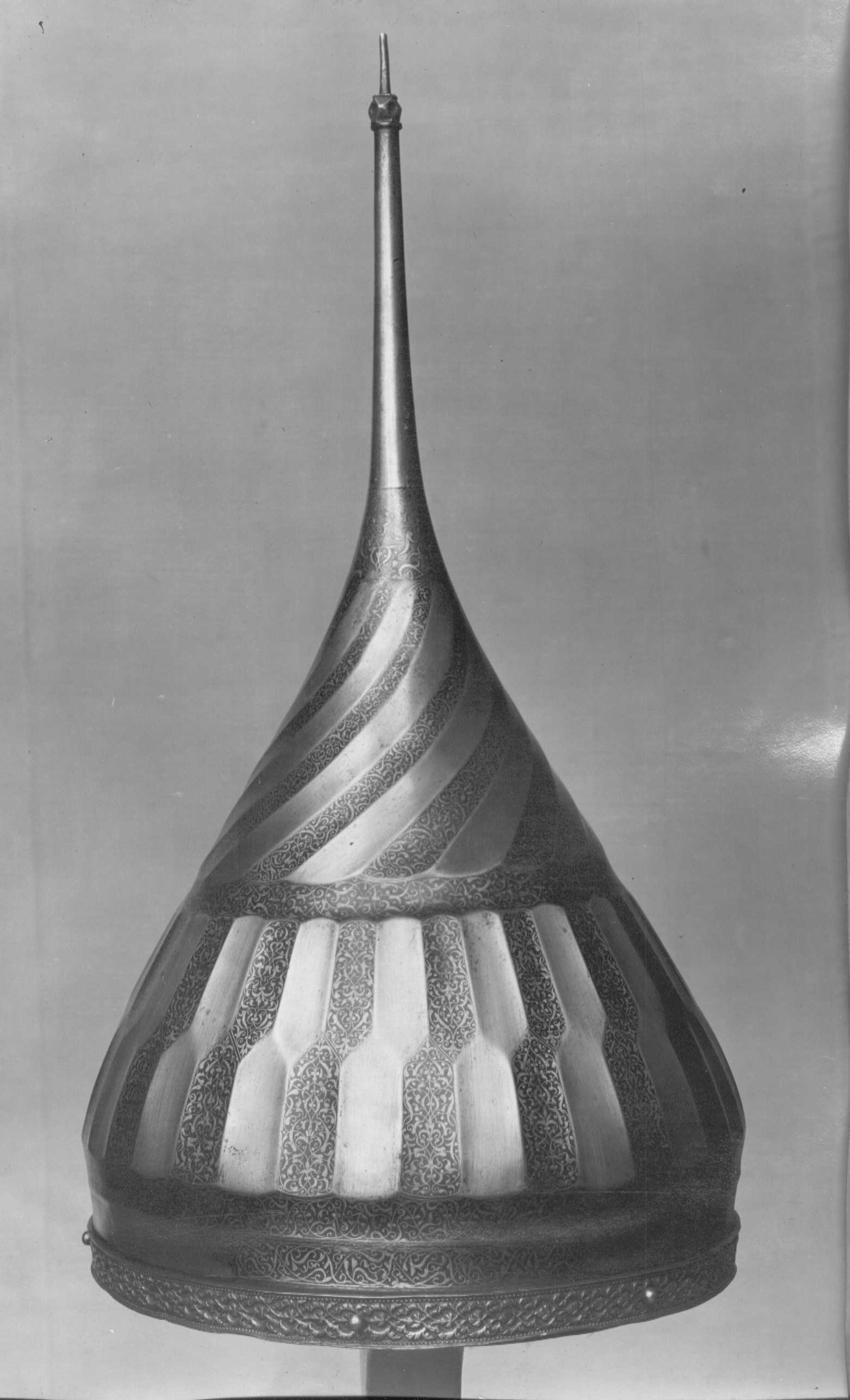 Spetsig hjälm med oval klocka, invändigt klätt med stoppning av rött atlassiden med dekorsömmar i fiskbensmönster. Utvändig dekor: Nertill en ca 15 mm bred ring av förgylld mässing med höga, skarpa kanter och därinnanför pärlstavskantbårder omgivande en bladbård i mitten. Ringen fäst med 15 nitar med kulformiga huvuden, varav fyra återstår. Därovanför två skålade band i stålet, b: ca 15 mm, det övre helt täckt av påslagen rankdekor av guld, på det nedre samma dekor i fyra fält med rundade ändar. Därovanför smalnar hjälmklockan av uppåt. Därpå ett 90 mm brett dekorband sammansatt av ca 15 mm breda stavar i två rader med sicksackformig avgränsning mellan raderna, så att den övre raden är halvt förskjuten i förhållande till den nedre. På två angränsande stavar i de två raderna dekor som tidigare. Därovanför en skålad ring med rankdekor. Hjälmklockans övre del dekorerad med 18 spiralvridna, skålade fält, vartannat med gulddekor. Överst en ca 35 mm bred ring med gulddekor, avslutad vid spetsskarven. Spets, l: 155 mm, d nertill 19 mm och avsmalnande uppåt, avslutning upptill med en fasetterad kula med skålade fördjupningar, c: ca 10 mm och därovanför en något böjd spets, l: 22 mm. Nedanför kulan ett mycket slitet fält med gulddekor.