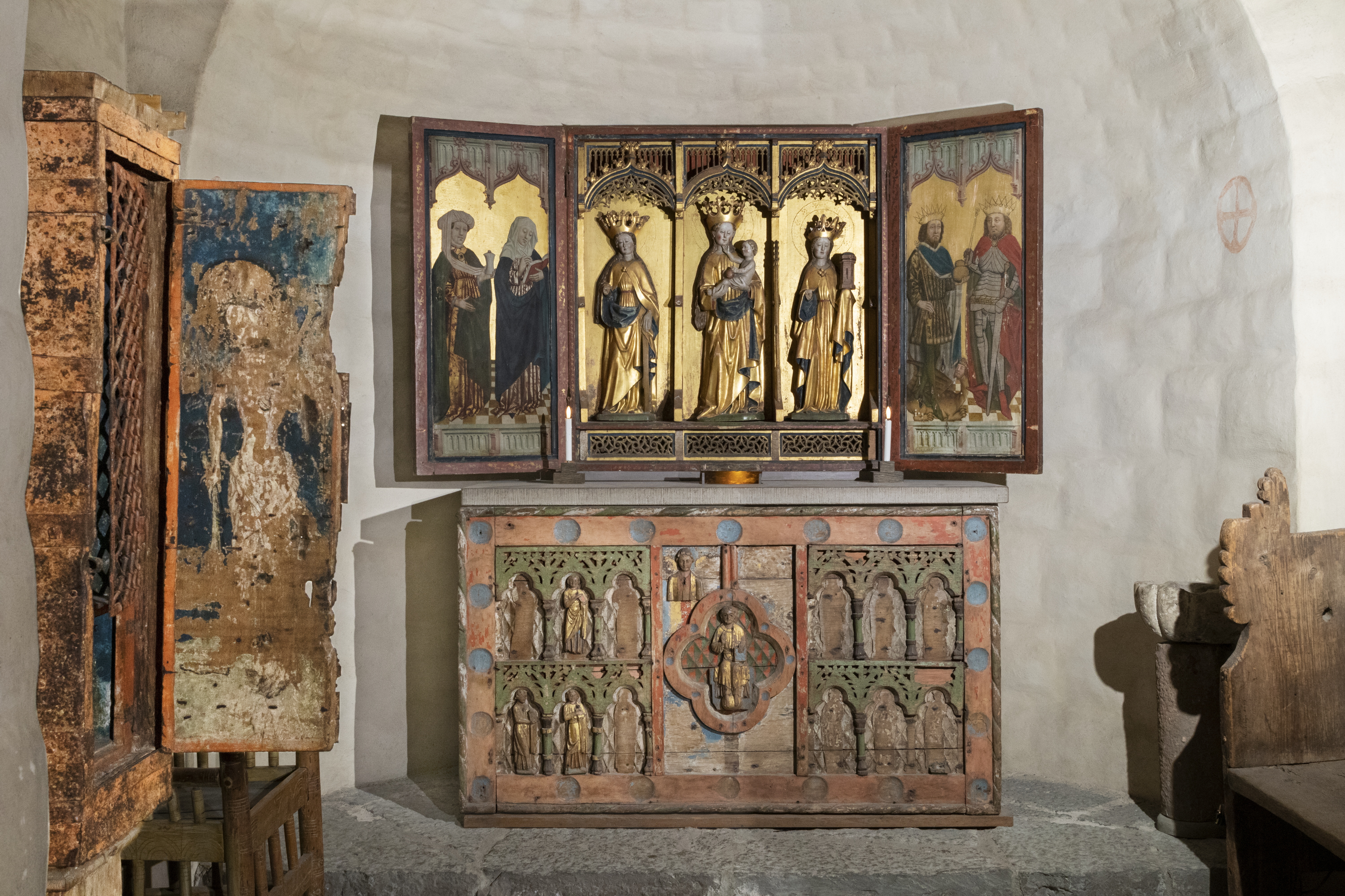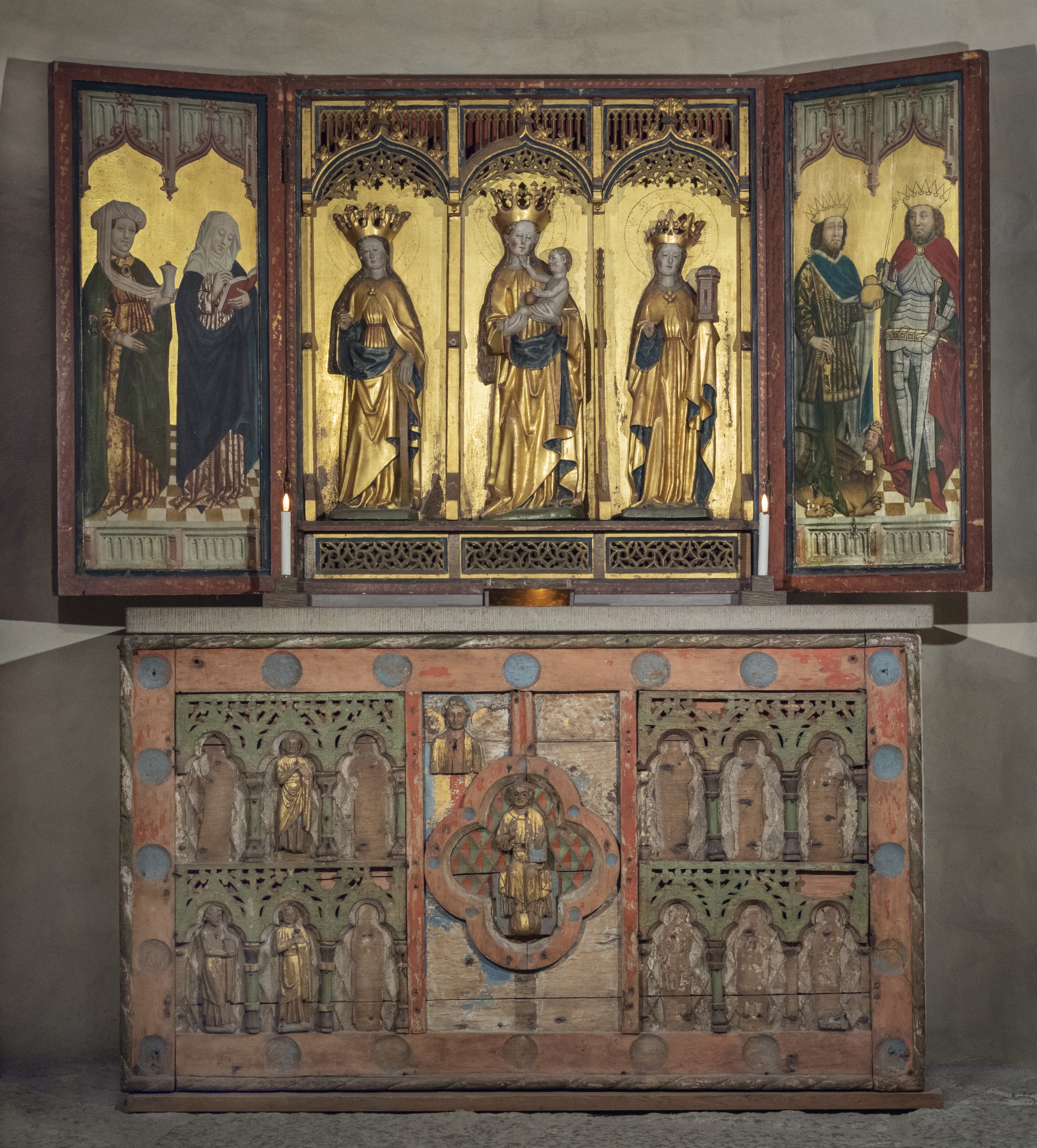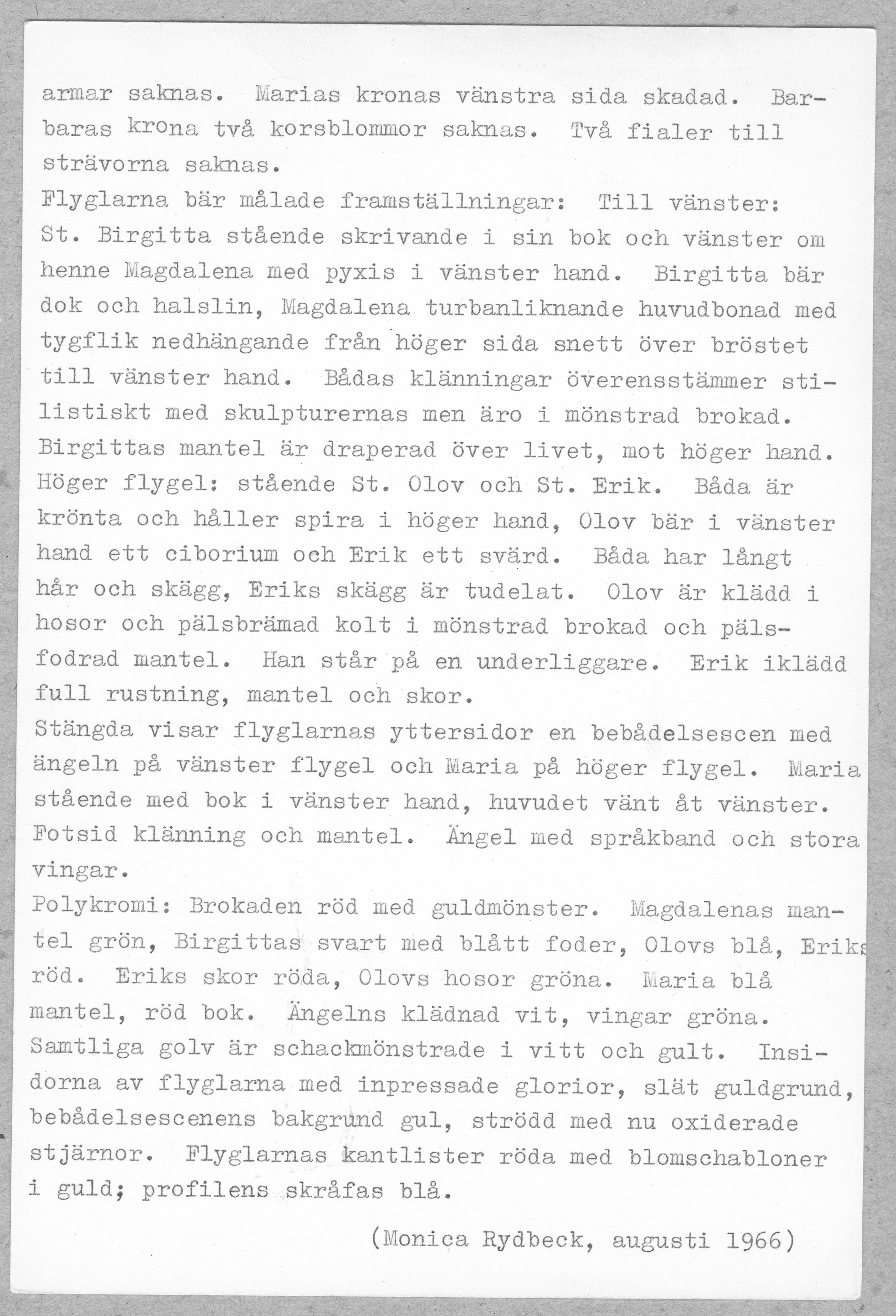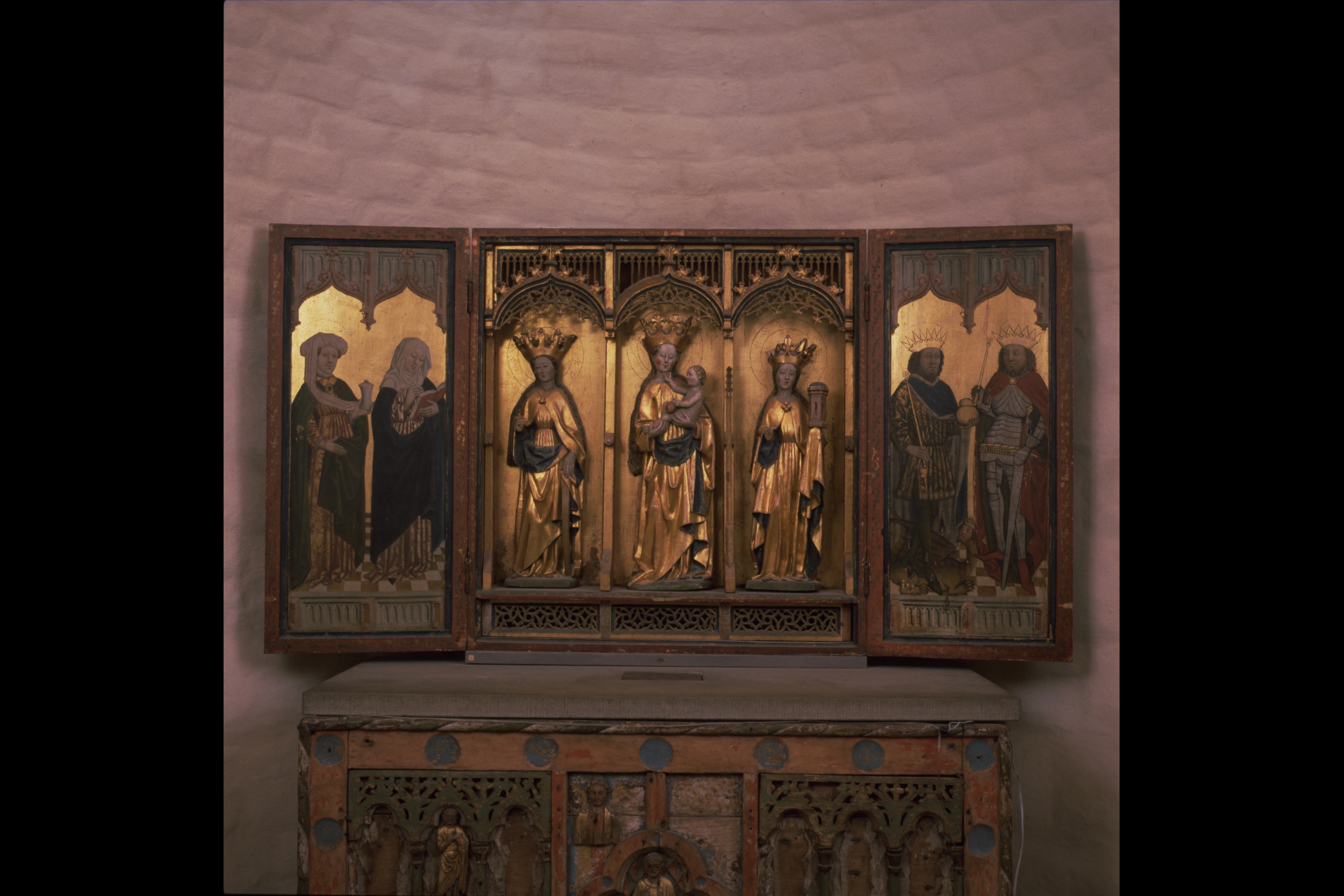 Kondition: Katarinas och Barbaras högerhänder förlorade, två av kronorna skadade. Färg: skulpturens polykromi välbevarad, flyglarnas pannåmålningar något blekta och flagnande.