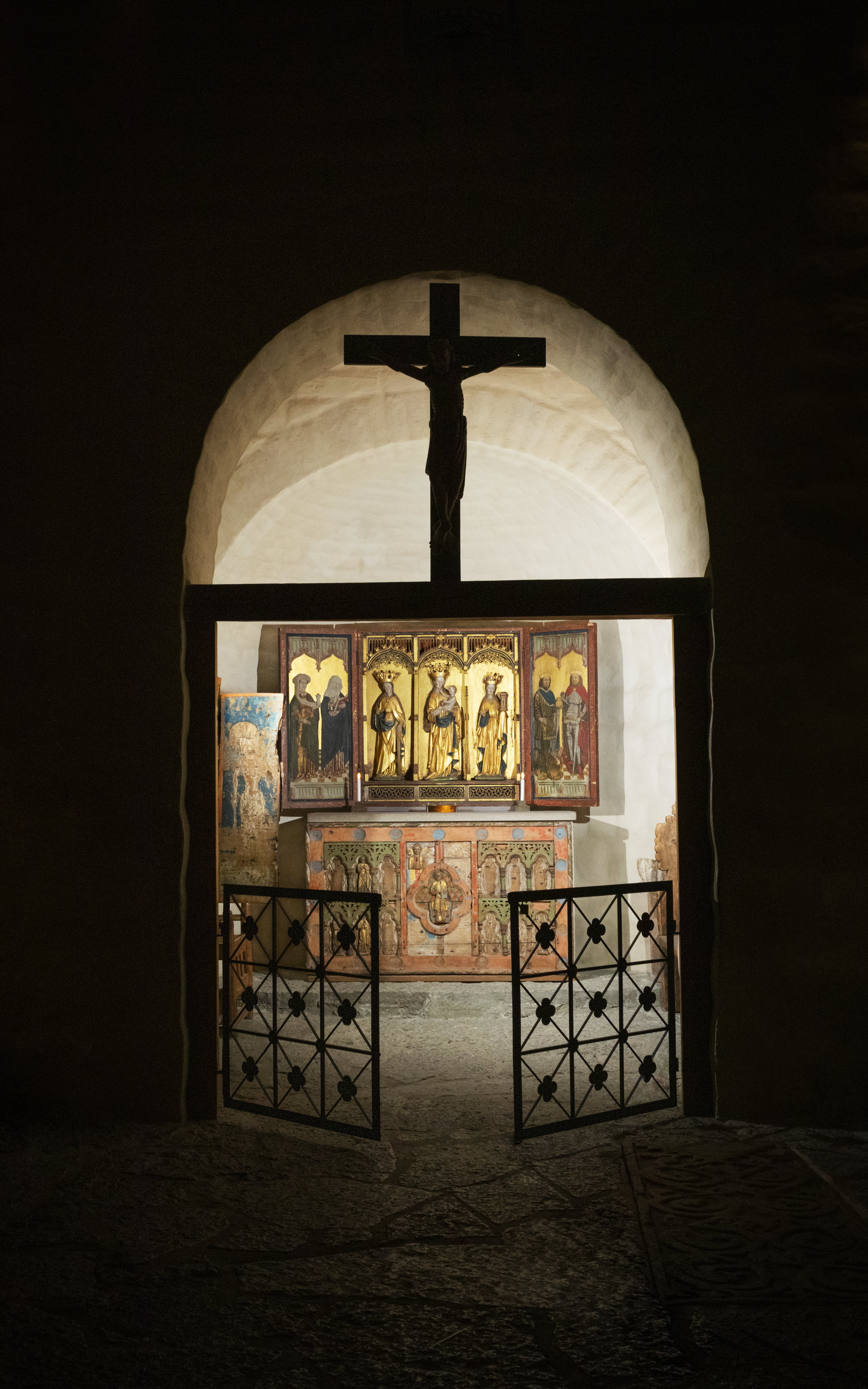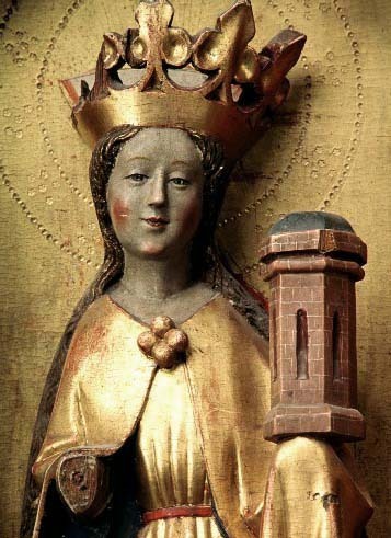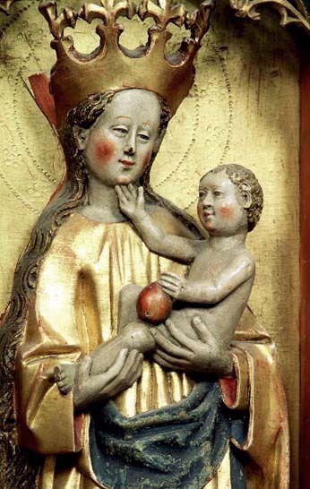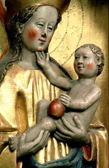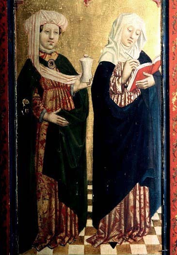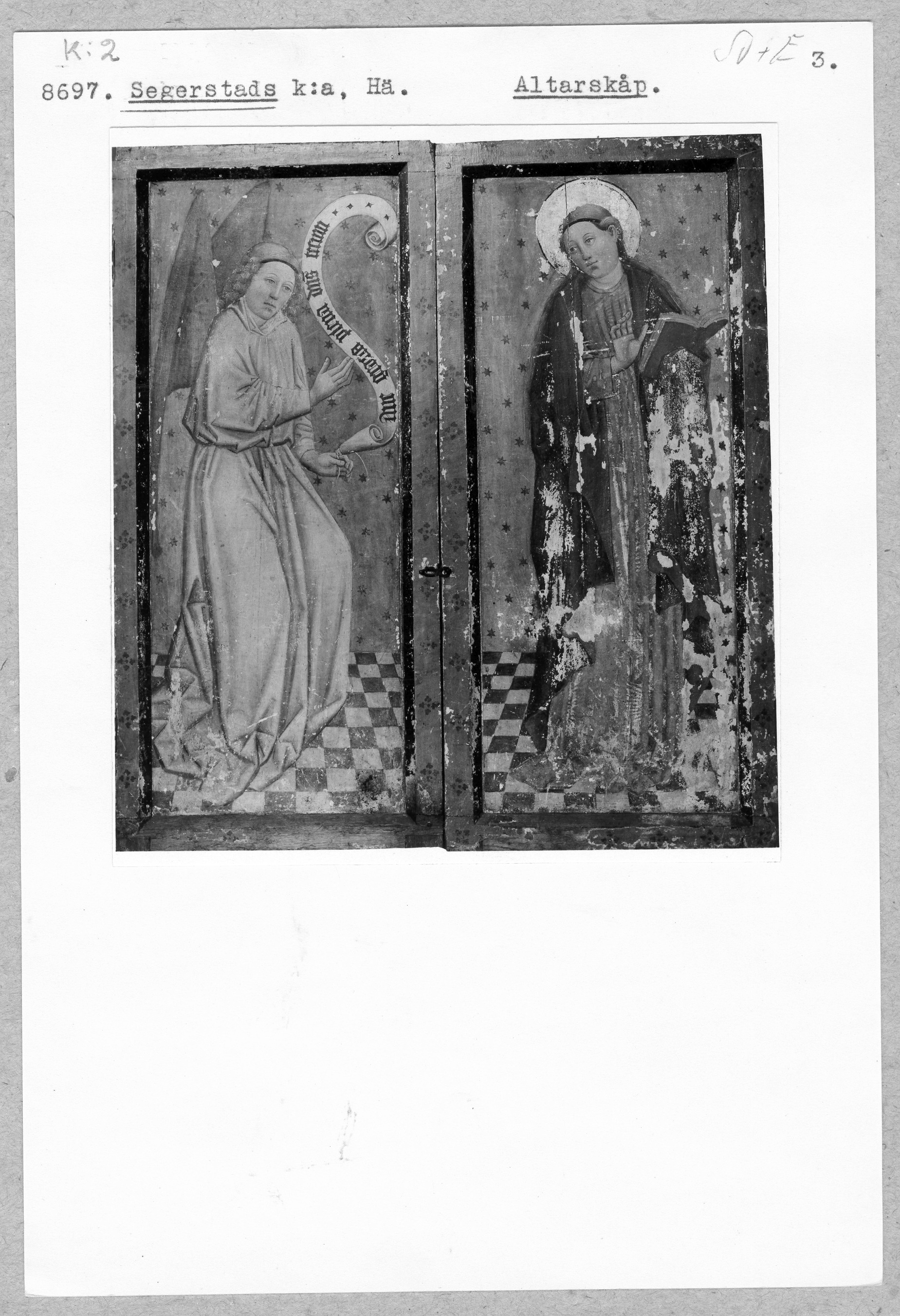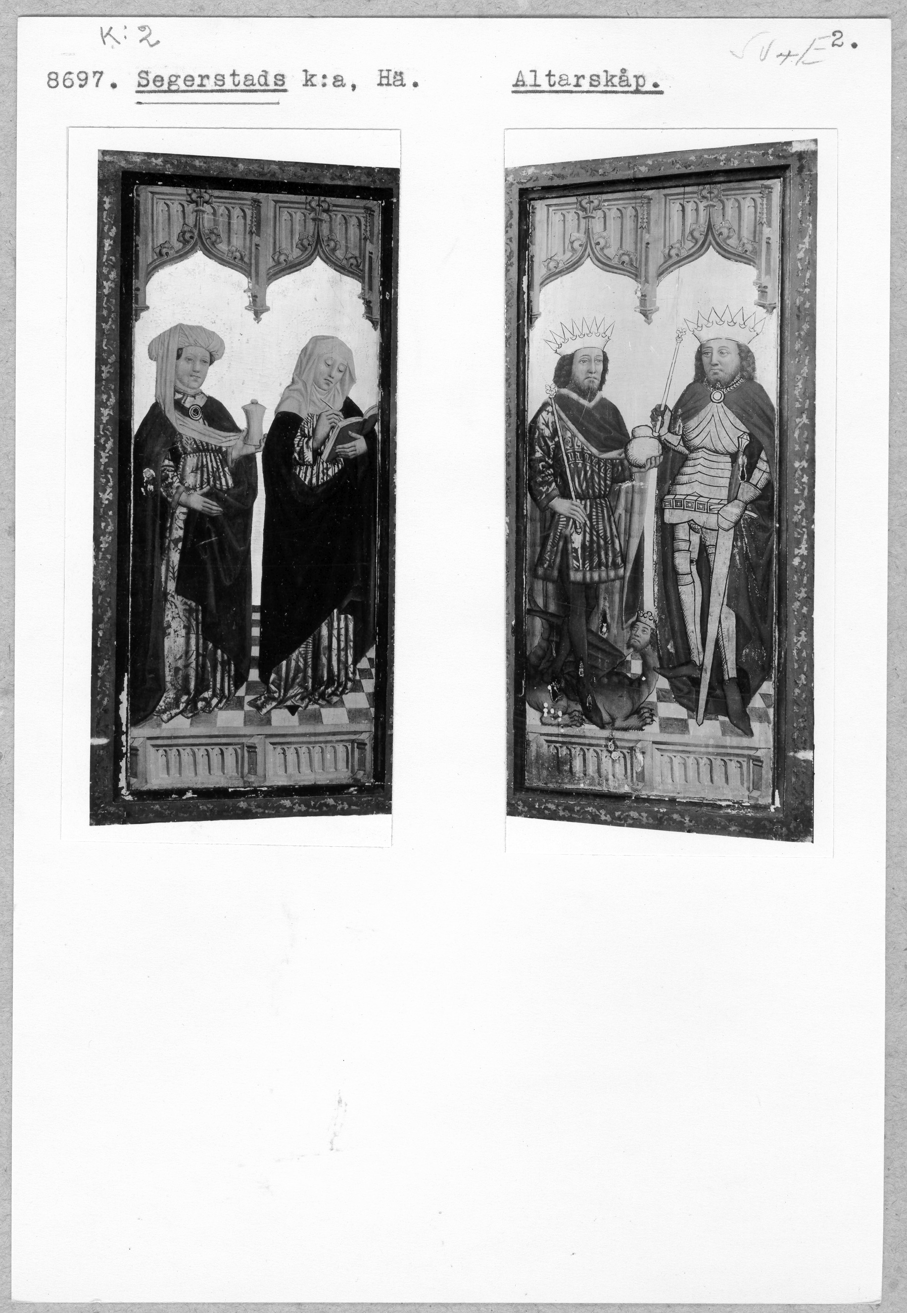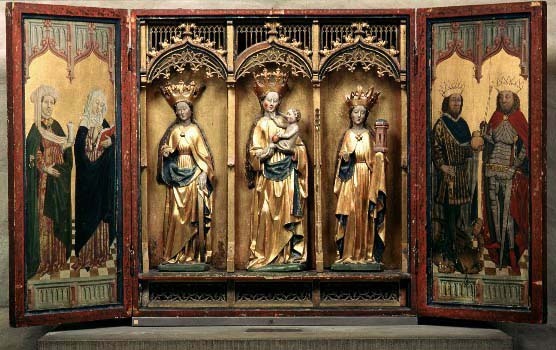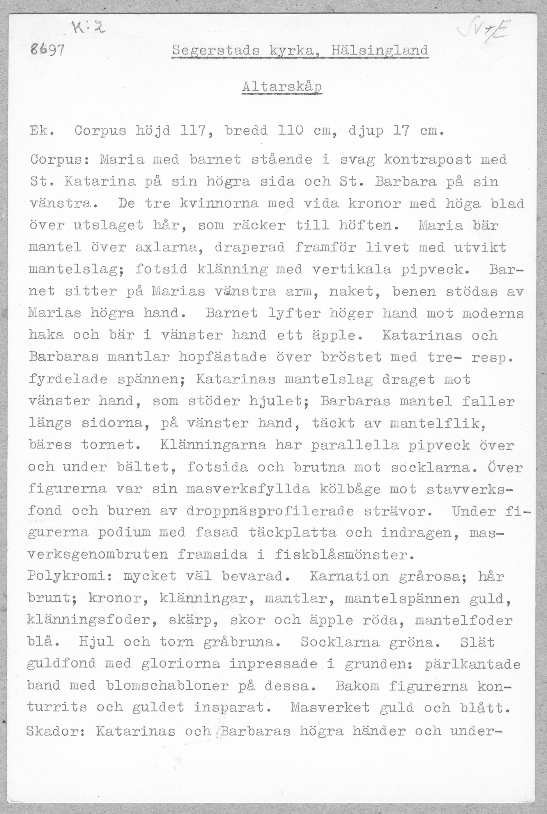 Kondition: Katarinas och Barbaras högerhänder förlorade, två av kronorna skadade. Färg: skulpturens polykromi välbevarad, flyglarnas pannåmålningar något blekta och flagnande.