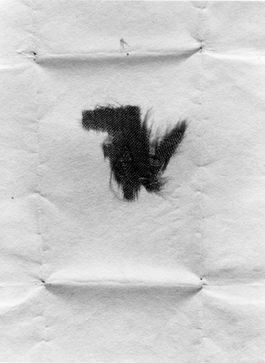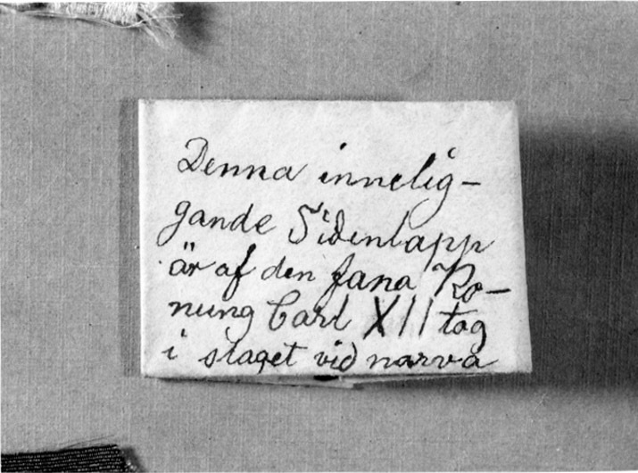 Oregelbundet, mycket fransigt stycke grönt siden. Inlagt i konvolut, klistrat på tavlan. På konvolutet bläckpåskrift: "Denna innelig- // gande Sidenlapp // är af den fana Ko- // nung CarlXII tog // i slaget vid Narva".