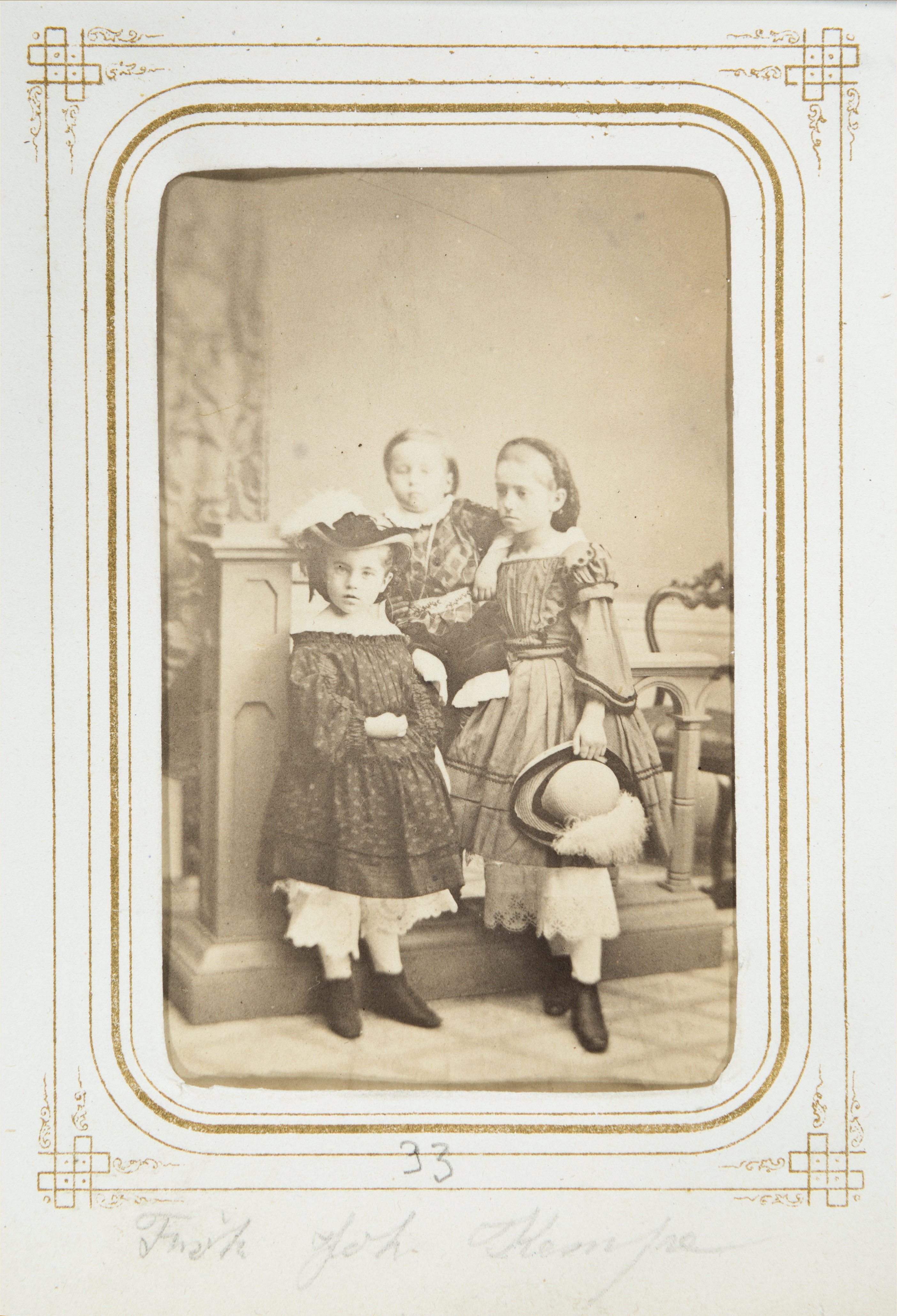 Biografi. Fotografiporträtt. 101 porträtt i album. Systrarna JOHANNA (JENNY), ALICE OCH ESTHER KEMPE som barn. Erhållet av Johanna Kempe, f. Wallis på 1860-talet. 26,5x20,7x4 cm.