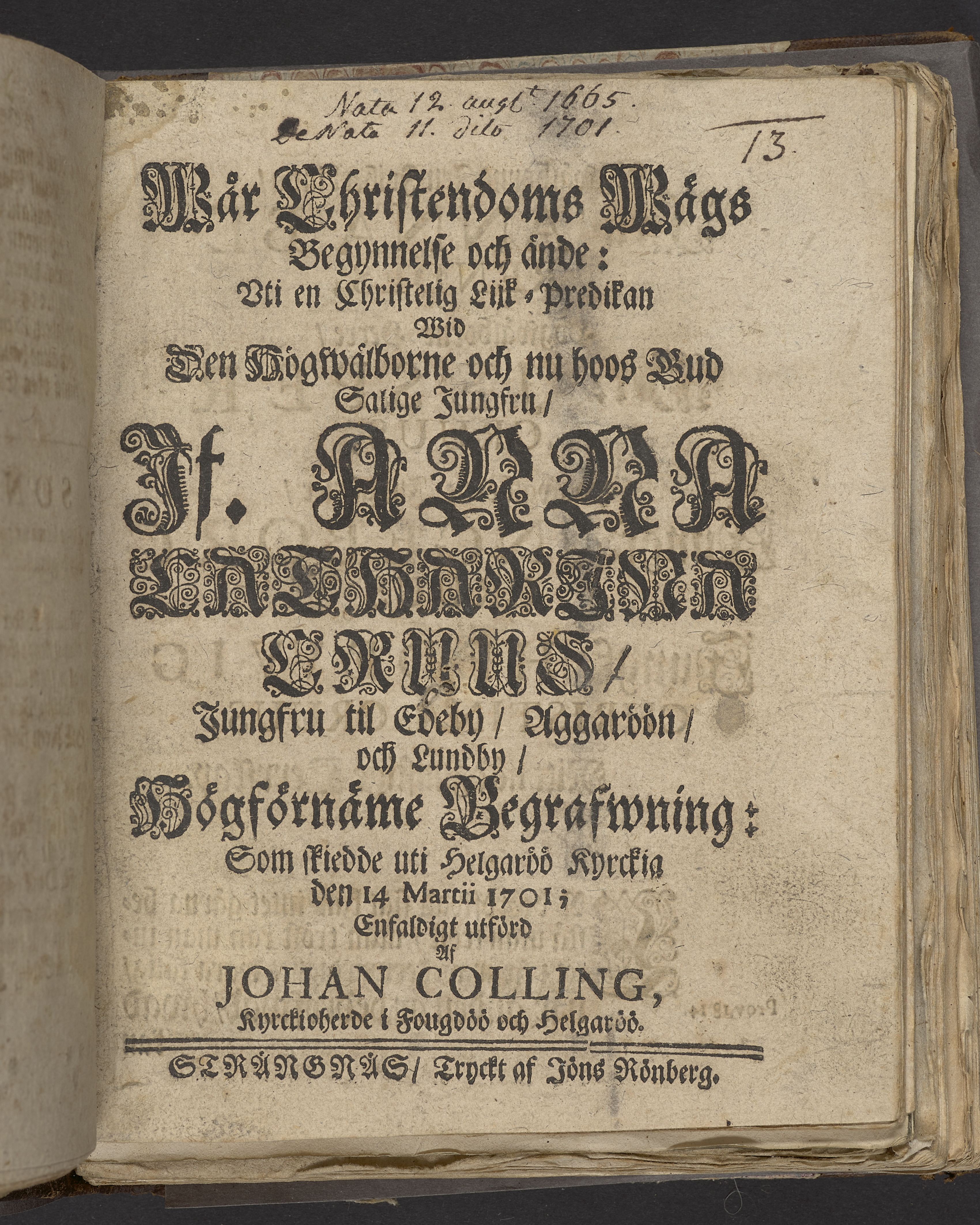 Wår christendoms wägs begynnelse och ände... wid... Jf. Anna Catharina Cruus... begrafwning... uti Helgaröö kyrckia den 14 martii 1701... utförd af Johan Colling... Strängnäs, tryckt af Jöns Rönberg.