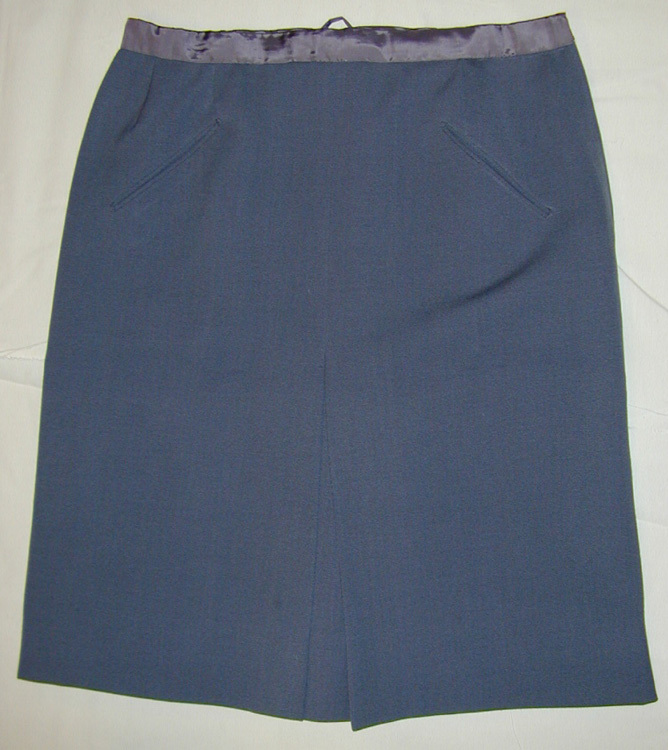 Rakskuren kjol av blågrå yllediagonal. Mitt fram ett 340 mm långt gångveck samt upptill tvåsnedställda stolpfickor. I vänster sida ett 190 mm långt blixtlås samt två hakar ochhyskor. Linning av grått siden. Fickor av grått siden. Mitt fram och mitt bakpå linningensinsida hängare av siden. Fröjds engelska skrädderi, Stockholm 1946-06-00.