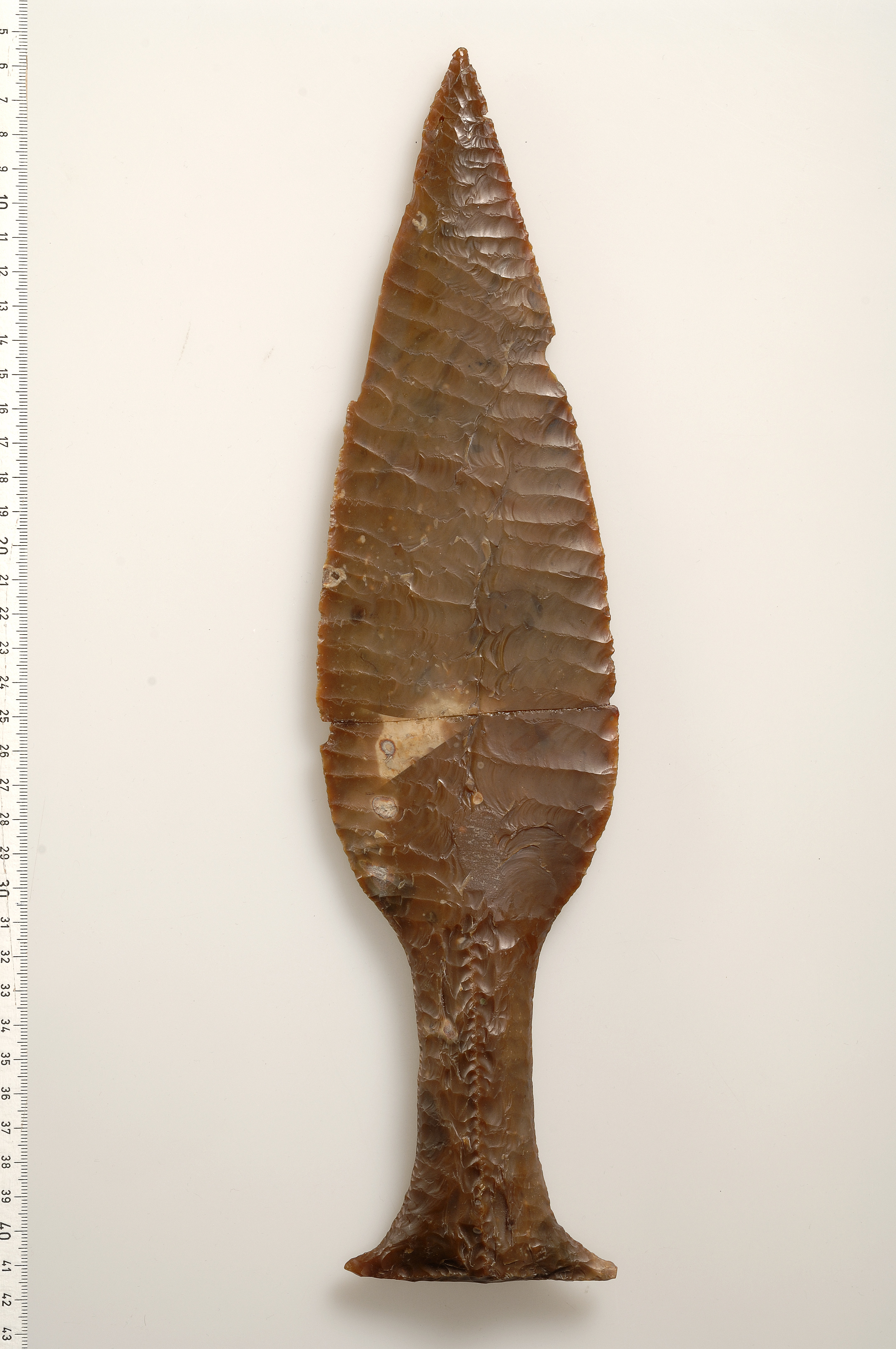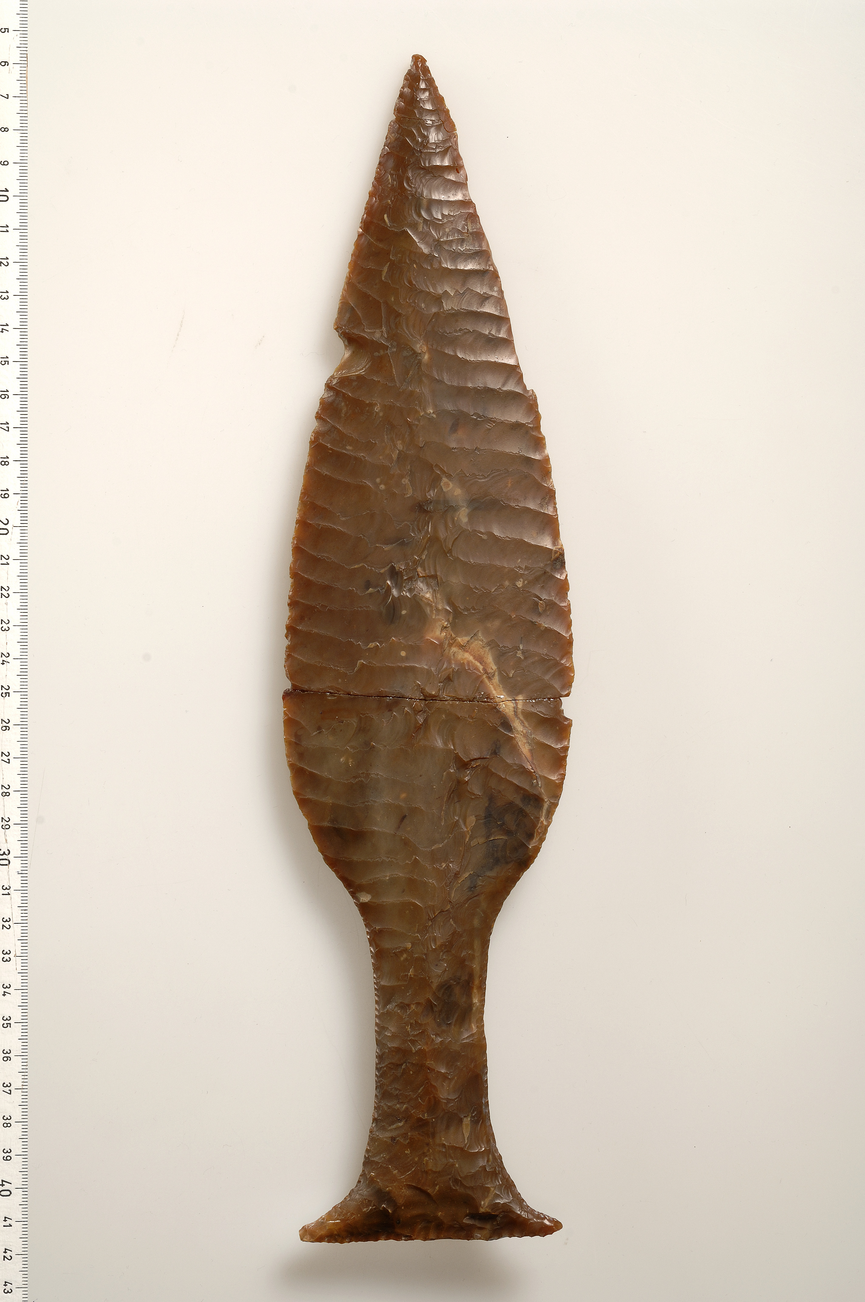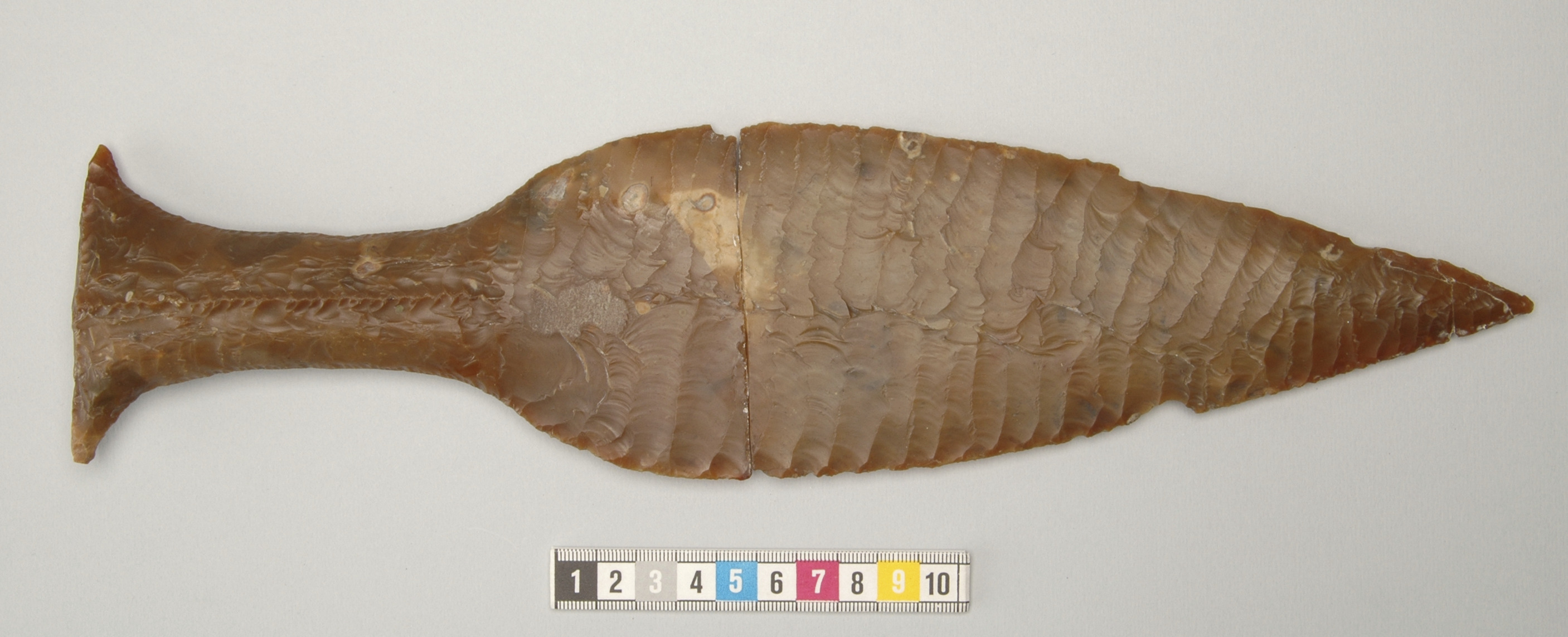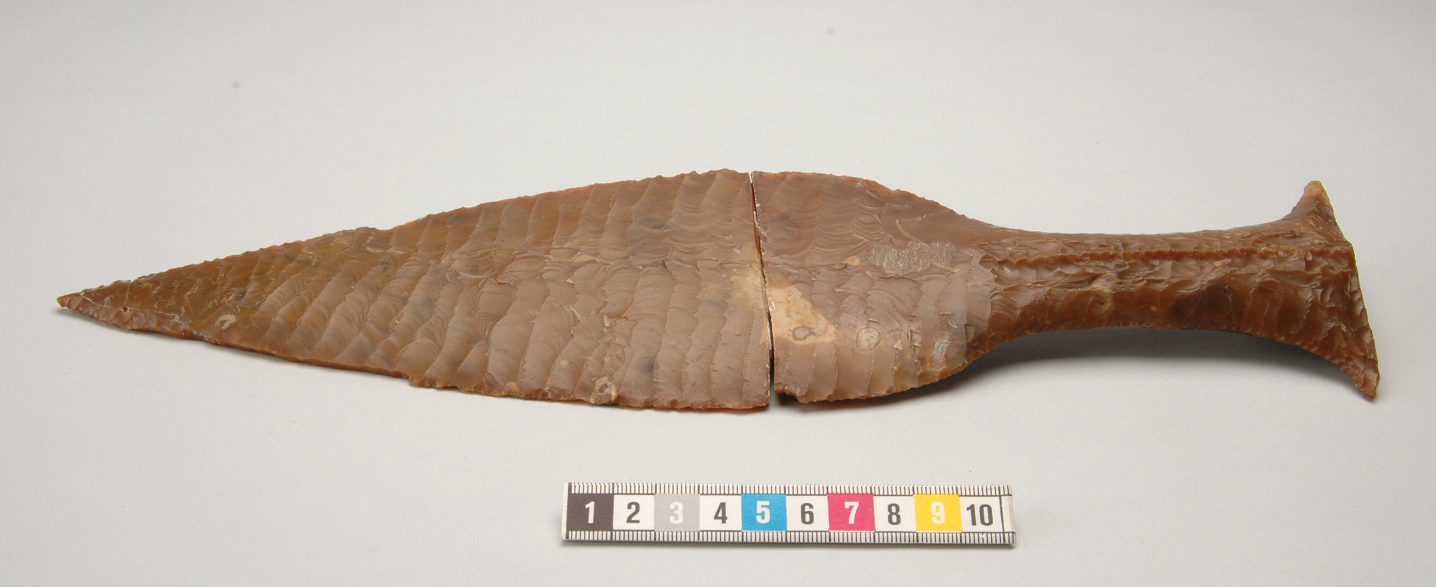 Ovanligt stor och bred parallellhuggen dolk av flinta. Har tresidigt utsvängt skaft med utpringlade sömmar.