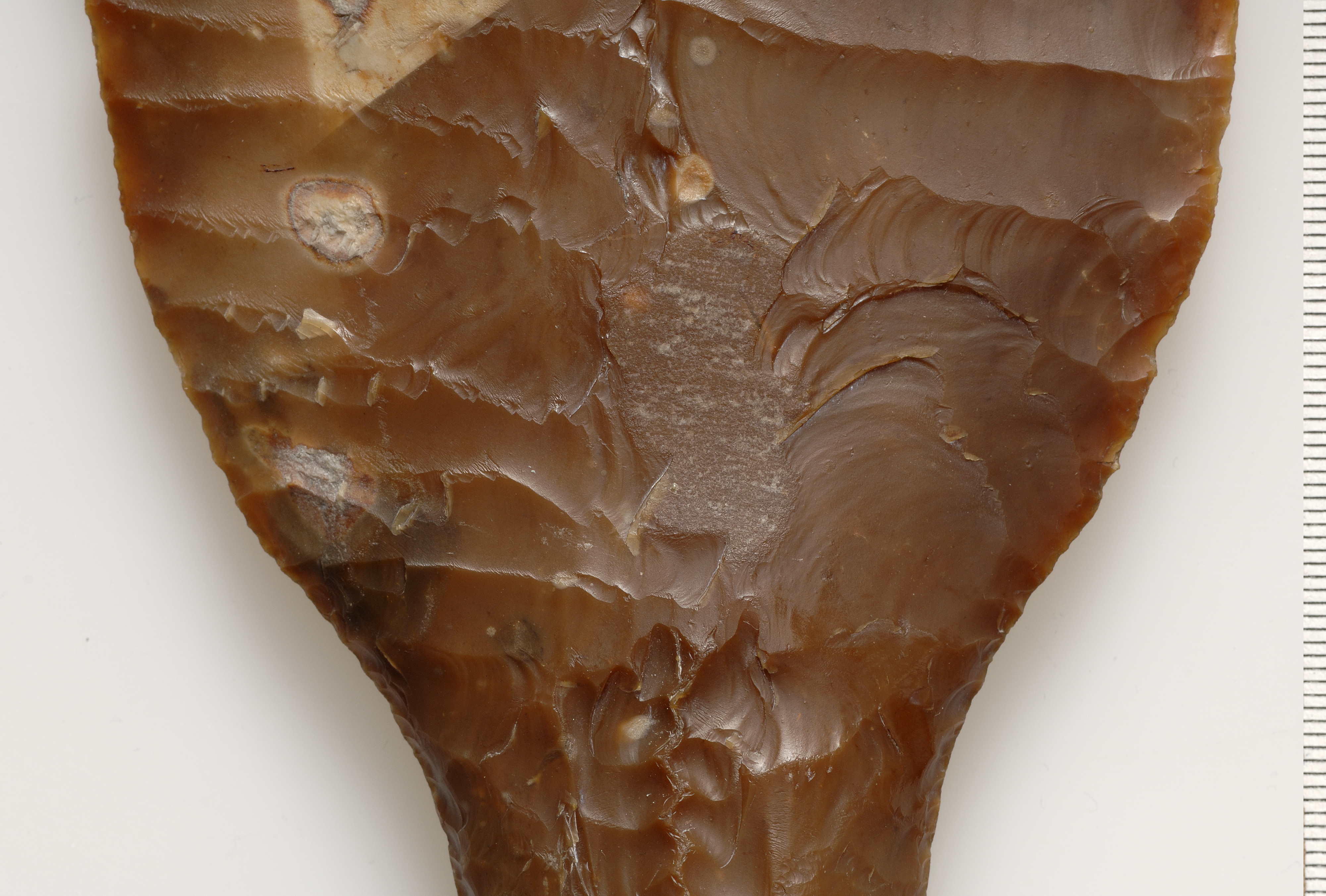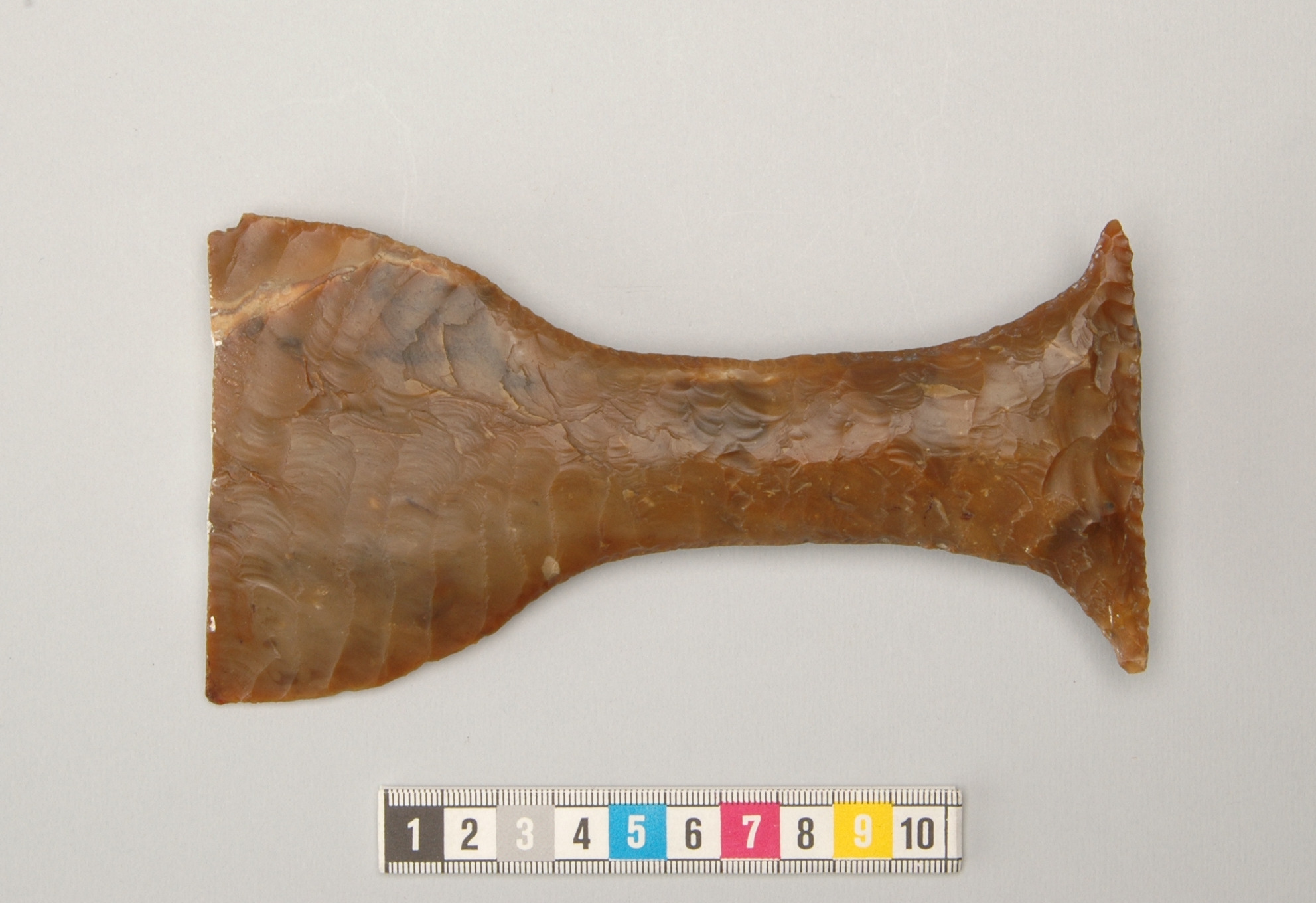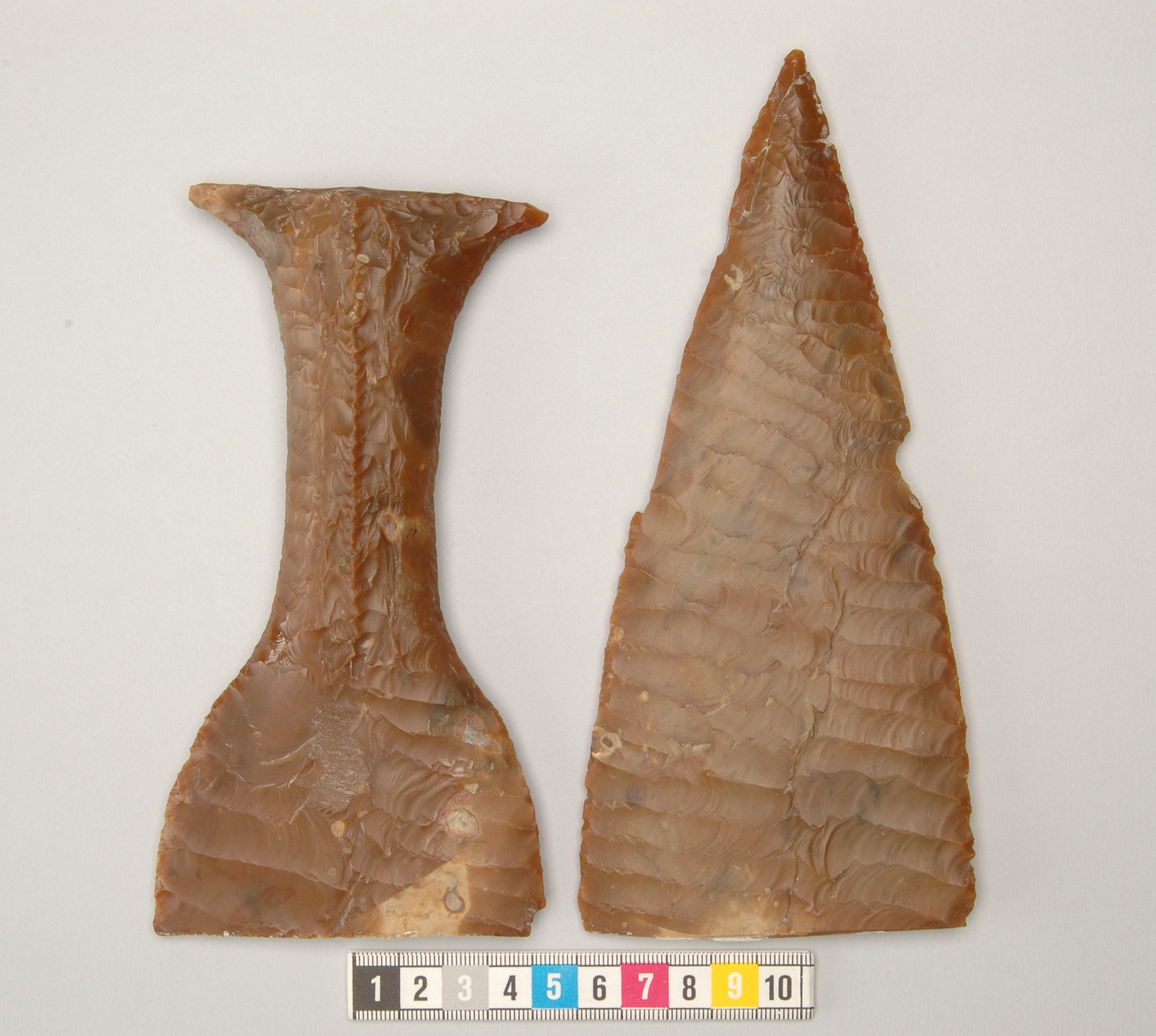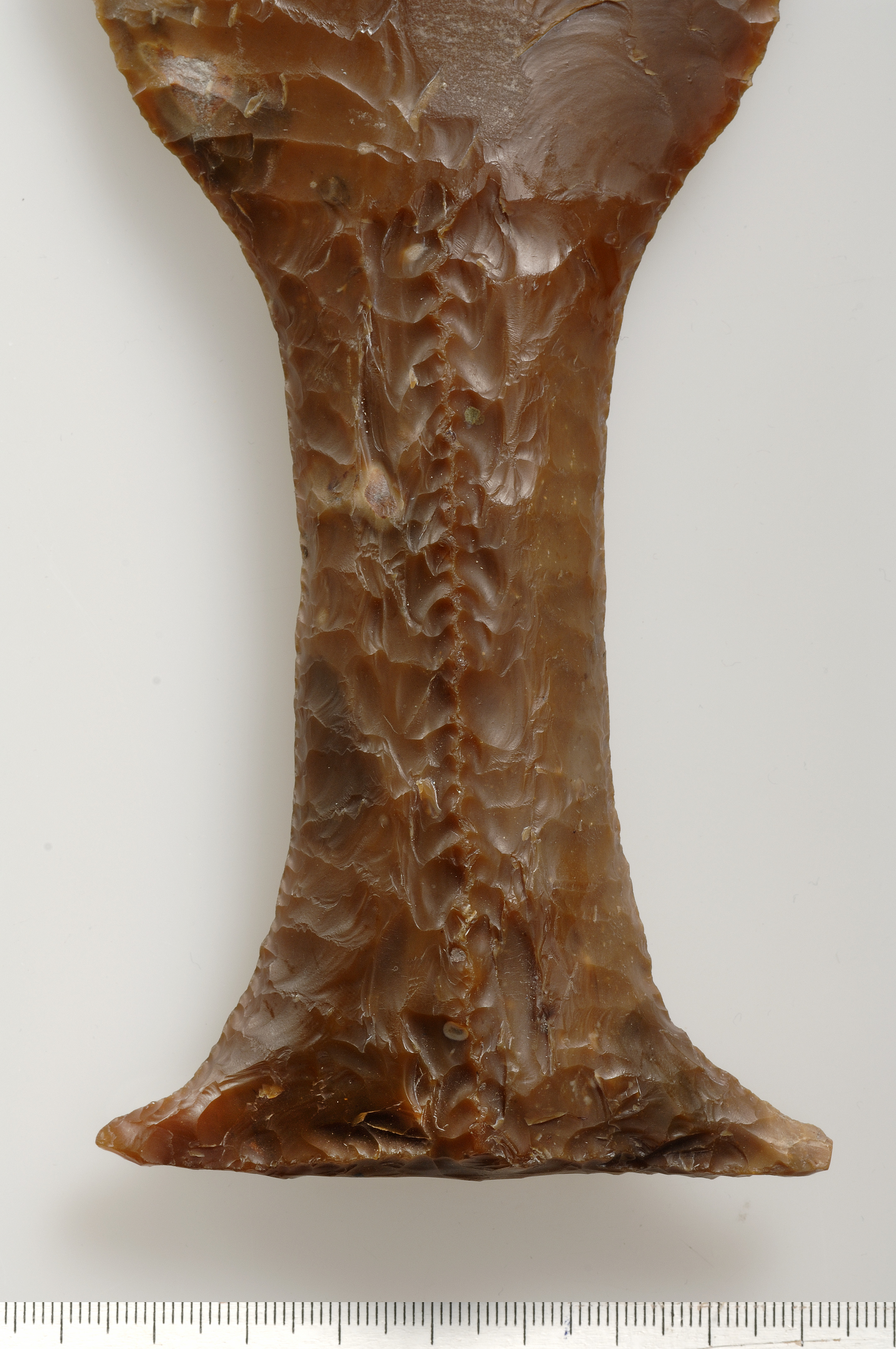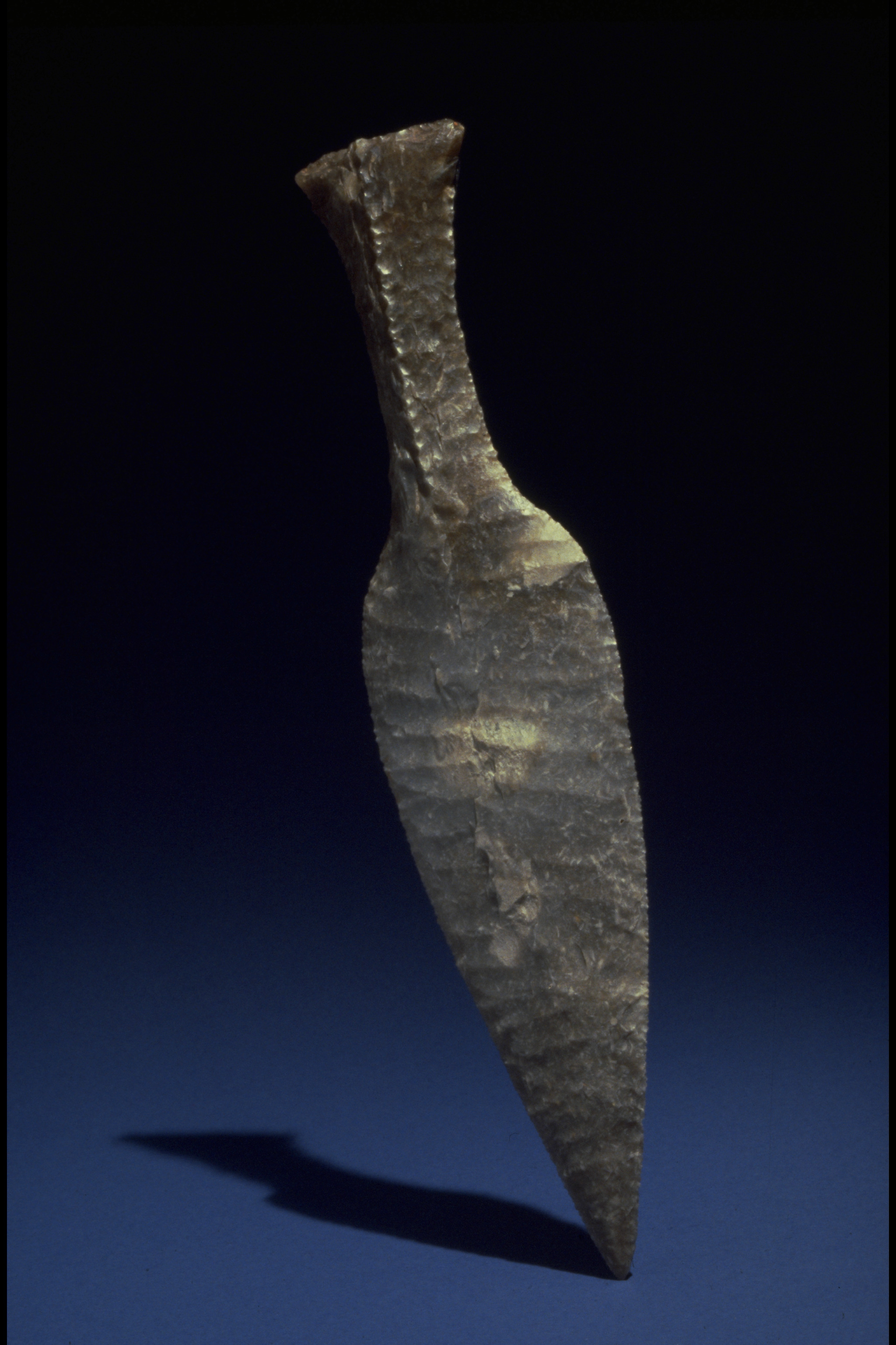 Ovanligt stor och bred parallellhuggen dolk av flinta. Har tresidigt utsvängt skaft med utpringlade sömmar.