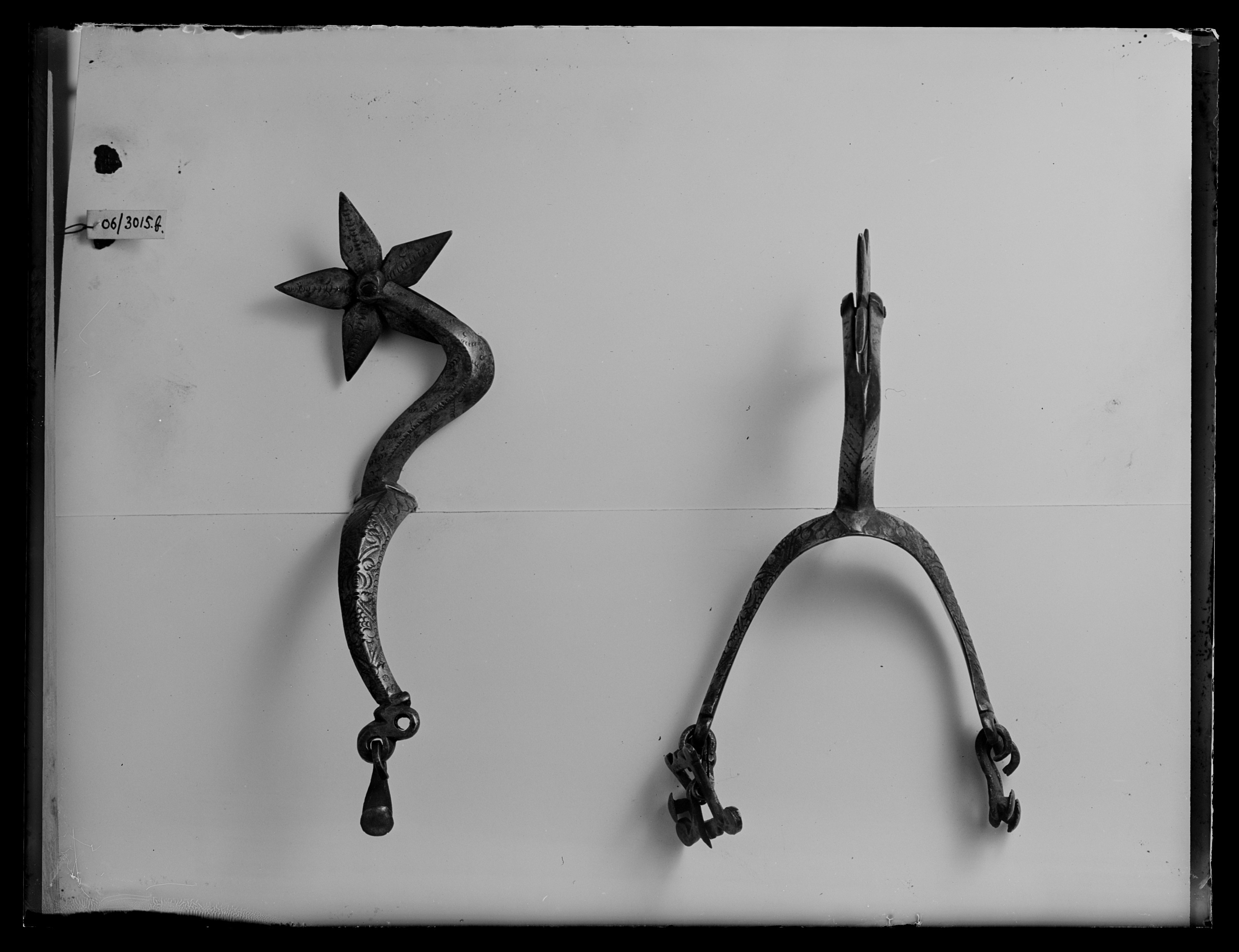 Sporre av försilvrad mässing. U-formade, något böjda skänklar, bredare baktill, smalnande mot ändarna. Skänklarnas utsida åsad och dekorerad med punsat, symmetriskt bladmönster. Ändarna böjda och med två hål vari på ena sidan en hake i ett av hålen av stål med knapp av mässing, på andra sidan en sölja med utstående voluter av stål och mässing, b: 41 mm och en hake av stål med knapp av mässing. Lång fyrsidig kraftigt böjd hals dekorerad med punsade streck och ringar.Stor femuddig klinga, breda avsmalnande uddar med dekor av punsade streck.