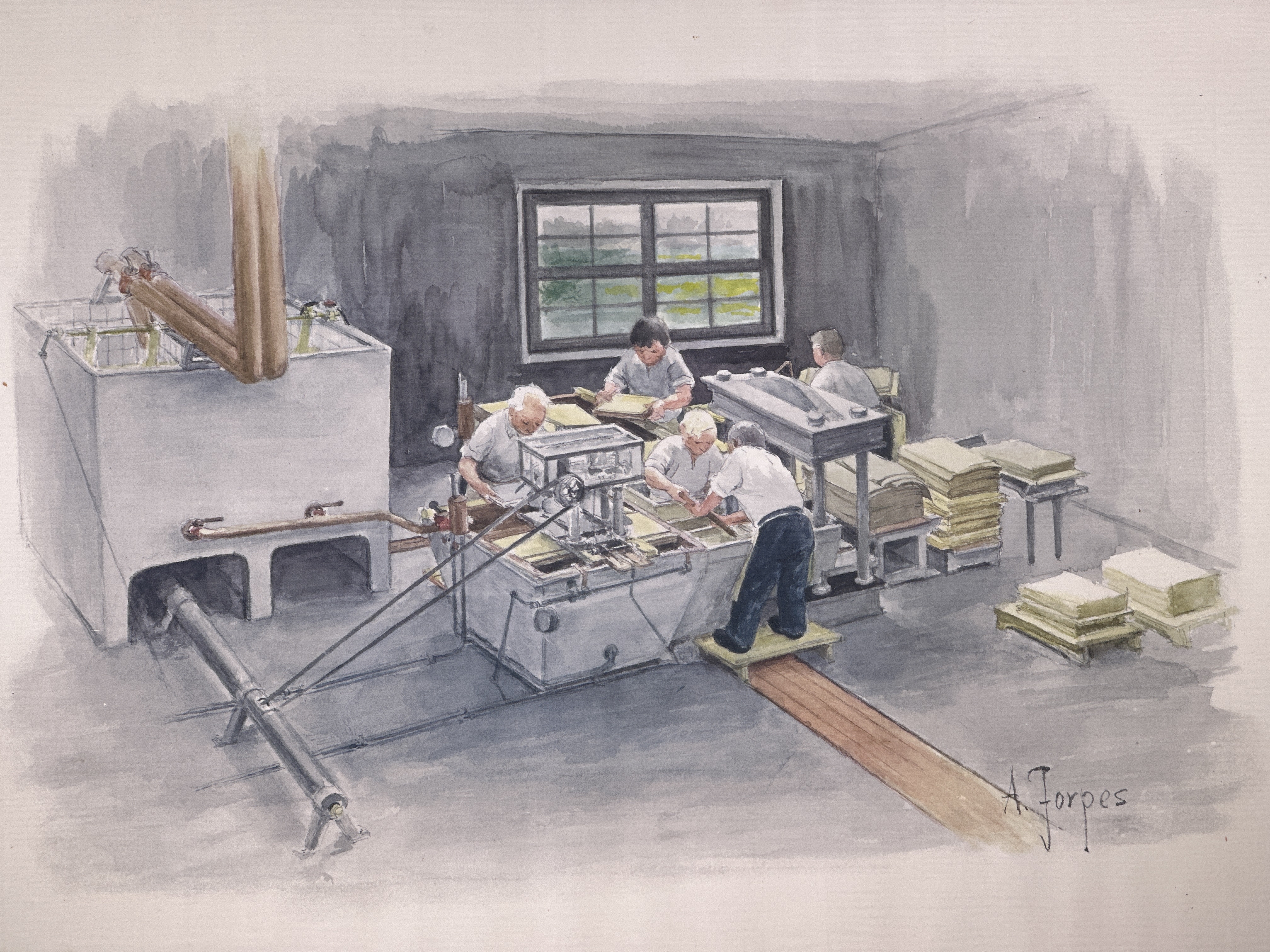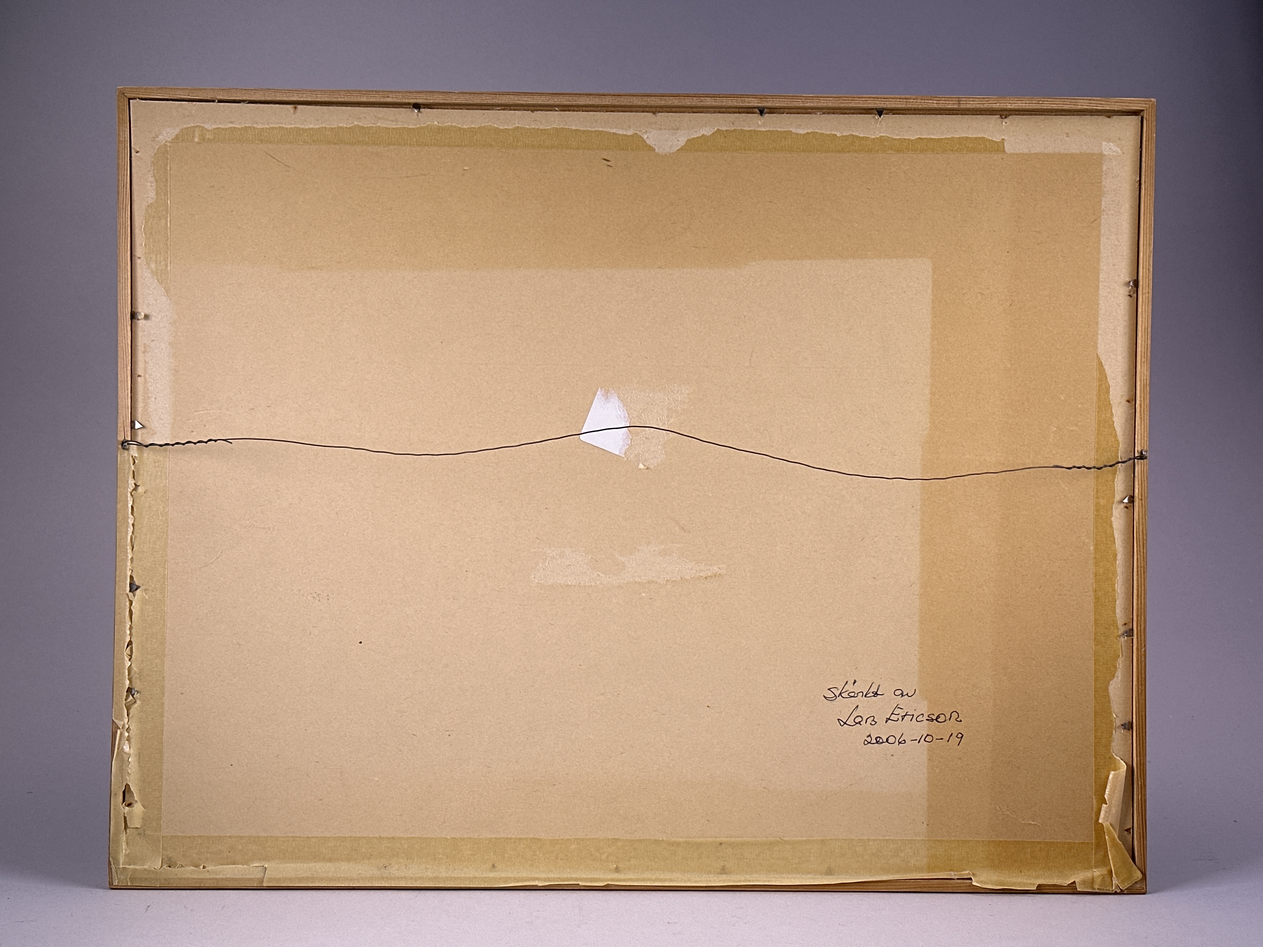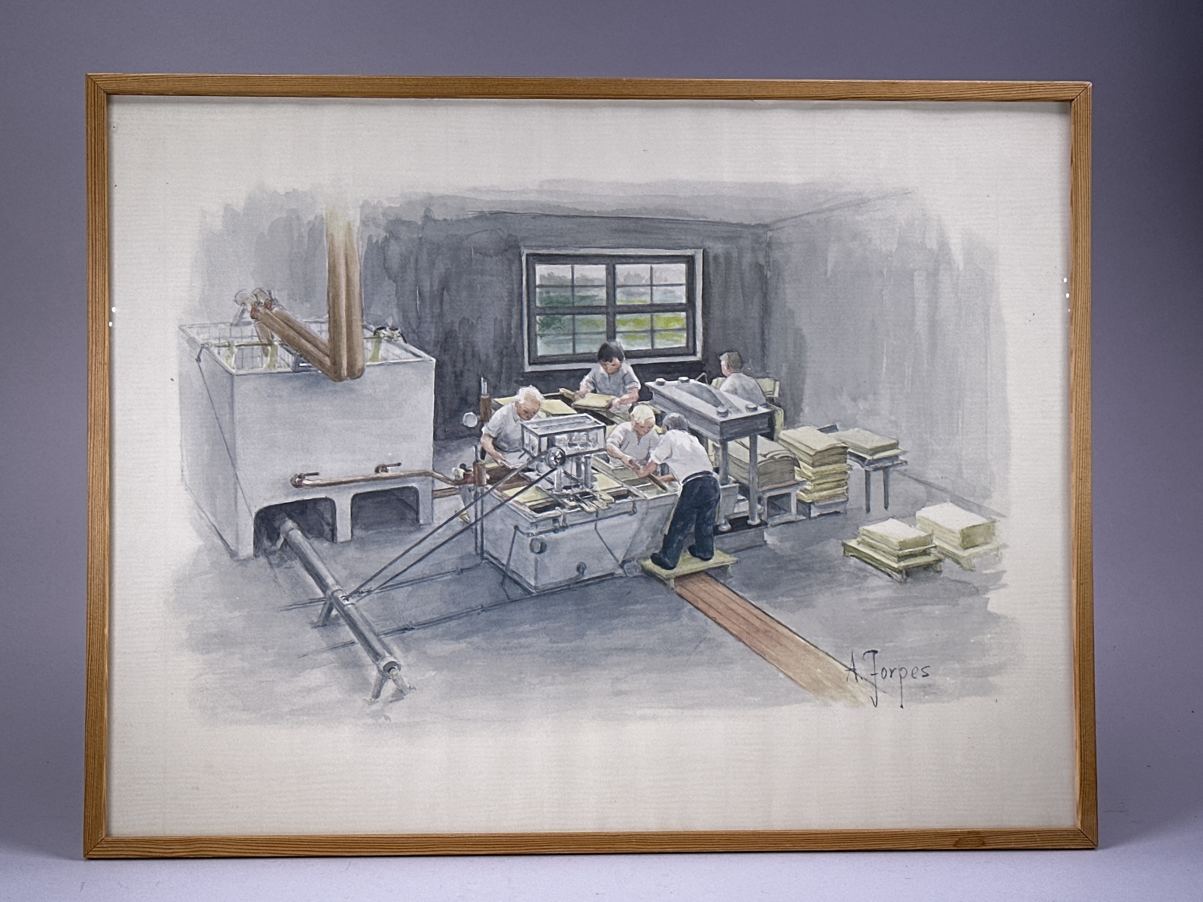 Tavla. Tryck på papper placerat innanför ram av trä. Ramen med framsida av glas och baksida av papp. Baksidan med metalltråd för upphängning samt påskrift i bläck: "Skänkt av Lars Ericson 2006-10-19". Tavlans motiv föreställande kyplag under handpapperstillverkning. Trycket baserat på en akvarellmålning av Albert Jorpes.