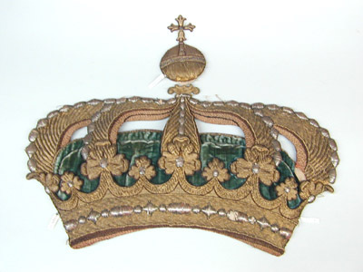 Föremålet av tre delar: krona, foder och äpple, äpplet ej fastsytt. Kronringen, 45 m bred, av guldlan är nedsydd med gult silke i läggsöm som bildar ett diagonalt spetsmönster. Därpå i relief föreställande stenar och pärlor av silverlan i klumpsöm. Kronringen kantad med en snodd tvinnad i guldlan och guldlanstråd. Kronringen har en insida som ger skuggverkan av löst tvinnad guldlan över en silkekärna. Från kronringen utgår 5 st synliga större och 4 st mindre spetsar av guldtråd nedsydd i läggsöm de två yttre i profil. Spetsarna slutar i var sin pärlform av guldlan med kontur i svart silke och guldlantråd, omgiven av blad av guldtråd nedsydd i läggsöm och konturer som ger skuggverkan av brunt silke. De mindre spetsarna omges av mindre blad av guldtråd nedsydda med, läggsöm i diagonalmönster. Fem synliga byglar utgår under bladornament av guldlantråd i läggsöm. Längs med byglarnas mitt pärlformer med guldlan i klumpsöm. På byglarnas insidor skuggning av silke i läggsöm. Foder i grönblå silkessammet. Byglarna avslutas med två voluter på vilka riksäpplet vilar. Riksäpplet krönt av korsglob av 4 st liljeblommor. Äpplet en glob med ring. Över globen är guldlantråd spänd.