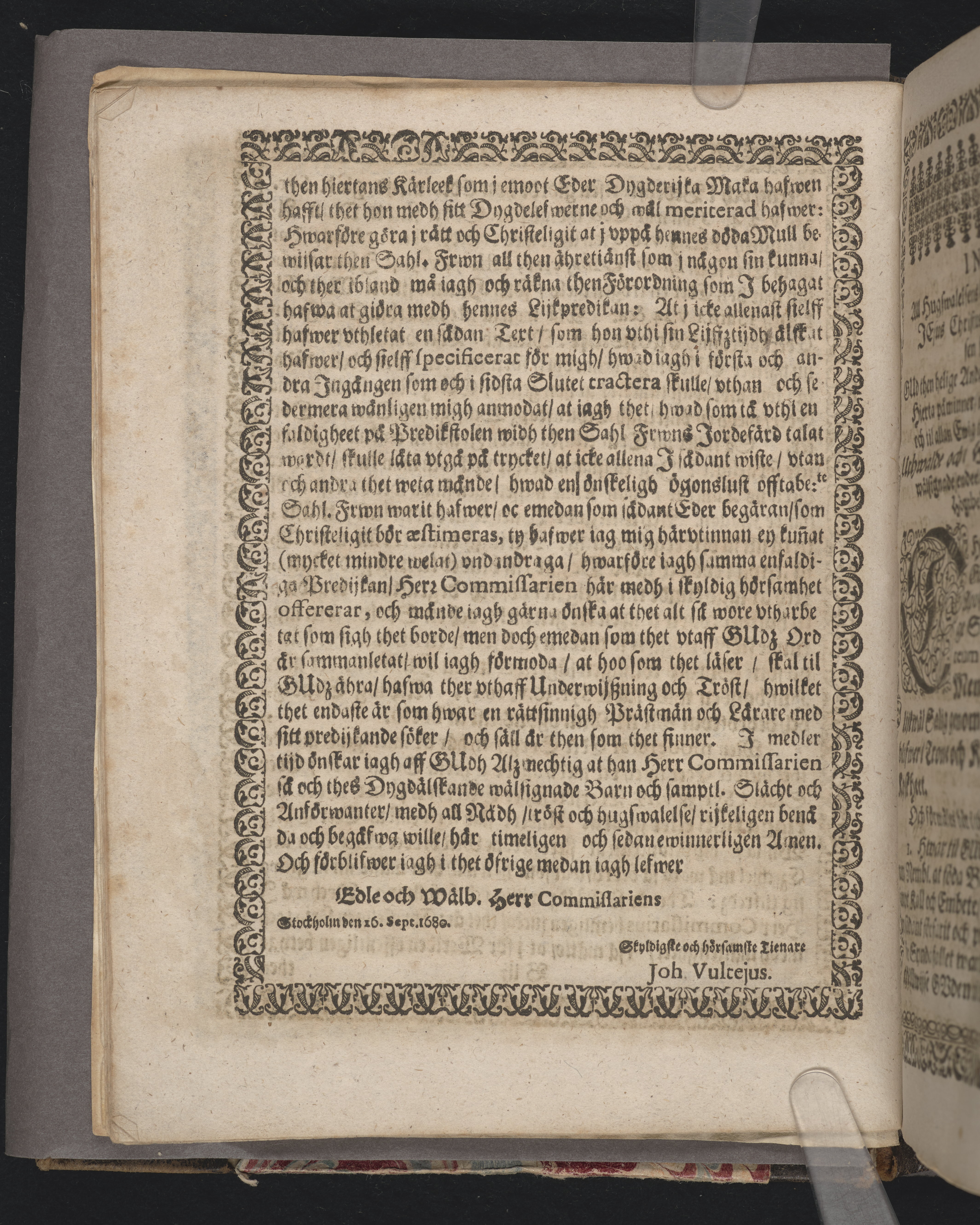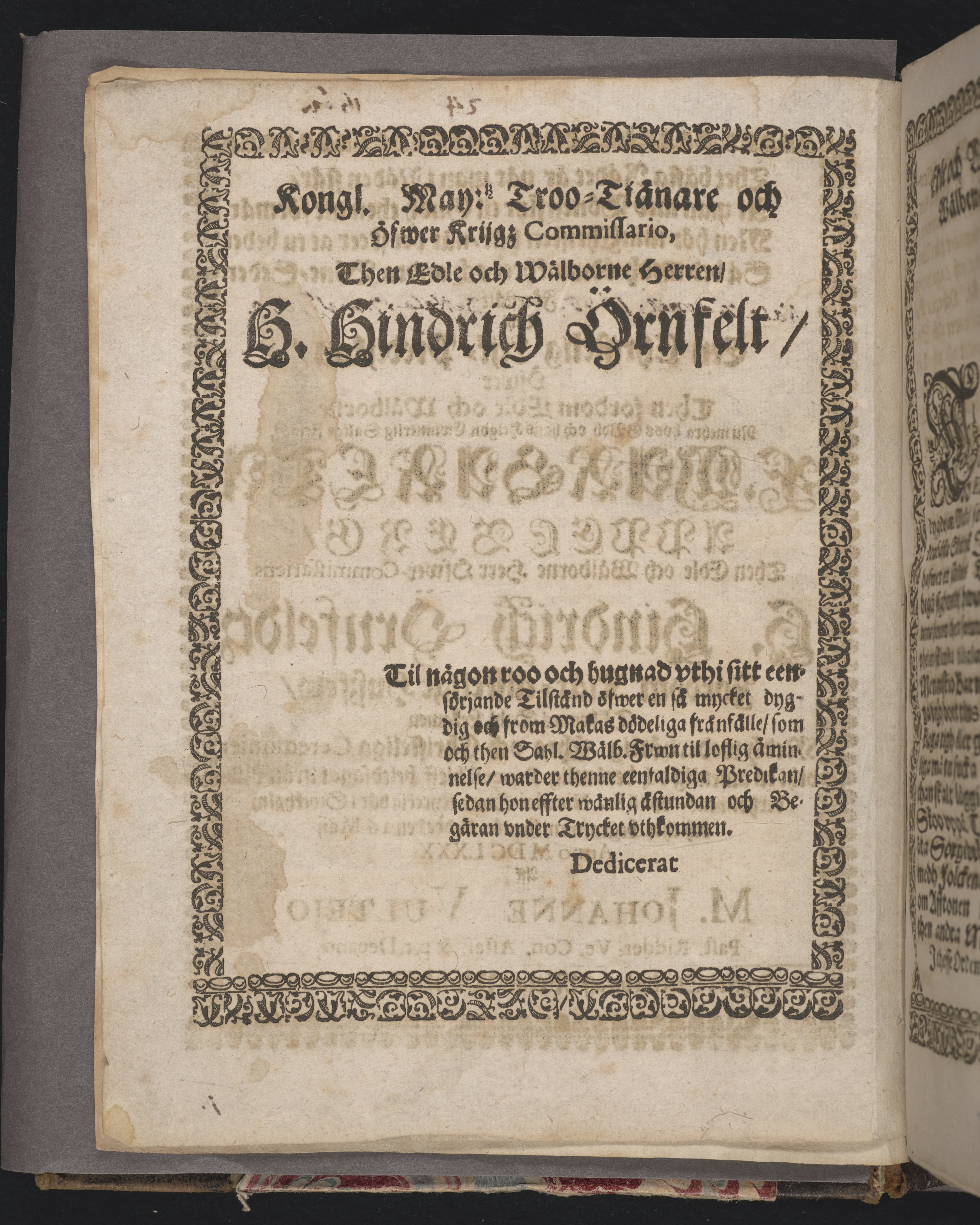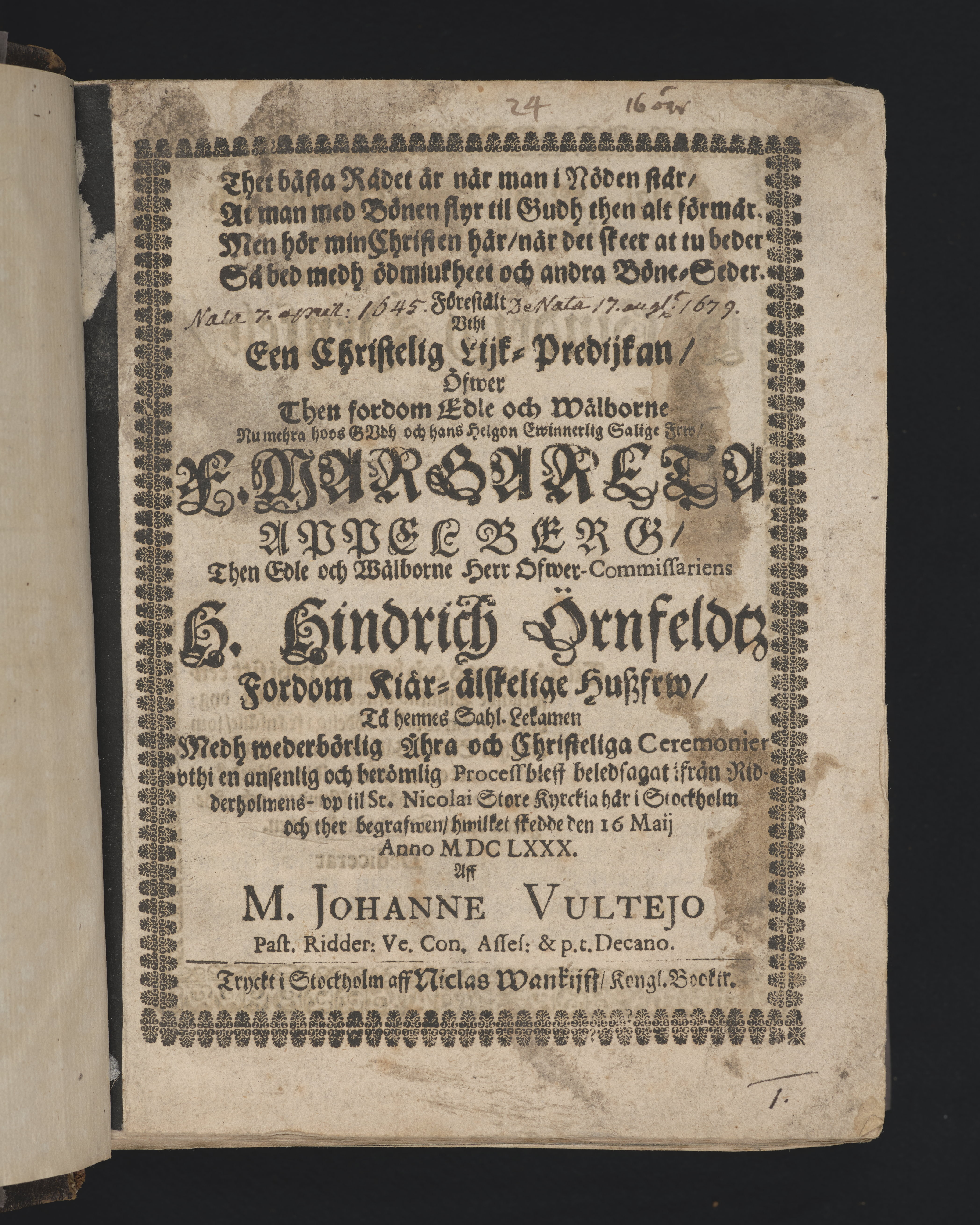 Thet bästa rådet är när man i nåden står ... Förestält vthi een christelig lijk-predikan, öfwer ... F. Margareta Appelberg, ofwer-commissariens H. Hindrich Örnfeldtz fordom kiär-älskelige huszfrw, tå hennes sahl. lekamen ... bleff beledsagat ifrån Ridderholmens- vp til St. Nicolai store kyrckia här i Stockholm och ther begrafwen, hwilket skedde den 16 maij anno MDCLXXX. aff M. Johanne Vultejo ... Tryckt i Stockholm aff Niclas Wankijff, kongl. booktr.