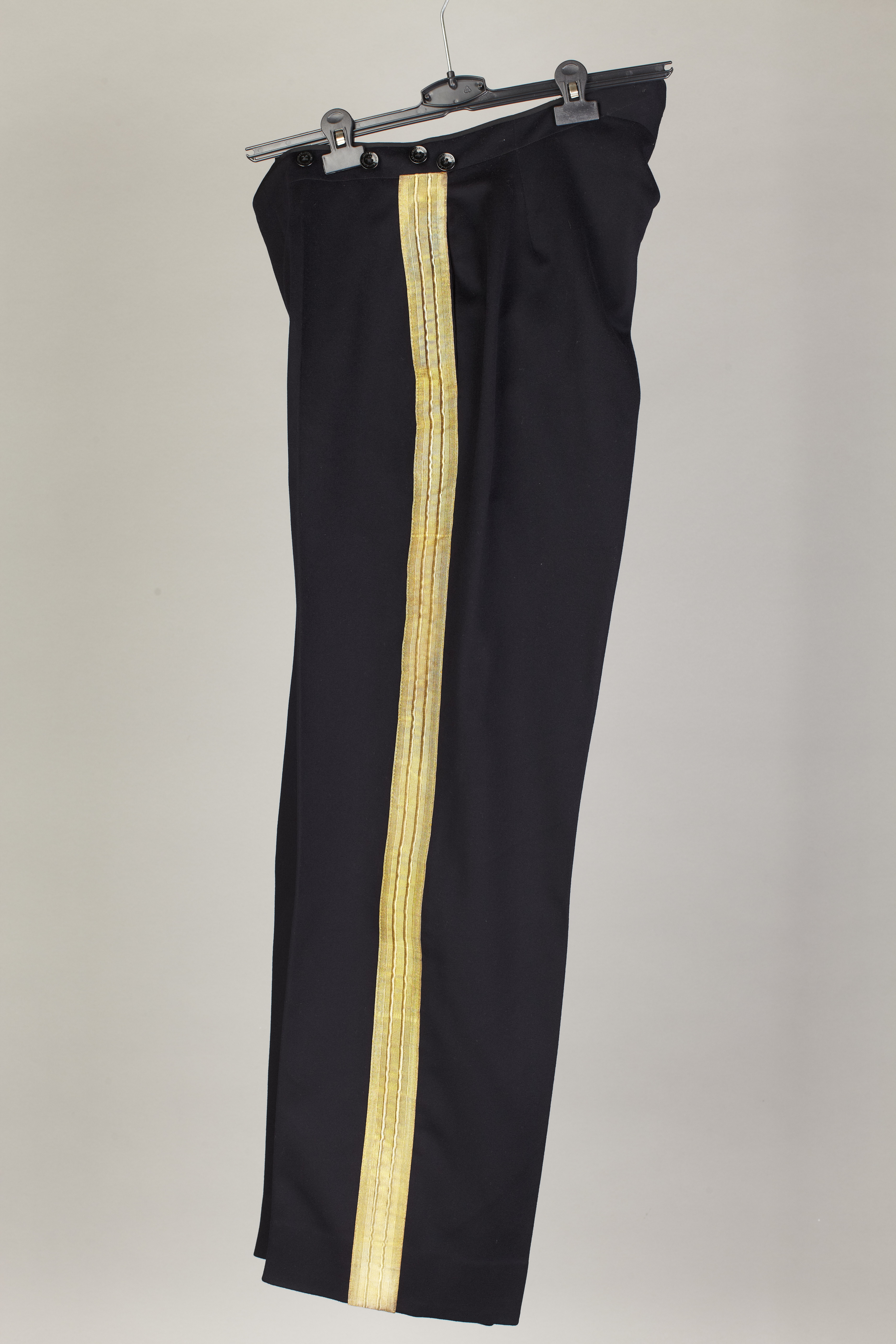 Långbyxor av mörkblått kläde med guldgalon, b: 45 mm, utefter sidsömmarna. Gylf med doldknäppning med fem mörkblå plastknappar, d: 15 mm, samt hake och hyska. Vid linningen sexknappar, mörkblå av plast, d: 18 mm med firmanamn: "J.M. JANSON&WALLGREN //STOCKHOLM". Vid byxsprundet invändigt två vita knappar som föregående. Sidsömsfickor, stolpficka medknapp bak. Linningsfoder av vitt siden, fickfoder av vit bomull. Framtill i fodret tvåljusblå band med tryckknappar, märkta: "NEWEY PAT.201430-22". Buren av Eric Adolf Hallin (1870-1965) utnämnd till kammarherre 1912.