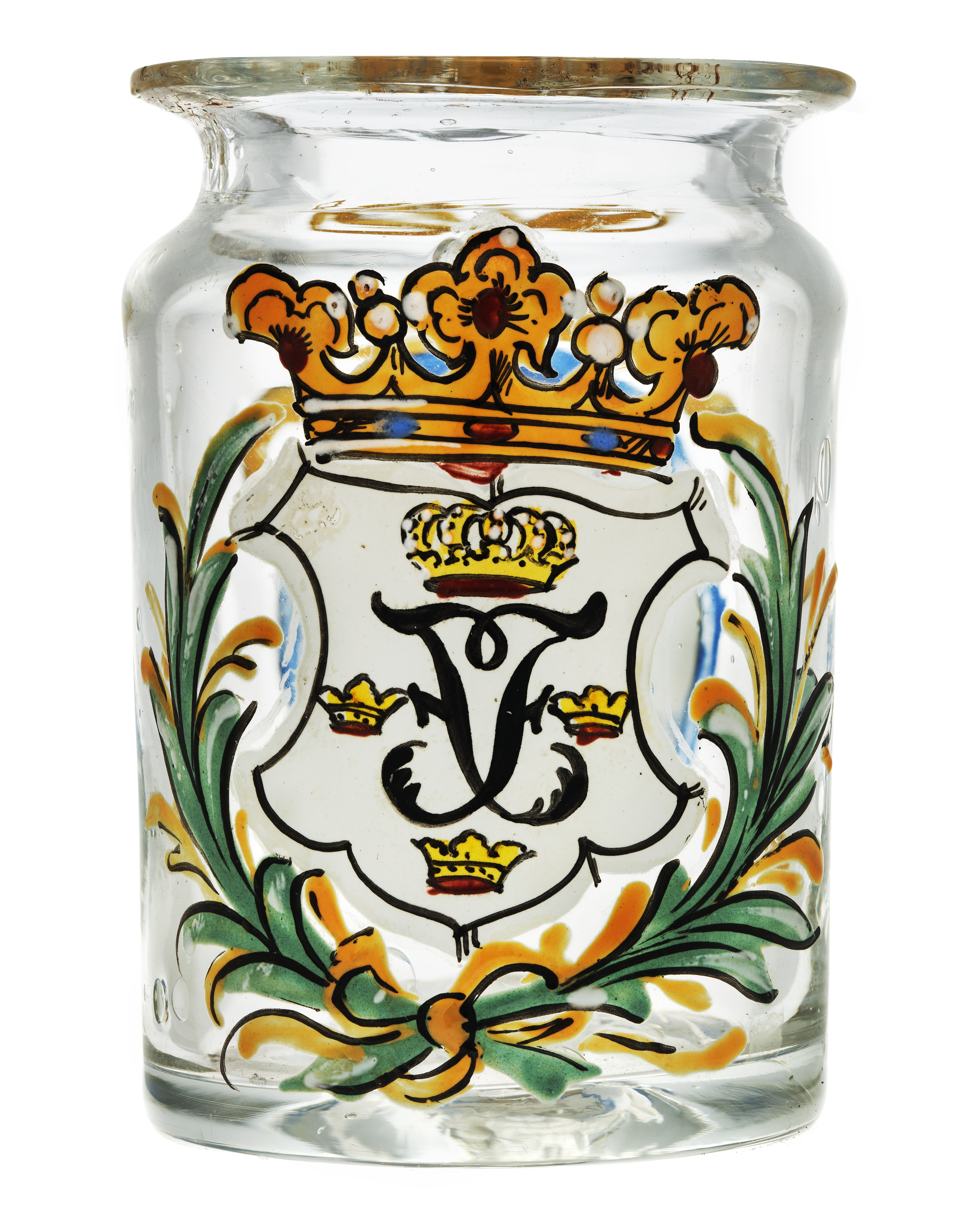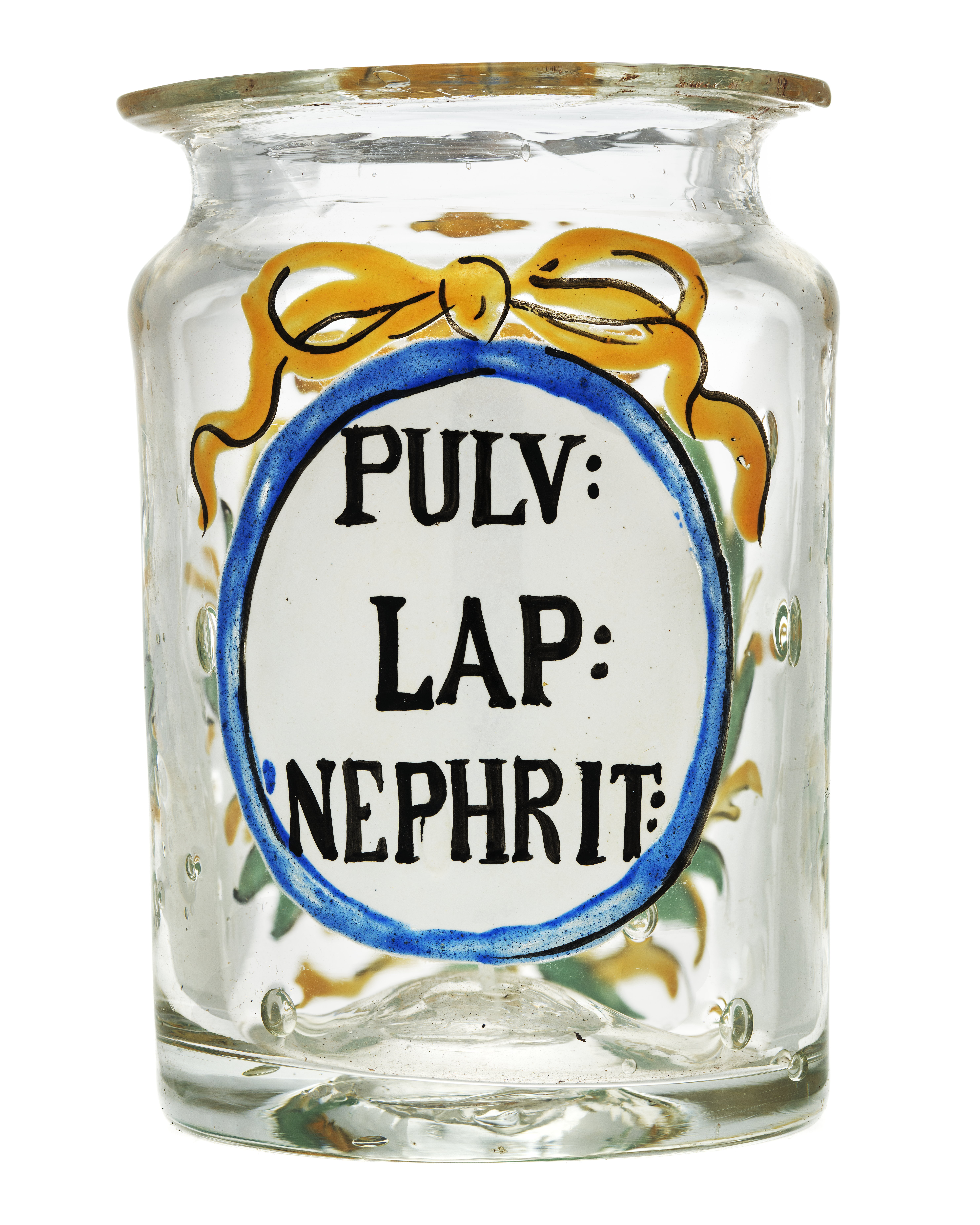 Tillhört Fredrik I, Sverige 1720-1751. Rund glasburk, svagt vidgad uppåt med något smalare hals med utsvängd kant för överbindning. Dekor i emaljmålning, på ena sidan en vit sköld, krönt av öppen krona i gult och rött, i skölden Fredrik I:s namnchiffer, spegelmonogram F (svart) krönt av en kunglig krona och omgivet av de tre svenska kronorna, allt i guld. Runt skölden en lagerkrans i grönt och guld. På motsatt sida en vit textoval med blå kant, upptill prydd med en gul rosett. I ovalen svart, latinsk text: "PULV:LAP:NIPHRIT" (pulv.lapis nephriticum, pulvriserad nefrit - använd både in- och utvärtes).