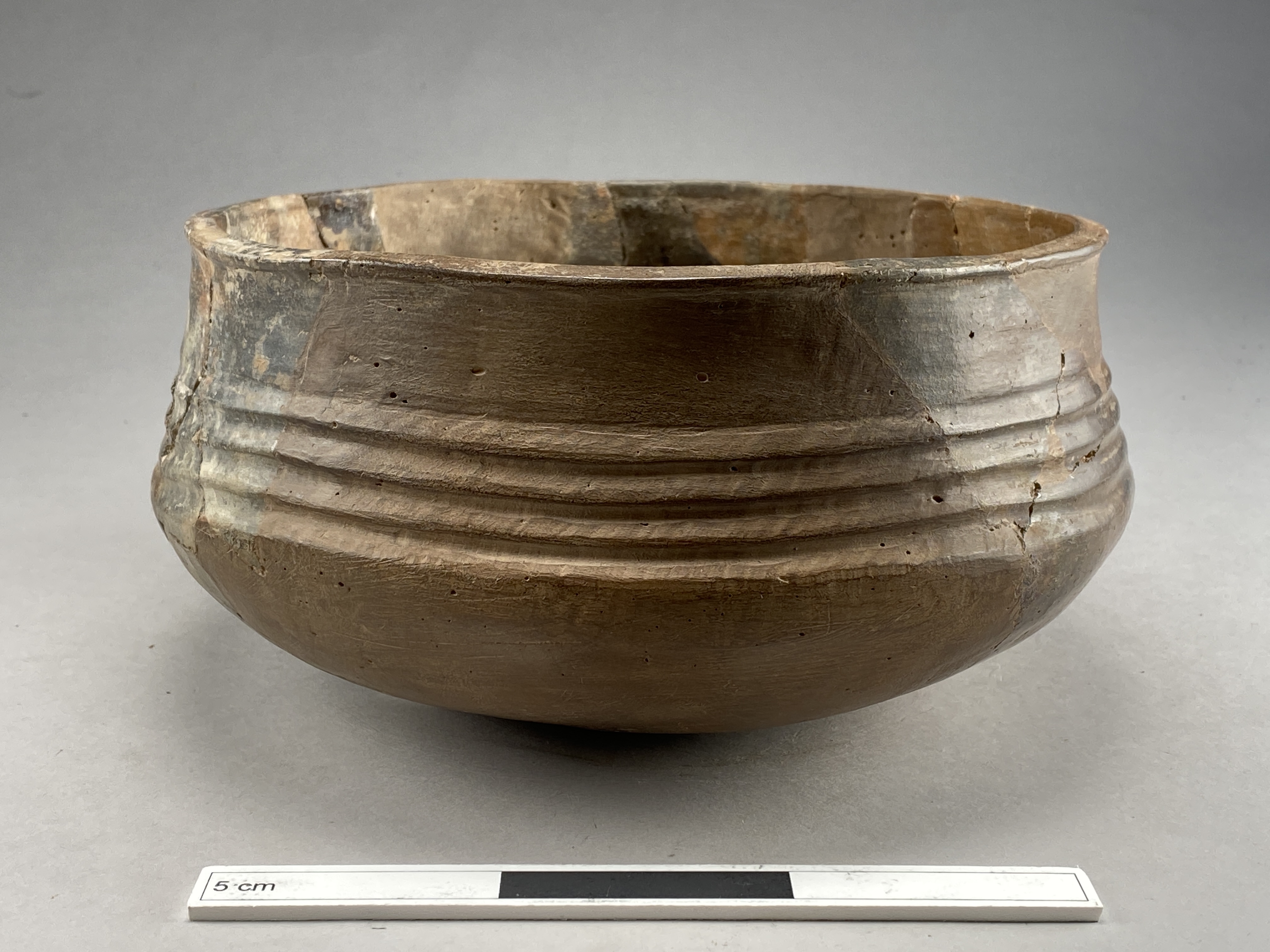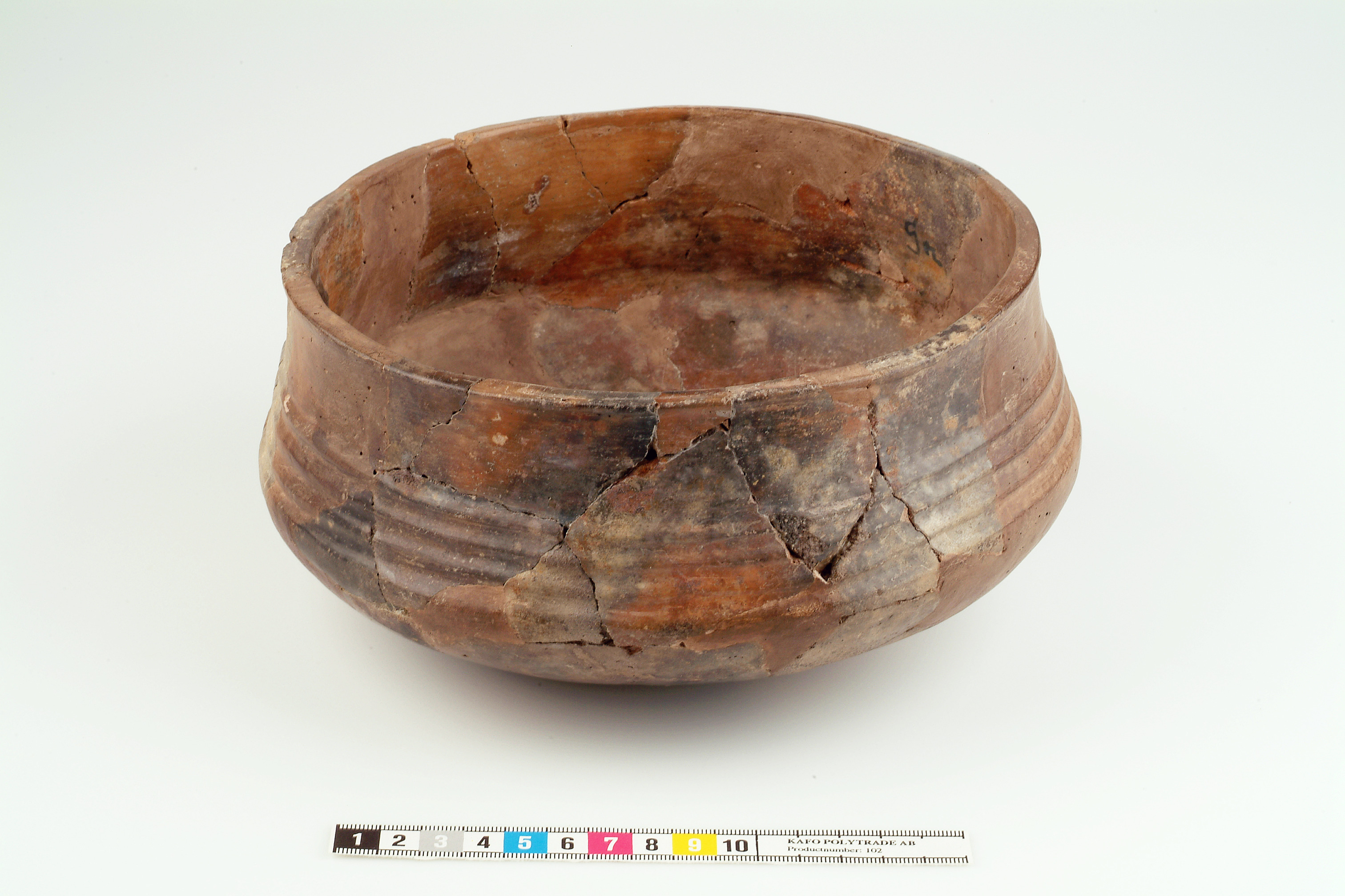 Keramikkärl av fint, fast gods. Ytan är brun och kraftigt glättad. Har horisontella ränder längs med buken. AIII-keramik