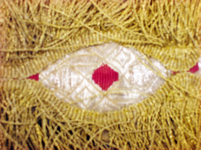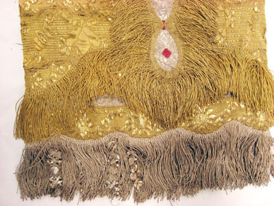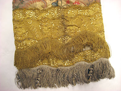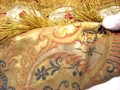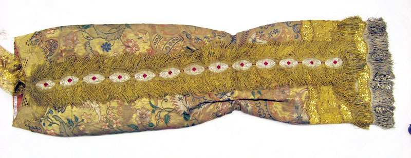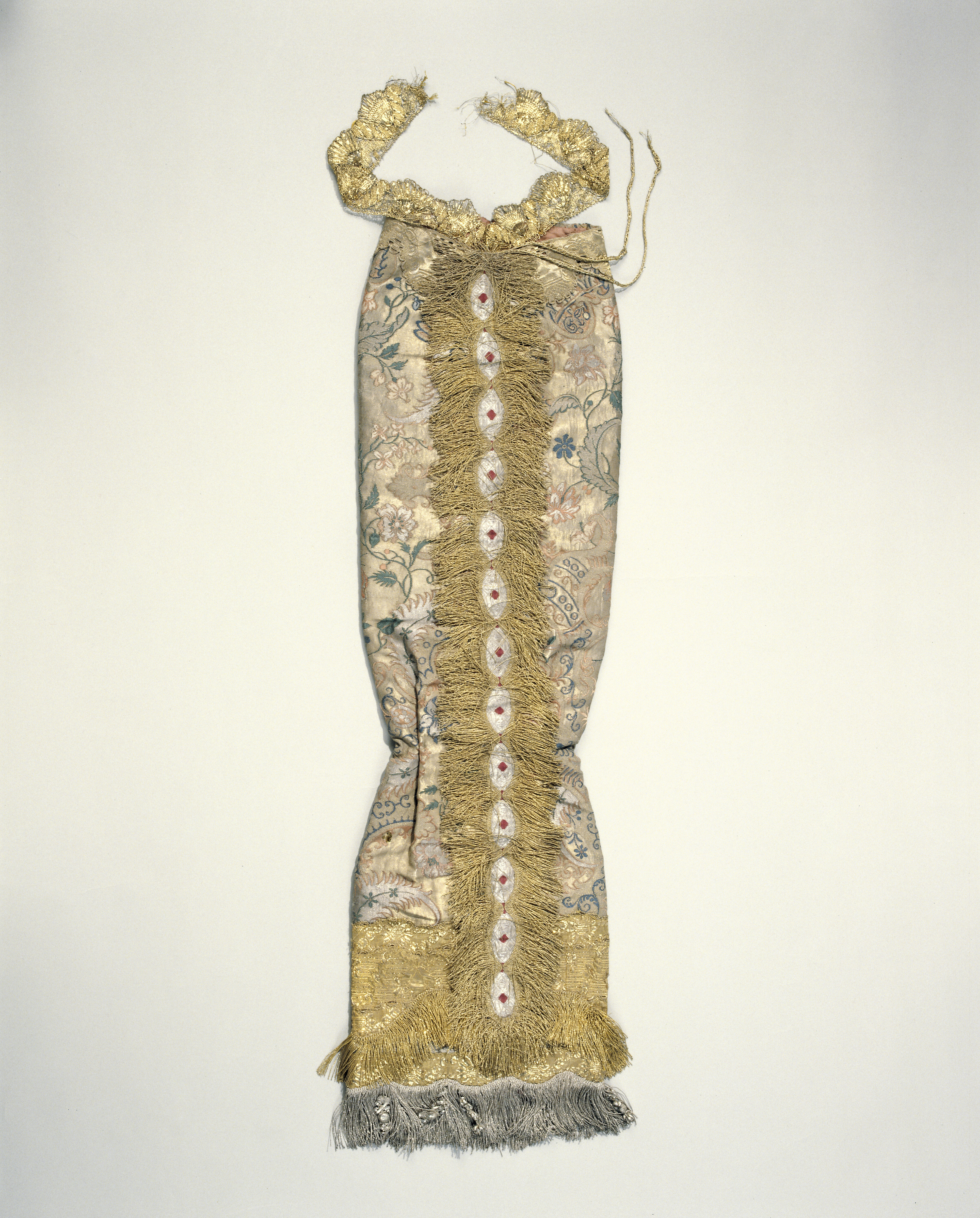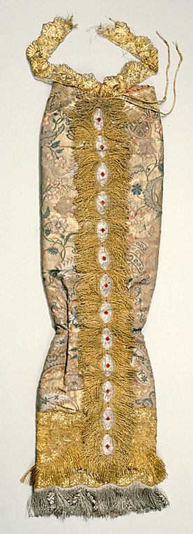 Doppåse vävd i blommig guldbrokad i färgerna röd, grön, blå och mörkt gul silkestråd. Längst upp är ett vävt band i guldtråd. På mitten är ett inramat dekorfält bestående av 13 stycken romber vävda i rött och silver i ripsteknik. 18 cm från nederkanten är påsen insydd (18 mm ) på båda sidor, så att den får en insvängd form. Nertill är en 105 mm bred vävd dekor, som består av ett vävt band i guld med virad silkestråd. Under denna följer en 595 mm lång guldspets samt ett flätad band , 640 mm långt, gjort av tvinnad och virad guldtråd. Påsen avslutas nertill med en silverfrans, 70 mm lång, med sju stycken 45 mm långa buljoner. Påsen är fodrad med rött sidentyg vävt i tuskaft.