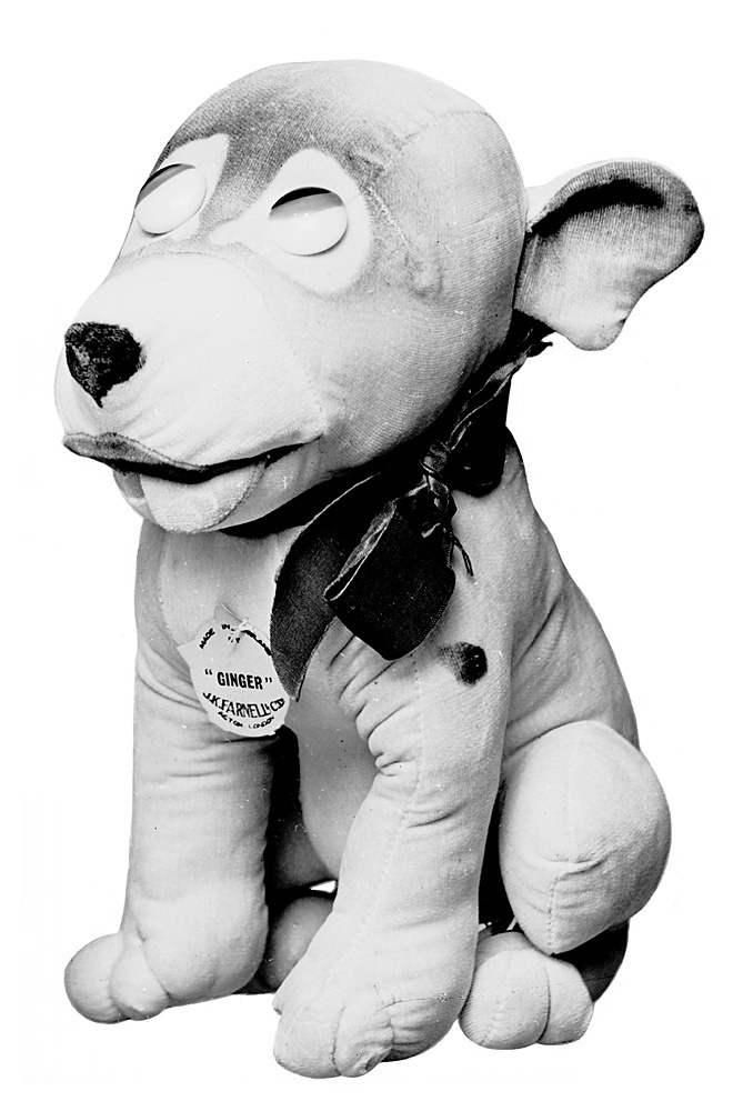 HUND Av ljust gulröd sammet, mjukt stoppad. Sittande, med stort huvud, nos, bringa och buk i vitt, bred mun med tungan något uthängande vid vänstra sidan, svartbrun nosspets, stora ögon av porslin med svart pupill och gul iris samt starkt vända åt högra sidan, utstående stora öron med gredelin insida samt stubbsvans; kring halsen ett rött sidenband, knutet i rosett vid vänstra sidan. På bringan en påfäst ljust blågredelin papplapp, varpå i svart tryck, på fram- och baksidan. Höjd: ca 23,5 cm. Engelsk tillverkning från 1920-talets mitt. Gåva till Wilhelmina von Hallwyl, julaftonen 1927 från hennes dotter Irma von Geijer.