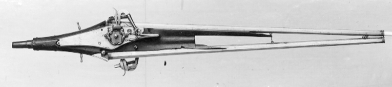 Rund, slätborrad pipa av stål med svarvad ring vid mynningen samt vid kammarens framände. Vid pipbasen en profilerad, hög ring. Kammarens ovansida kantig med smala kantlister, fältens ändar rundade. Rektangulärt svansskruvblad till kolvkulan, l: 165 mm. Stämpel: Vid pipbasen på ovansidan en sköldformig stämpel med spegelmonogram G C över stjärna (LRK vägl.1921:241.) Riktmedel: Vid pipbasen en filad siktskåra. Fästning: Tre häften. Pipan fäst med två ej ursprungliga pipstift av trä. Hjullås av fransk typ med plant låsbleck med fasade kanter, nedsvängt vid hjulet, välvd bakände med konkavt urtag på spetsen. Utvändigt hjul fäst med studel kl. 9, hjärtformig platta, rundat, droppformigt löv med liten ändkula. Fängpanna med svängd gavel och låg krutskärm, streckdekor. Fängpannelock med rörlig arm, slätt, tvärt avskuret fingergrepp. Tryckknapp saknas. Hane med balusterformig kropp. Fyrsidig hals med svängd framkant, lös underkäke, tvärt avskurna käkar, käkskruv med fyrsidigt huvud. Hanfjäder med fasningar på mitten, streckdekor på ändarna, timglasformig studel, välvt fjäderlöv med nit. Hjulaxeln lagrad i sidblecket. Fästning: En, urspr. två låsskruvar. Svagt böjd avtryckare till h. om underbeslaget. Helstock av trä, böjd kolv med fiskstjärtsliknande, kluven kolvände. Nästan yttäckande dekor av tunna mässingstrådar i lister och bladslingor, infällda pärlemorplattor med grov, graverad dekor i form av fåglar(?) och blad. Vid slagfjäderns fäststift urspr. två benplattor med bladdekor, den v. bortfallen. Beslag: Pipstiftbrickor av ben med streck-och rutdekor, två återstår på v. sida. Svängt sidbleck av stål med lagerhål för hjulaxeln. På kolvens undersida beslag med pilspetsformig framände, rektangulärt hål för slagfjäderns ände. Bandformig varbygel fäst med skruv i framänden, bakänden inskruvad i beslaget. Tillbehör: Laddstock av trä, l: 502 mm, (ej ursprunglig).