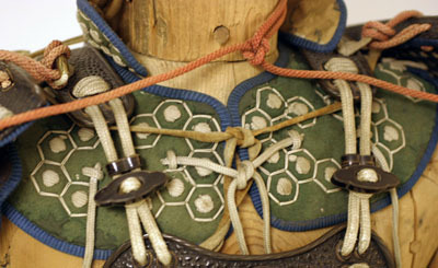 Västliknande plagg med hög krage för nacken, att bäras under bröst- och ryggskydd. Av grönt kläde med dekor av sexhörniga fällt med i mitten knapp av vit silkestråd. Under klädet tätt placerade plattor av horn eller ben.