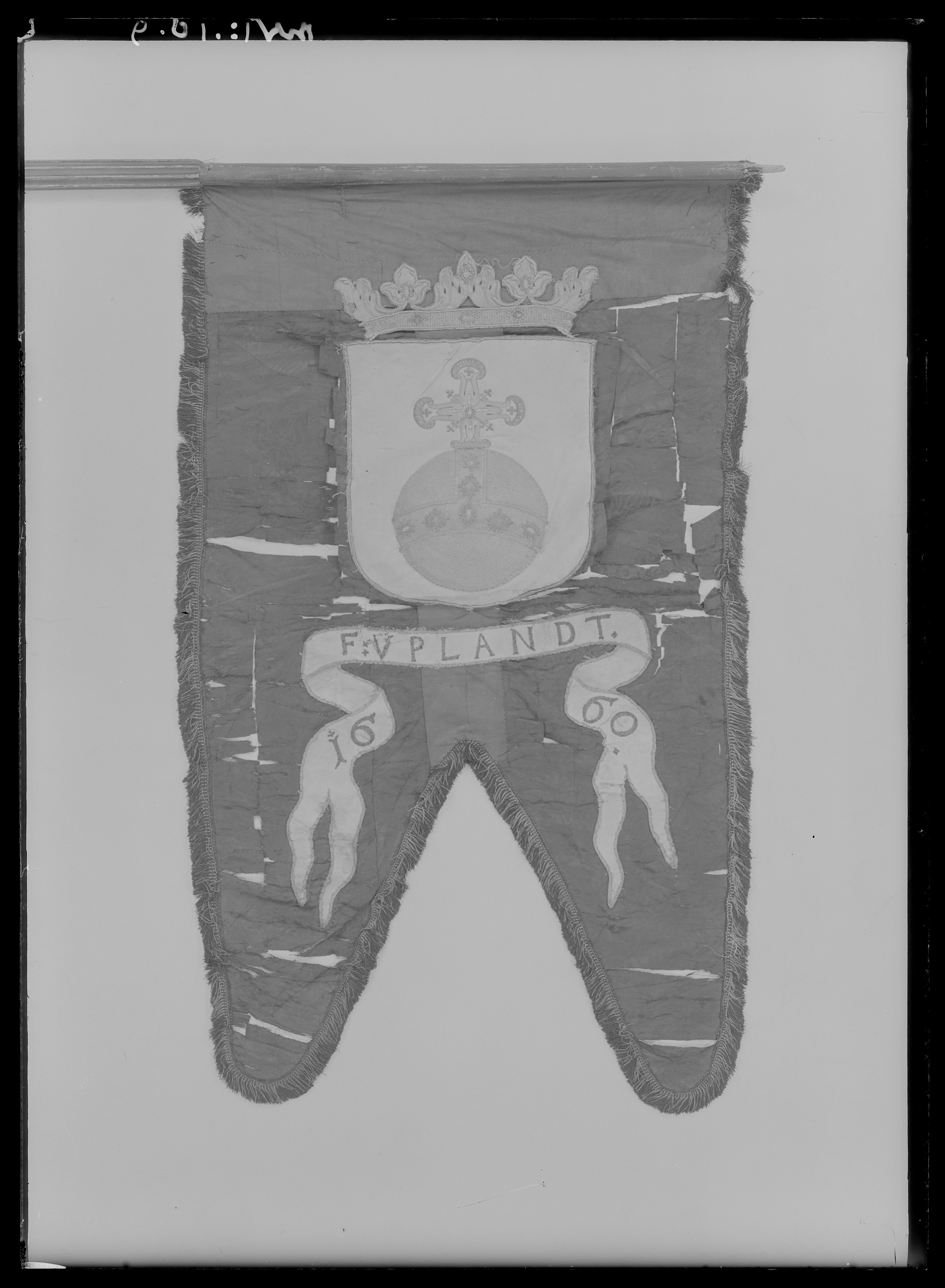 Broderier av Friedrich Feuerbrun. Duk av svart sidendamast, tvåtungad, kantad med svart silkesfrans med guldinslag, bredd: 25 mm. Dekor: på båda sidor applicerade vapensköldar, på rödsidenatlasbotten Upplands riksäpple i mycket hög guldbroderirelief. Vapnet krönt av en grevekrona. Under vapnet språkband av vit sidenatlas med broderad text i svartsilke med guldinslag "F: VPLANDT // 1660". Stång av svartmålad furu, kannelerad med spår av förgyllning på ribborna. Slätt handgrepp.