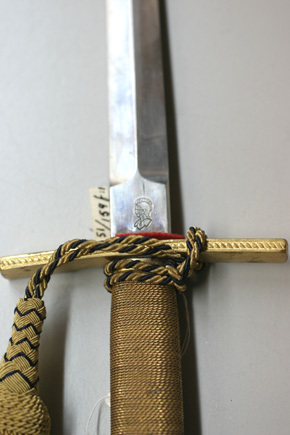 Modellenlig. Korsformigt fäste av förgylld mässing. Knapp med samma tvärsnitt, enkel streck- och repstavsdekor, plan ovansida med tre kronor, i mitten skruv. Något uppåtsvängd parerstång med rektangulärt tvärsnitt, repstavsdekor längs kanterna, ändarna tvärt avskurna och något rundade. Tämligen jämntjock kavel med ovalt tvärsnitt, lindad med tvinnad mässingstråd. Klinga rak, tvåeggad med mötande, jämnbreda skär med oslipat basparti, på ena sidan firmamärke i form av en sluten hjälm. Stötlapp av röd filt.