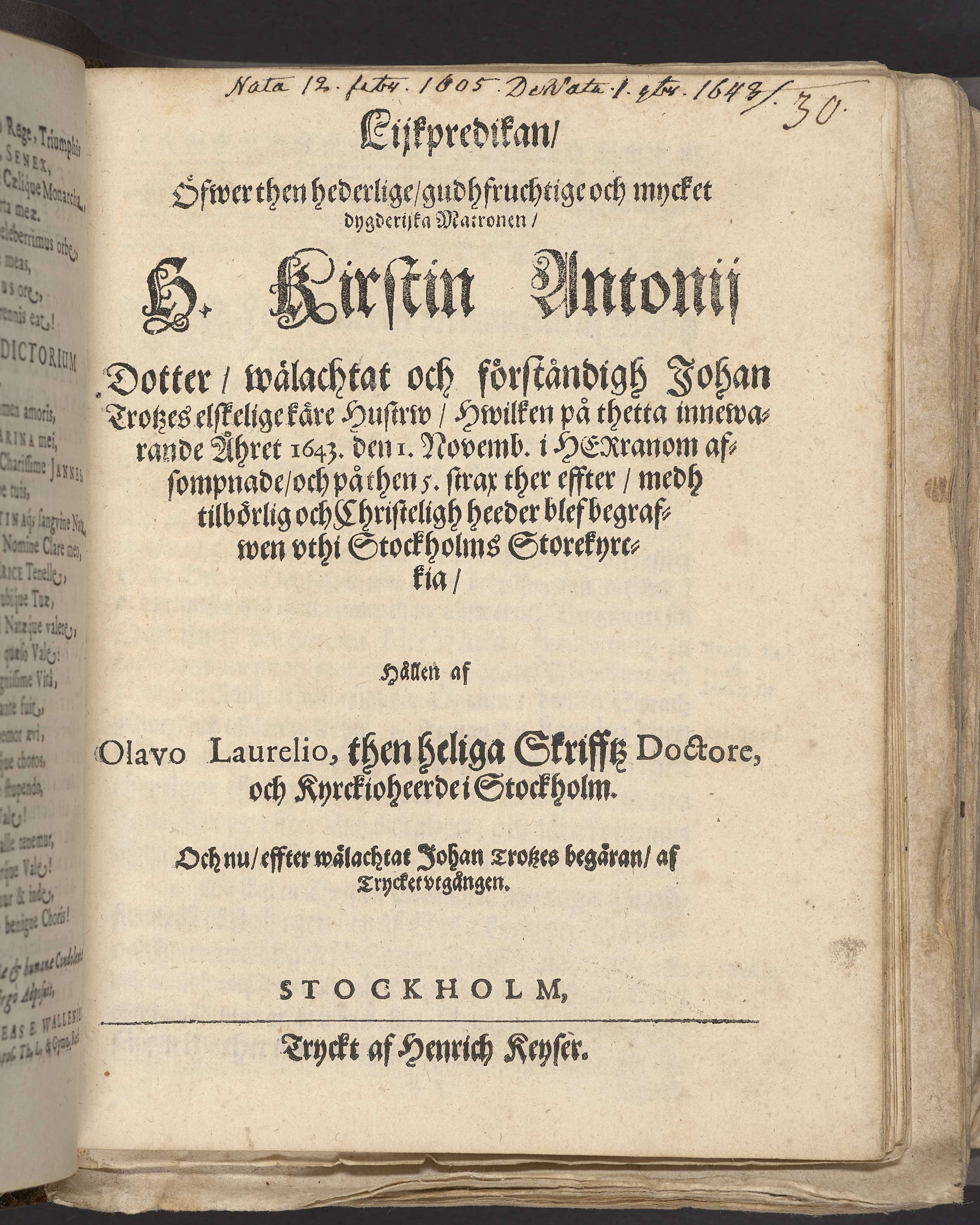 Lijkpredikan, öfwer ... H. Kirstin Antonij dotter ... Johan Trotzes elskelige käre hustrw, jwilken ... 1643 den 1 novemb ... afsompnade, och på then 5 strax ther effter ... blef begrafwen vthi Stockholms Storekyrckia, hållen af Olavo Laurelio ... Stockholm, tryckt af Henrich Keyser.