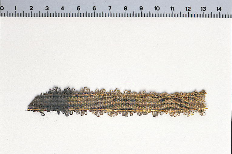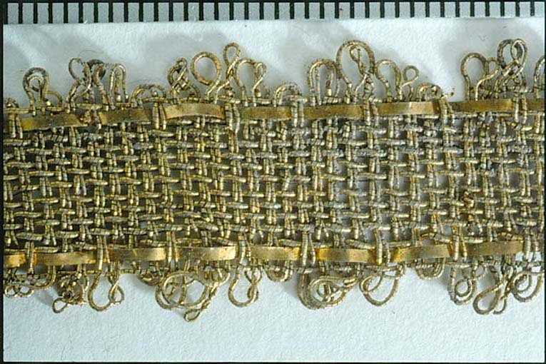 Bandet är missfärgat i ena änden, annars är guldglansen hög. Fragmentet ingår i en samling fragment tagna som prov ur drottning Kristinas kista vid gravöppningen den 13-14 december 1965. Varp: 2 trådar z-spunnet silke, 1 slätt guldlan, därefter 10 st trådar med virat lan och parallellt med varje metalltråd 2 trådar z-spunnet silke, därefter ett slätt guldlan igen och slutligen 2 trådar silke i den andra ytterkanten. Trådtäthet: Silket har en trådtäthet på 28 trådar/cm och metalltråden 12 trådar/cm. Inslag: Dubbelt inslag av tråd av virat lan runt silkekärna. Trådtäthet: 9 inslag/cm, eftersom inslaget är dubbelt blir det 18 trådar/cm. Material: Silket är z-spunnet. Lanet är förgyllt på båda sidorna och virat runt en silkekärna. Guldskiktets tjocklek är <0,1 um och metallens tjocklek är 0,05 mm och 0,2 mm bred. Det släta guldlanet har formen av en parallelltrapets, guldskiktets tjocklek är <0,6 um och lanets tjocklek är ca 0,15 mm. Samtliga metallbitar som analyserats i detta prov uppvisade mycket svår korrosion. Teknik: Tuskaft. Kommentar: Inslaget fortsätter ut på sidorna och bildar en dekorativ udd med 3 öglor, därefter kommer ett inslag som är indraget o s v.