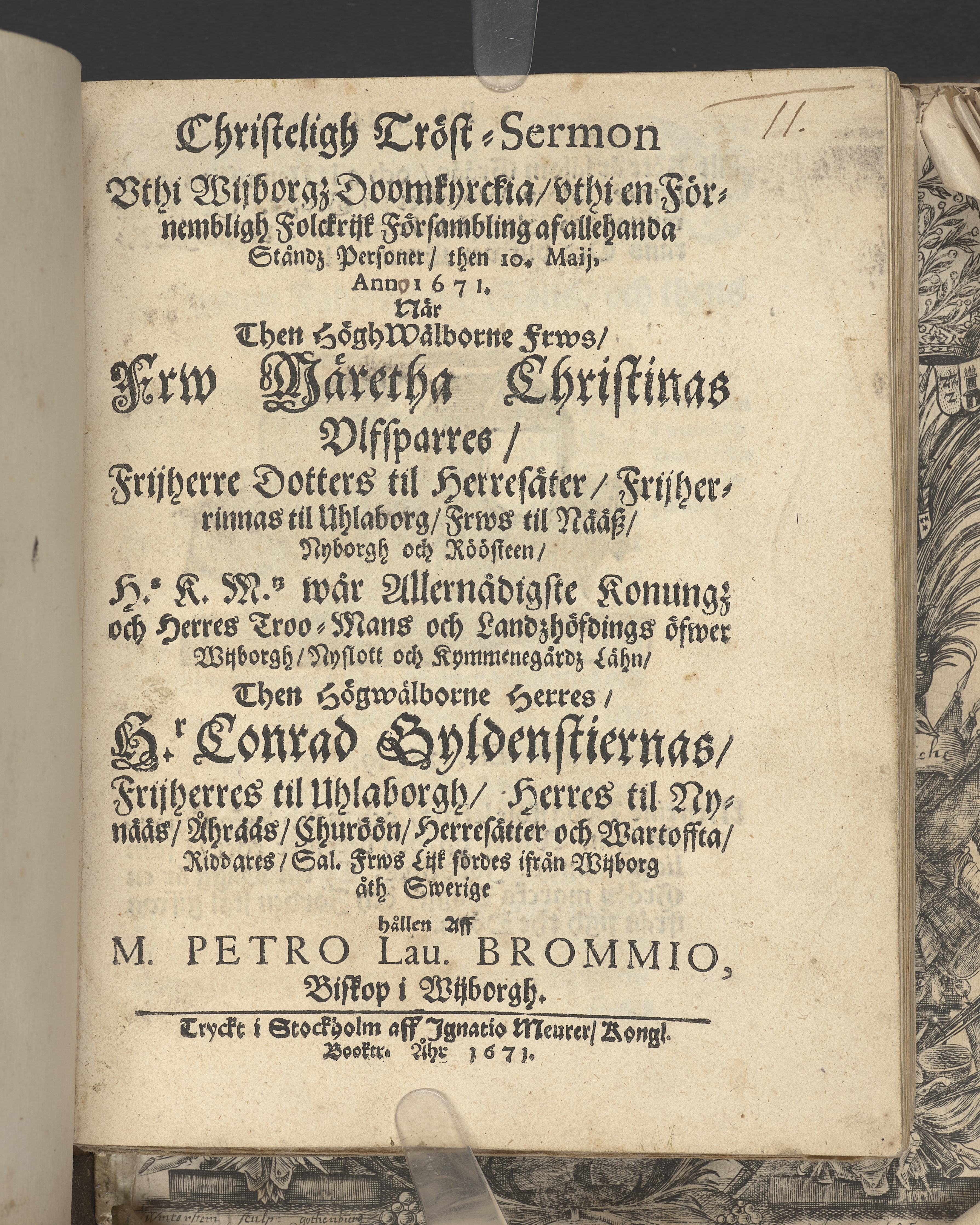 Christeligh tröst-sermon vthi Wijborgz doomkyrckia ... then 10. maij, anno 1671, när then höghwälborne frws, Frw Märetha Christinas Vlffsparres, frijherre dotters til Herresäter ... Hr. Conrad Gyldenstiernas, frijherres till Uhlaborgh ... frws lijk fördes ifrån Wijborg åth Swerige hållen aff M. Petro Lau. Brommio, biskop i Wijborgh. Tryckt i Stockholm aff Ignatio Meurer, kongl. booktr. åhr 1671.