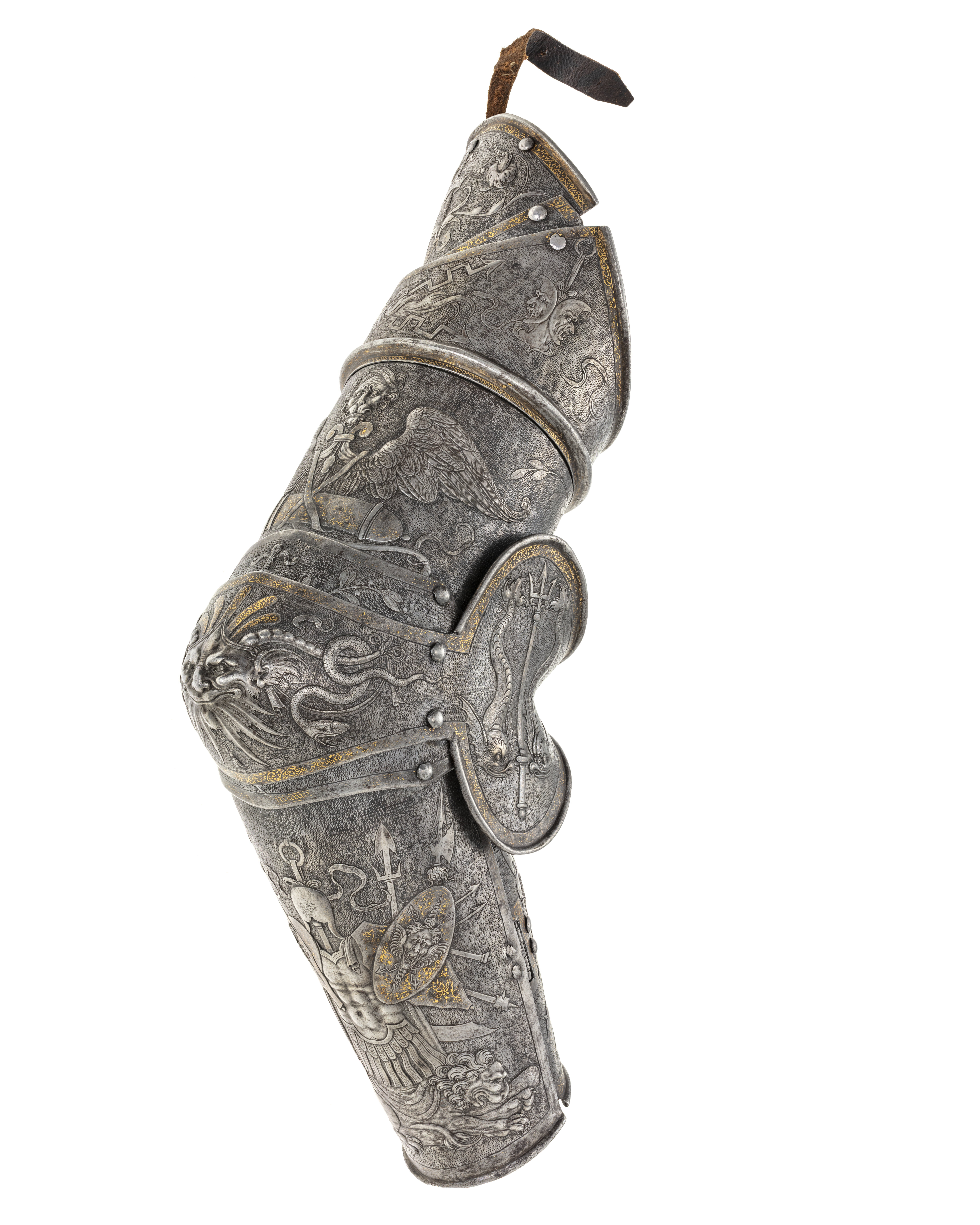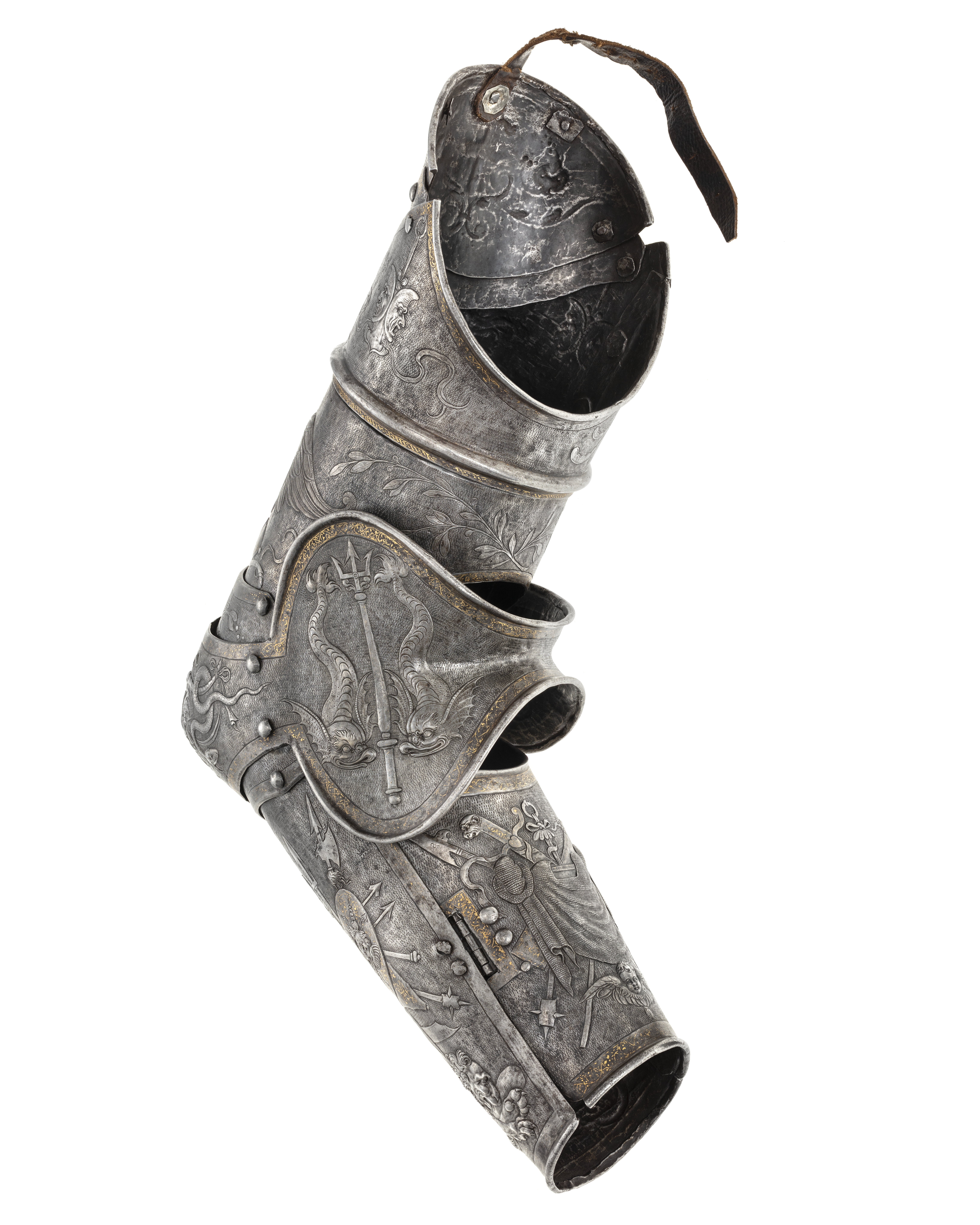 Armen består av flera delar. Den översta täcker överärmen och sträcker sig högt upp under axelpansarets lameller. Överärmen verkar sitta ihop medan delen nedanför armbågen är ledad med gångjärn och kan öppnas. Armbågens buckla är i tre delar. Samtliga ytor rikt dekorerade som andra delar till rustningen.