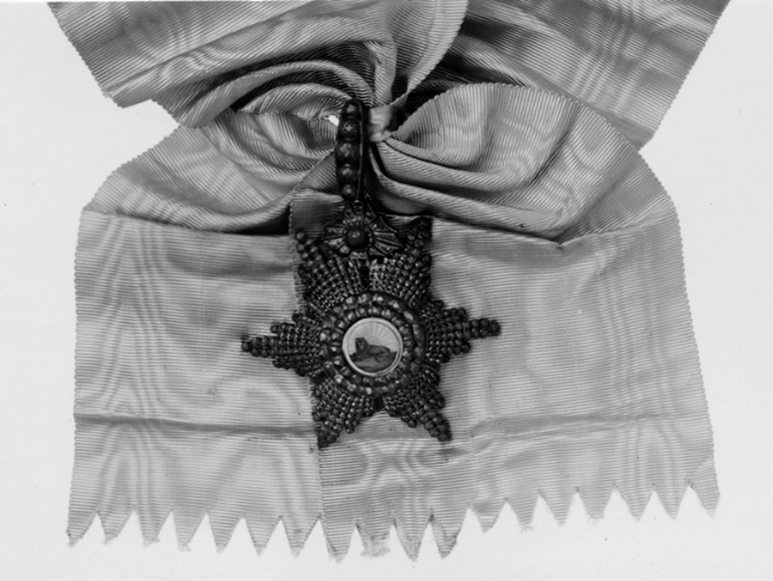 Sexuddig, flinkerad strålstärna av flinkerat silver, varje udd består av tio rader fasetterade pärlor, mellan varje udd en grönemaljerad stråle. Guldkantad medaljong av guld täckt med klar emalj, sol, därpå målat ett brunt lejon liggandepå grön mark. Runtom två ringar av fasetterade silverpärlor. Mellan de två övre strålarna en bygel, däri fäst oregelbunden sol av silver med stor fasetterad pärla i mitten, omgiven av 12 oregelbundna strålar med fasetterade pärlor, släta kanter, upptill ring, däri fäst bandbygel, dekorerad på framsidan med fem fasetterade pärlor. Baksidan förgylld, på medaljongens baksida stämplat: oval med A.P. samt oval med 84, manshuvud med band om pannan samt L.