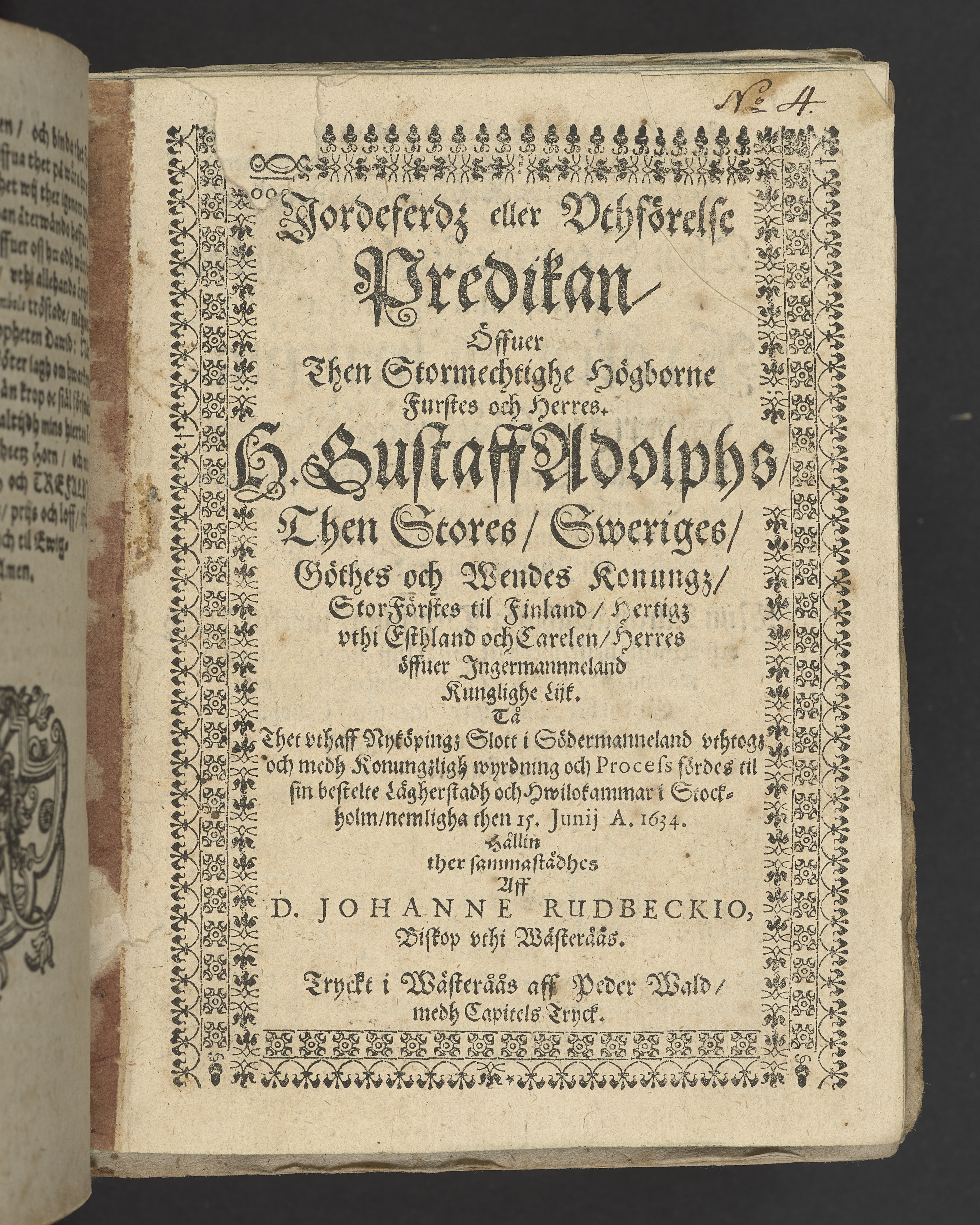 Jordeferdz eller vthförelse predikan, öffuer ... H. Gustaff Adolphs then Stores ... kunglighe lijk. Tå thet vthaff Nyköpingz slott i Södermanneland vthtogz och medh konungzligh wyrdning och process fördes til sin bestelte lägherstadh och hwilokammar i Stockholm, nemligha then 15 junij a. 1634. Hållin ther sammastädhes aff D. Johanne Rudbeckio, biskop vthi Wästeråås. Tryckt i Wästeråås aff Peder Wald, medh Capitels tryck.
