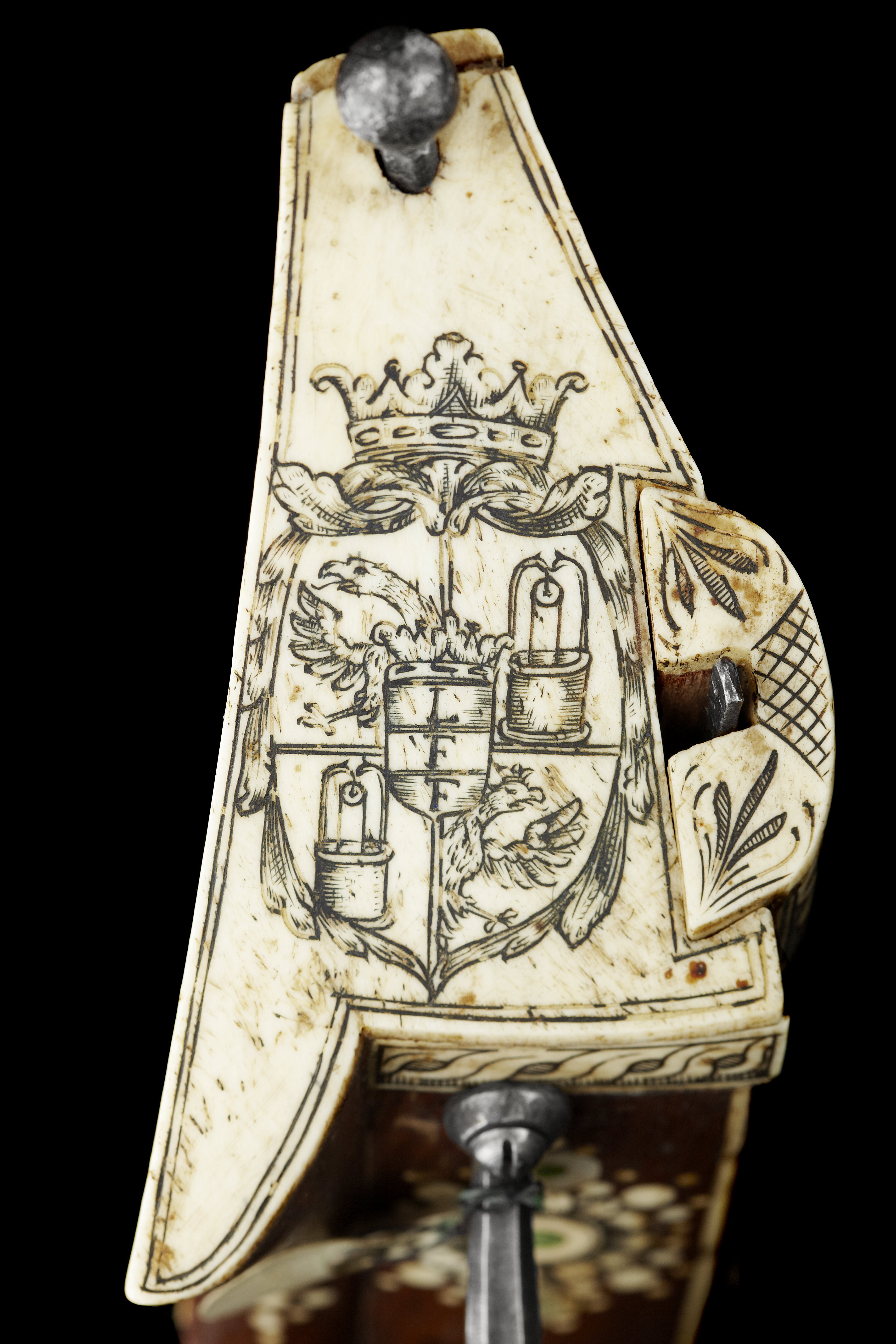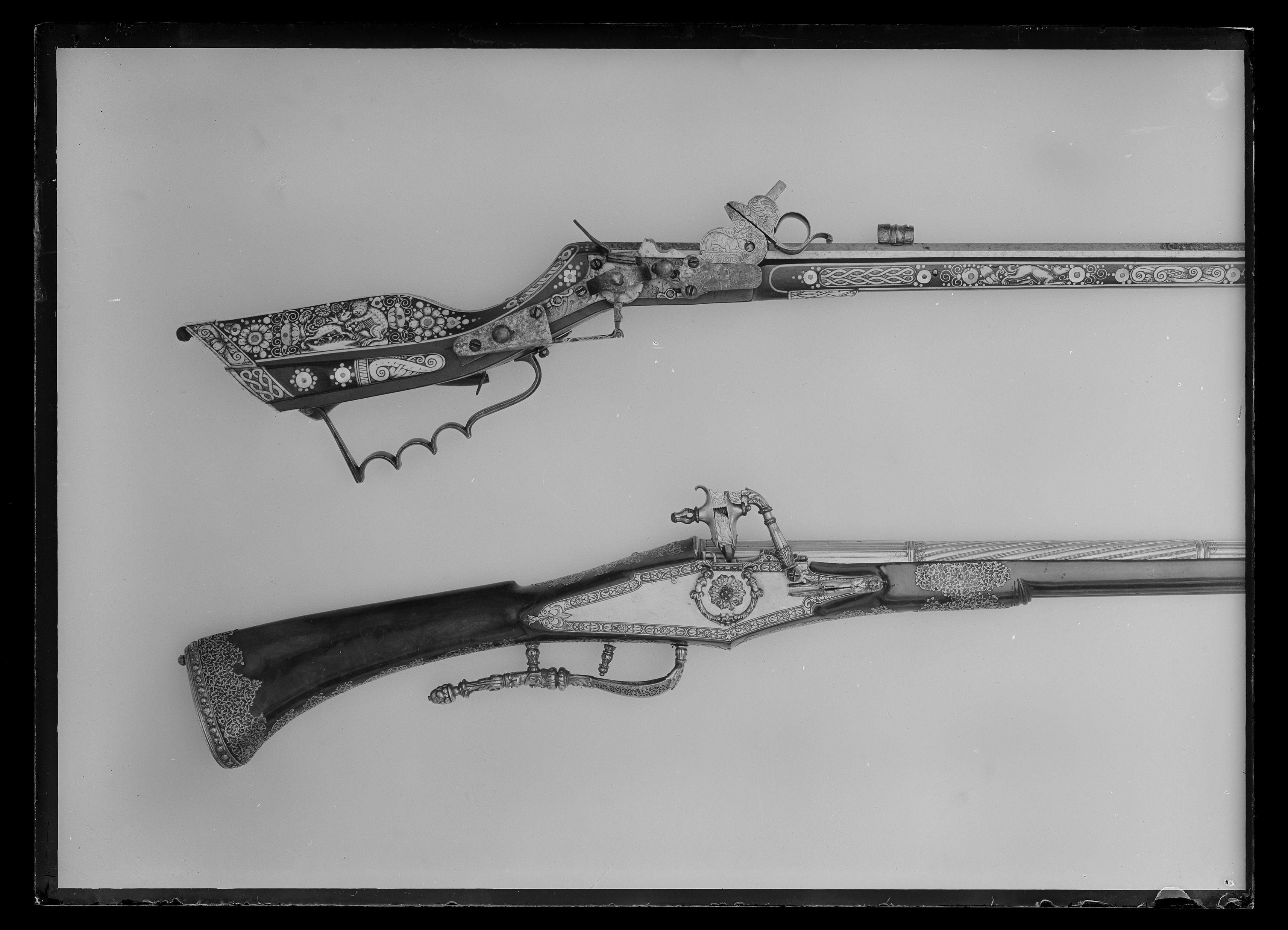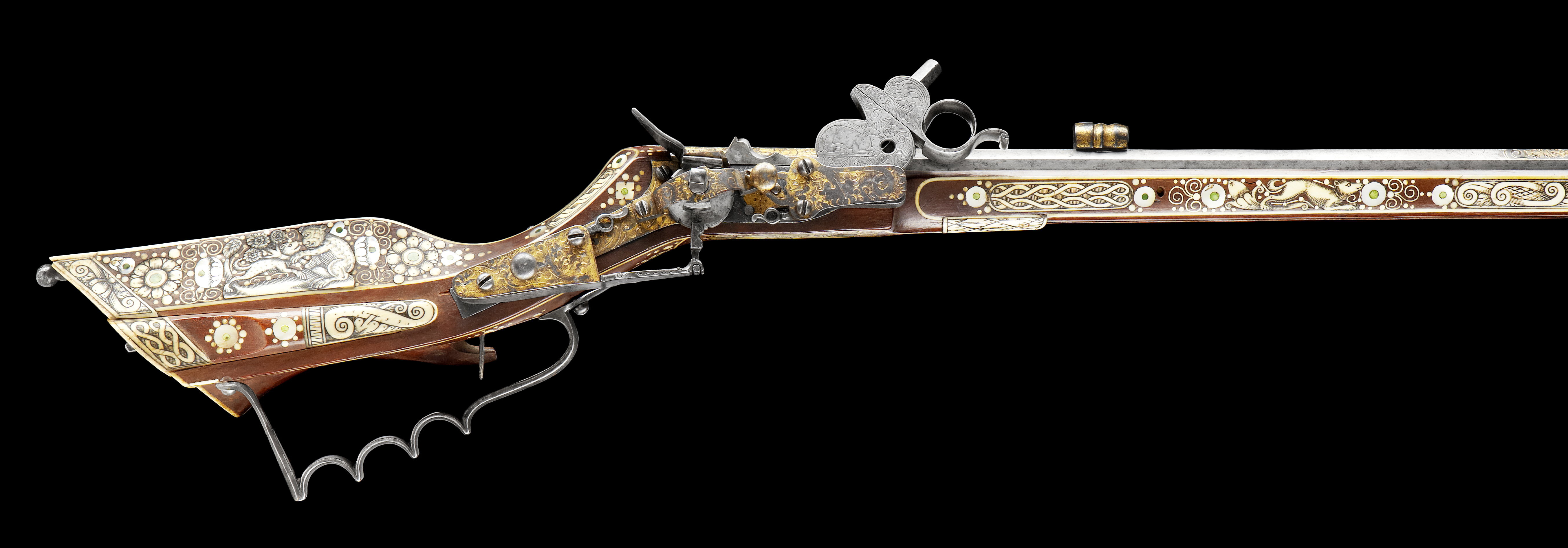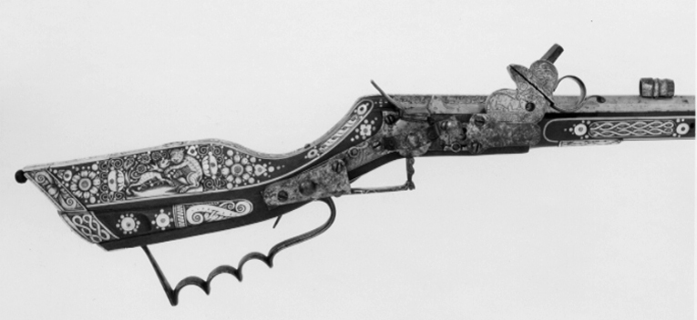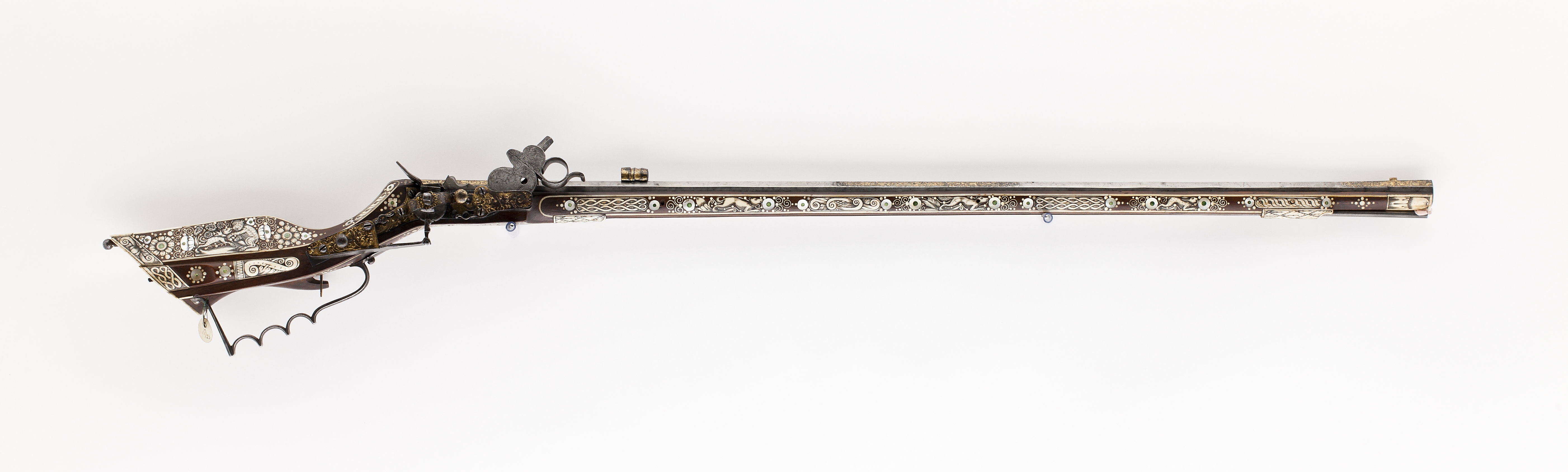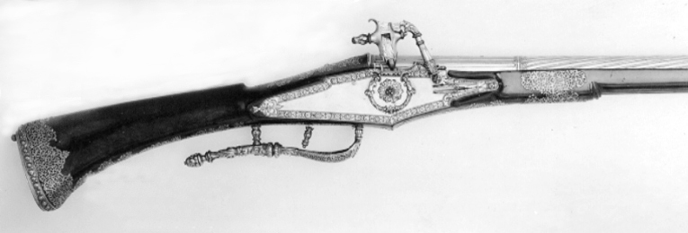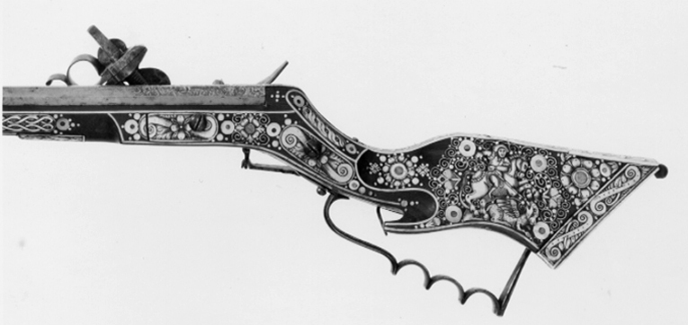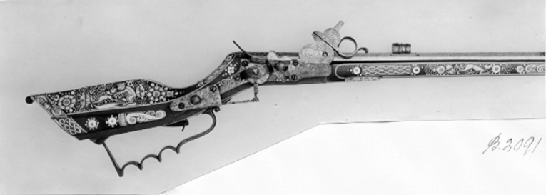 Åttsidig, urspr. blånerad, räfflad pipa, sex räfflor, räffelbredd 1,3 mm, bombredd 4,4 mm. Pipan förstärkt vid mynningen. Punsad slingdekor i tre förgyllt fält, förgyllningen sliten och den blå färgen lyser igenom. Vid svansskruvbladet stämplat: F P. Svansskruvbladet blånerat och förgyllt. Riktmedel: Blånerat och förgyllt rörsikte, solsikte av stål, förgyllt stolpkorn av mässing. Fästning: Pipan fäst med krysskruv underifrån satm ett halvt (urspr.tre) pipstift av ben. Hjullås av teschitztyp, blånerat och förgyllt låsbleck med punsad dekor. Hane med stor skärm mellan underkäke och hankropp, därpå graverat en hjort, i övrigt rankdekor. Lös överkäke med fingergrepp omböjt till ring. Hjulbrygga samt bleck över slag-och hanfjäder av blånerat och förgyllt stål, punsad dekor. Fängpannelock med rörlig arm, triangulär, blånerad och förgylld skärm. Två tryckknappar med välvda, blånerade och förgyllda huvuden. Fästning och avtryckare: Två låsskruvar. Förgylld avtryckare. Helstock av teschitz-typ, rikt dekorerad med inläggningar av ben, pärlemor och grönt horn. På anslaget S:t Göran och draken,på kolvens motsatta sida en björn som slår en hund överryggen med ett träd. På kolvens undersida ett lejon, på framstocken två hundar, två rävar, två harar, i övrigt blomsterslingor samt brickor av ben med geometrisk dekor. Bakplåt av ben, därpå graverat vapen för friherrliga ätten Putz von Adlersthurm, Niederösterreich (Siebmacher NÖ I, sid. 368, Johann Markus Putz von Adlersthurm, friherre 1680). Kolvlådelock av stockens trä med inläggningar. Ovalt avtryckarbleck av horn. Blånerad varbygel av stål med tre fingerlägen. Två låsskruvbrickor av ben, den främre sprucken. Två rörkor samt näsband av ben med graverad dekor. Tillbehör: Laddstock av stål, l: 929 mm.