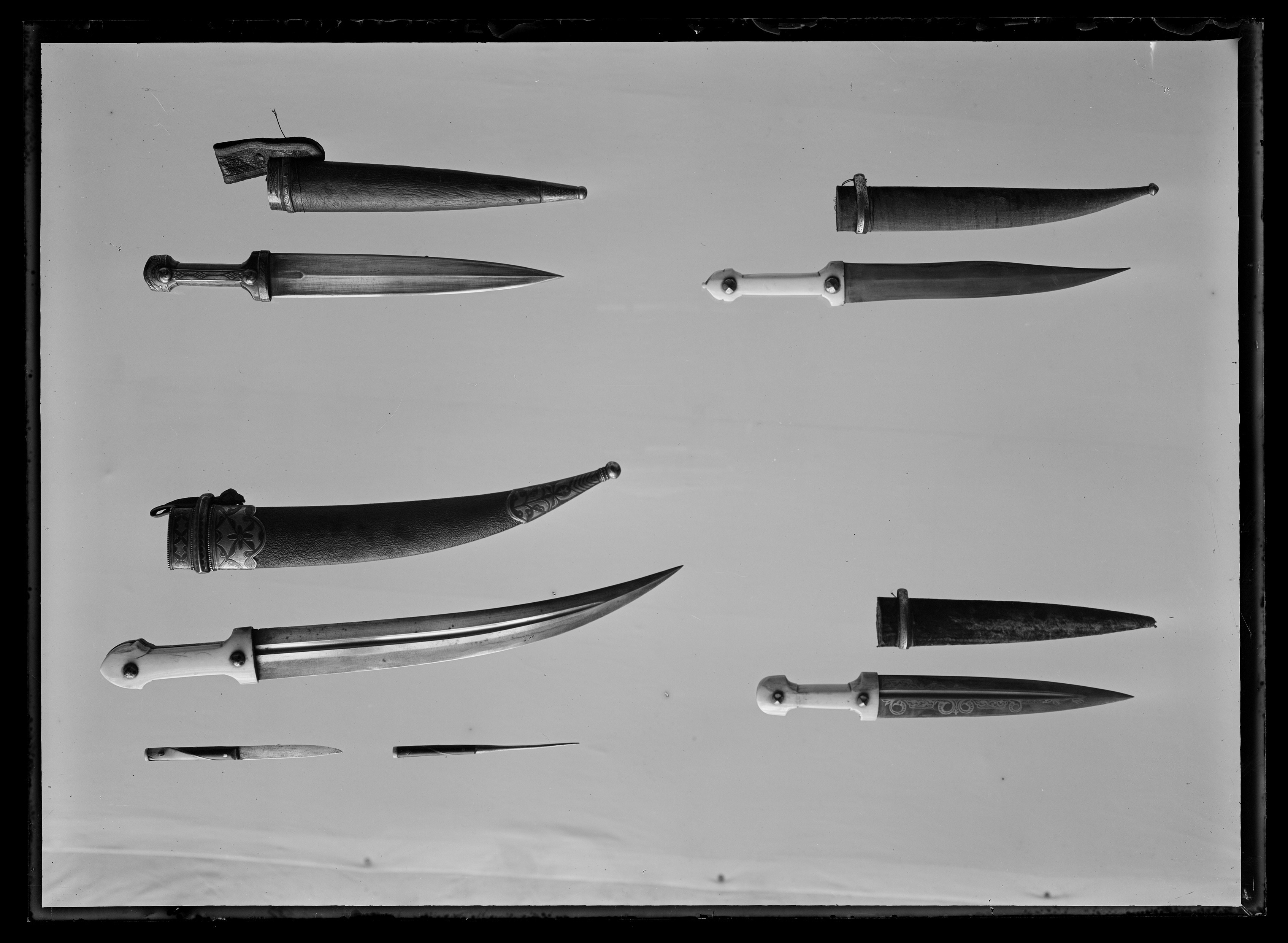 Fäste upptill framåtböjt klätt med två plattor av gråbrunt horn fästa med två välvda nitare, genomgående hål för handrem med droppformigt beslag av mässing. Runtom på fram och baksidan skena av förgyllt silver med graverad och punsad bladbård. Raka parerstänger av förgylld mässing med runt tvärsnitt med dekor av ciselerade blad och ändknoppar i form av druvklasar med vinlöv. Raka styrskenor med hopslingrade ormar i ciselerad relief. På krysset medusahuvud (?) med svallande hår. Klinga av damaskerat stål 38 mm bred, böjd eneggad med ett 135 mm långt tvåeggat spetsparti på utsidan turkisk (eller arabisk) inskrift i relief med påslagen koppar. MN prot. 1867-11-19. Gåva av numismatikern herr Per Magnus i Berlin. Gåvan överlämnad genom svensk-norska ministern CJA Sandström.